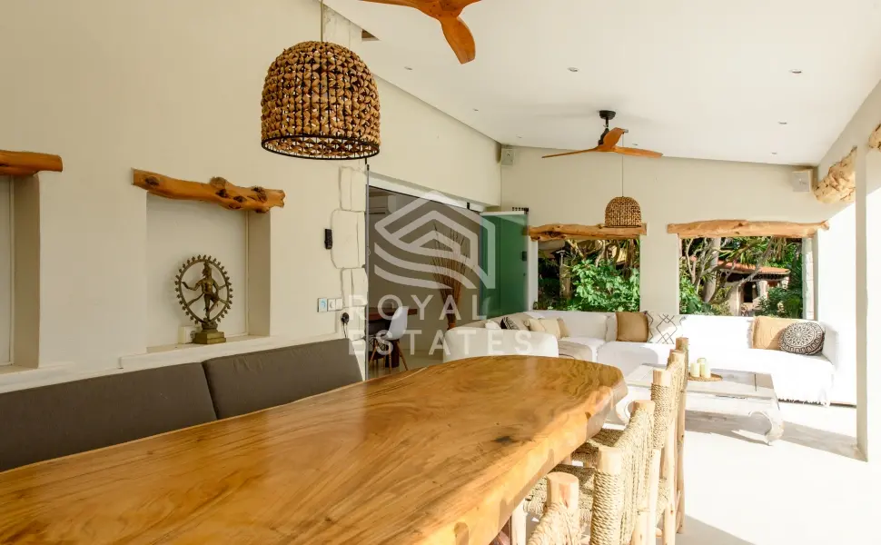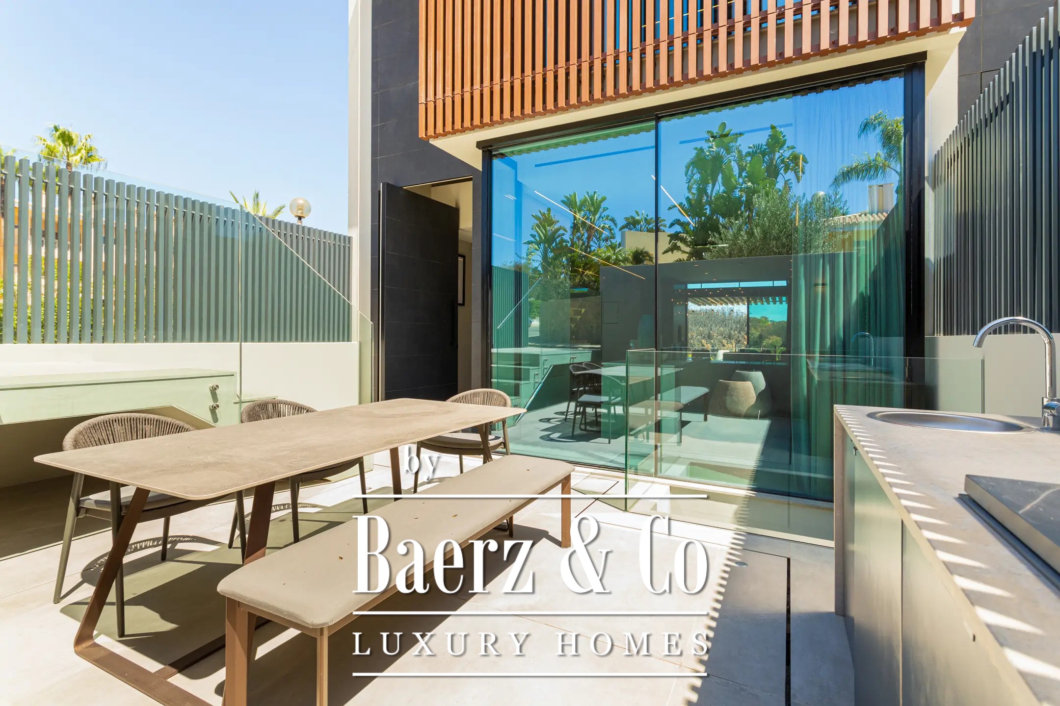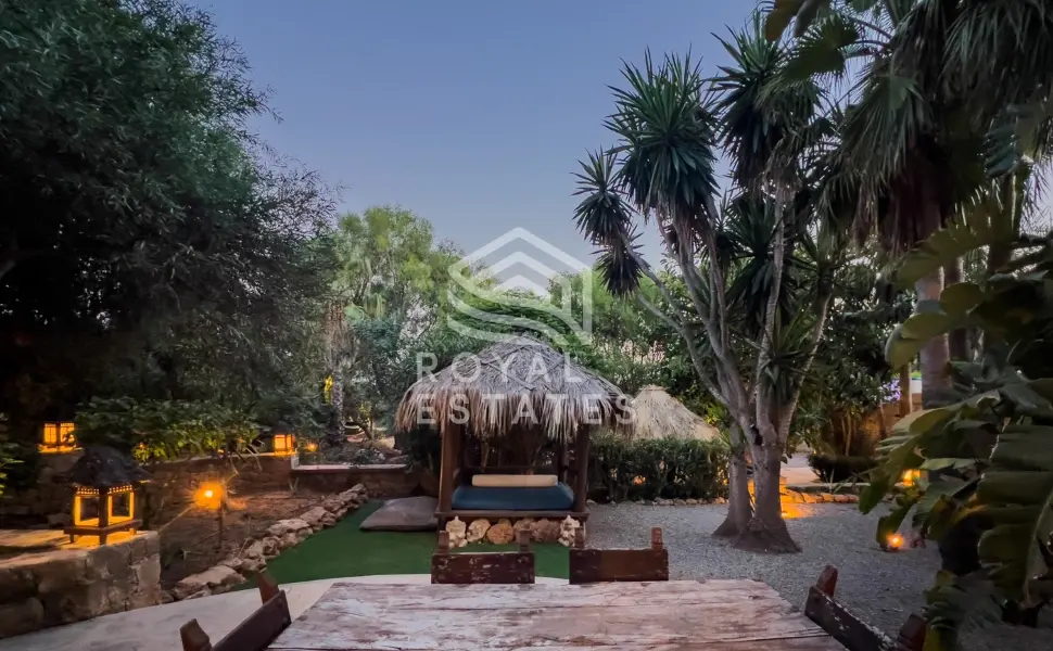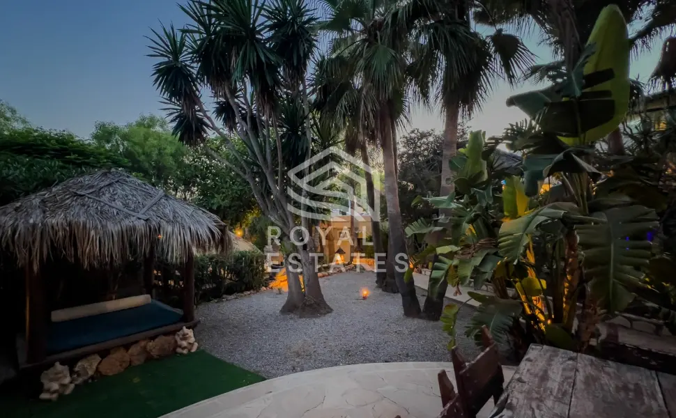De tuin ademt de sfeer van een privéresort, omlijst door volwassen palmen, groen en panoramisch zeezicht. Een yogaplatform van 11 x 7 meter en een volledig uitgeruste buitenkeuken met barbecue bieden mogelijkheden voor verfijnd buiten dineren. De ondergrondse nachtclub biedt plaats aan maximaal 70 gasten en beschikt over een DJ-booth en bar, als bevestiging van het gastvrije karakter van het landgoed.