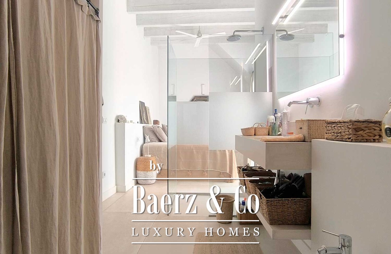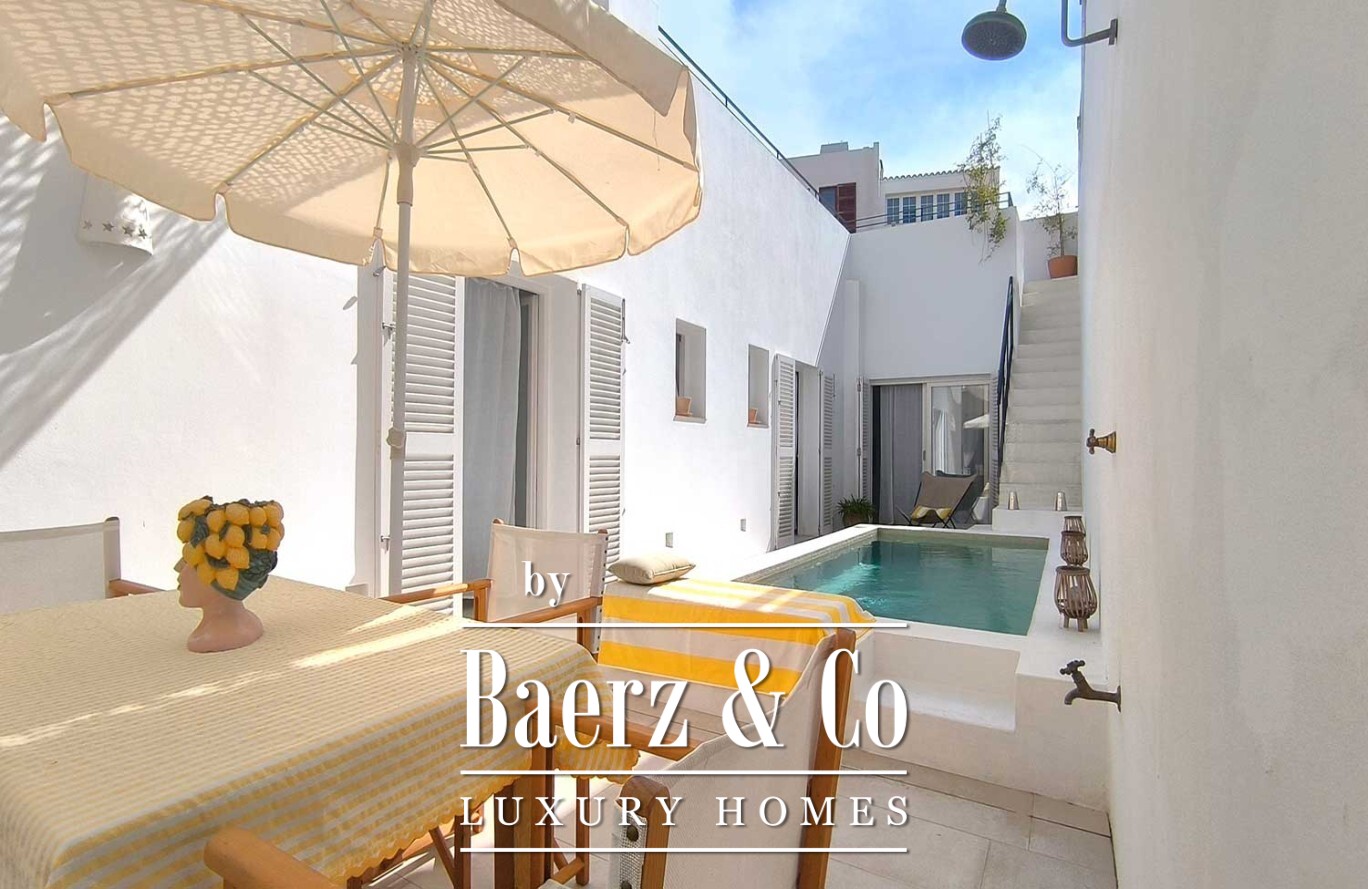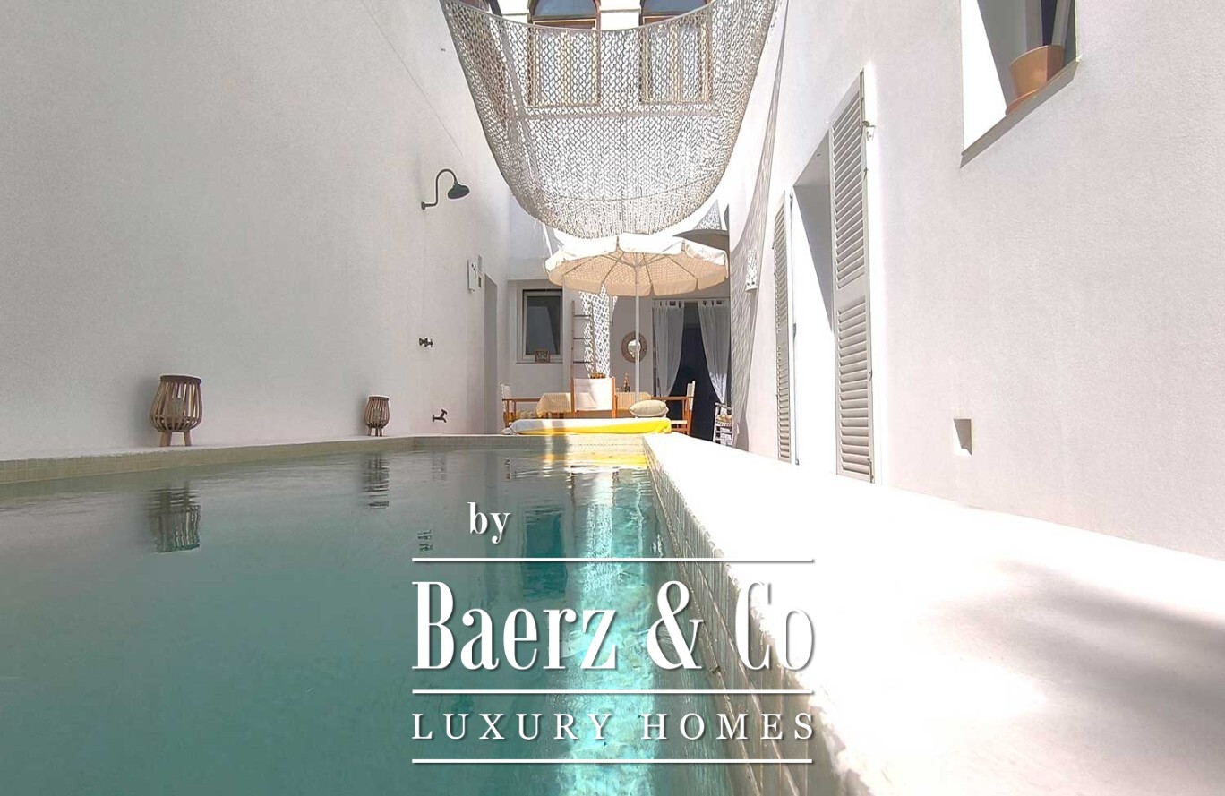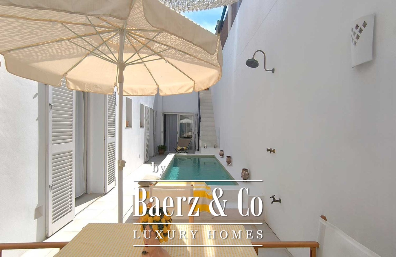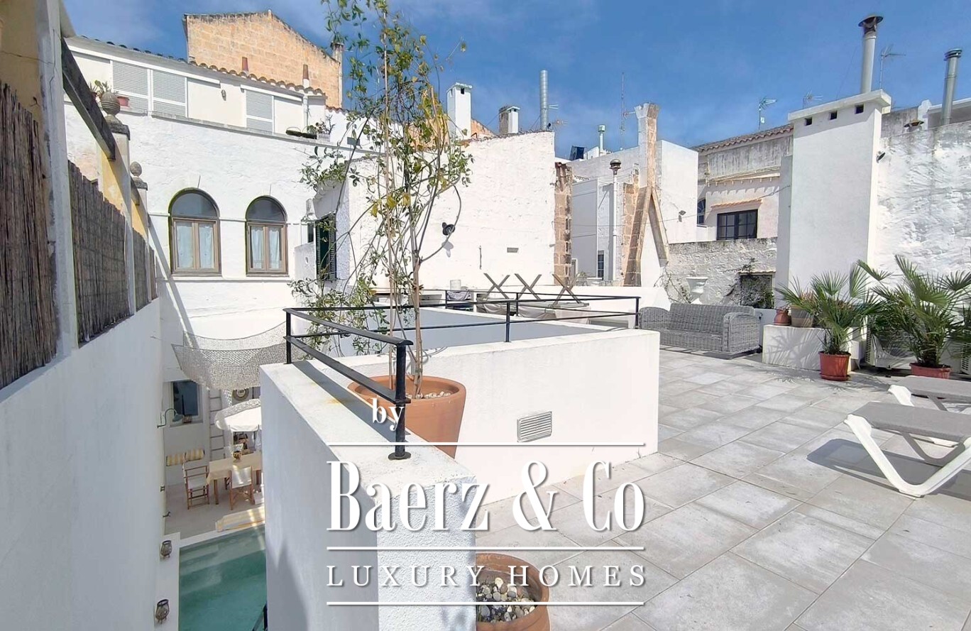 Een gang leidt naar het slaapgedeelte, waar drie slaapkamers elk zijn voorzien van een en-suite badkamer en directe toegang tot buiten, waardoor privacy en een voortdurende lichtinval gewaarborgd zijn. In het hart van de woning bevindt zich een privépatio met een onverwacht privézwembad—een waar voorrecht in het oude centrum. Vanaf hier nodigt een dakterras met ingebouwde zitbank en buitenkeuken-barbecue uit tot gedeelde momenten die blijven hangen.