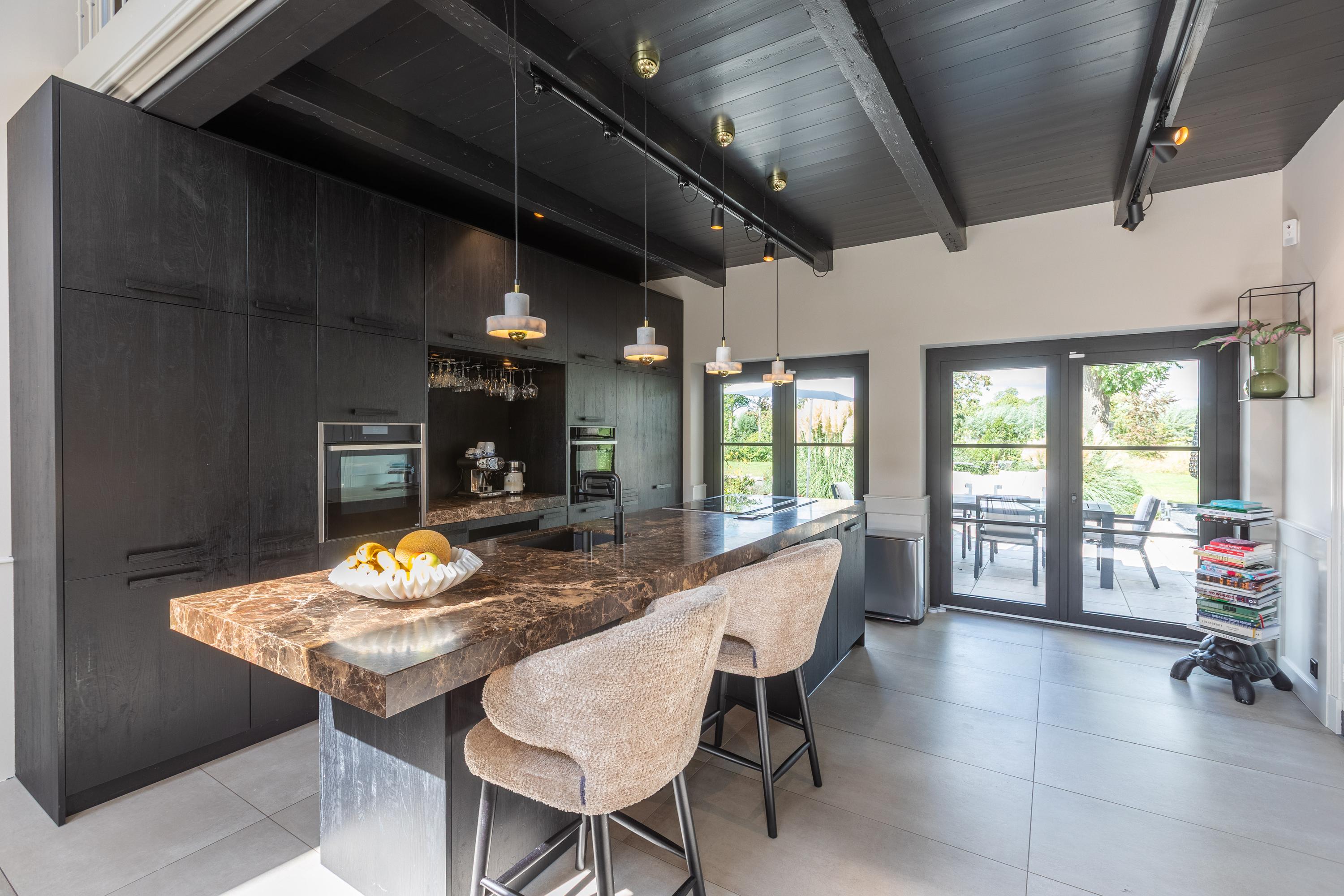 - Woonkeuken met marmeren kookeiland en entresol;