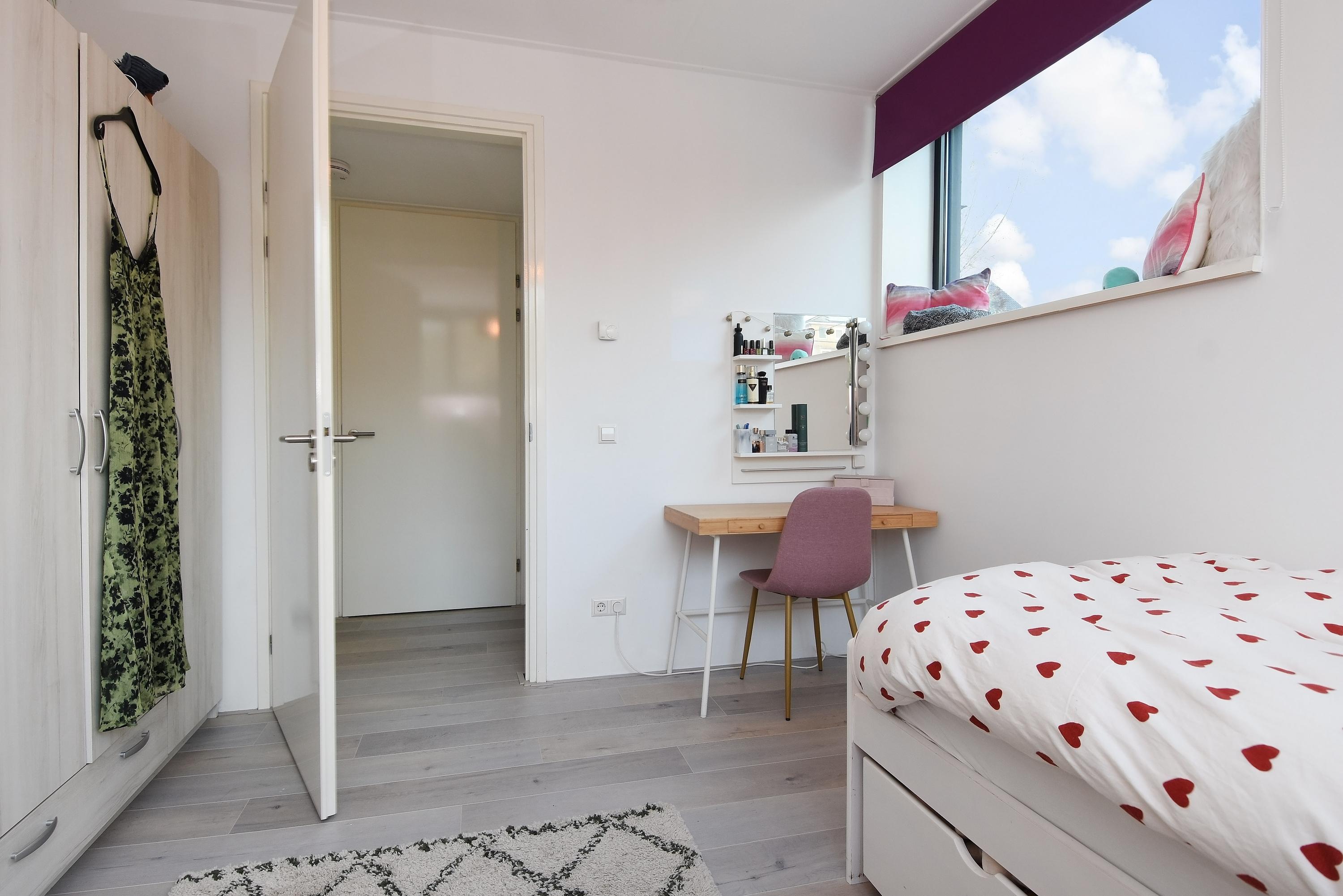 Vanuit de woonkeuken kom je via een vaste trap naar boven op de vide, die je voor meerdere doeleinden (o.a. werkplek, bibliotheek, tv-kamer) kunt gebruiken. De grote verrassing is het aansluitend gelegen, fraai aangelegde en royale dakterras met veel privacy en gezelligheid, waar je werkelijk de gehele dag de zon kunt vinden.