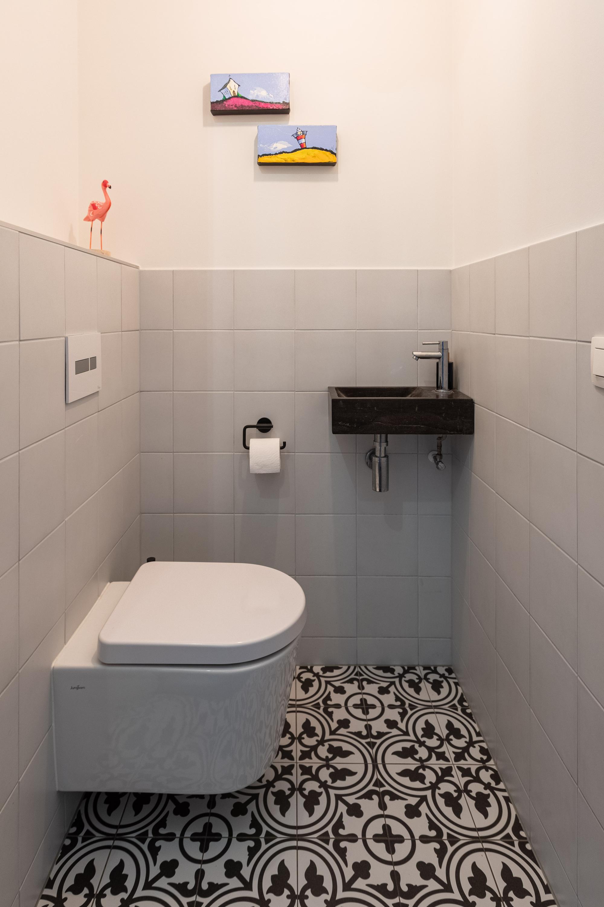 Entree van de woning met hal, meterkast, een praktische inloopkast en een luxe toiletruimte met wandcloset en fonteintje.
