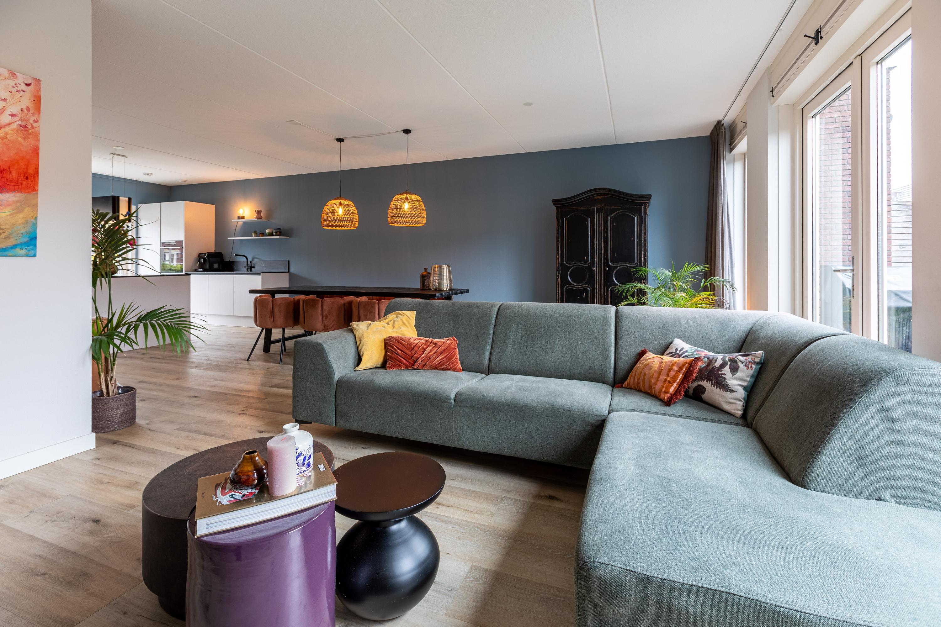 Via een stijlvolle glazen industriële deur kom je in de lichte woonkamer. Aan de voorzijde bevindt zich de ruime open keuken met een kookeiland en diverse inbouwapparatuur. Door de schuifpui heb je direct toegang tot het terras in de voortuin – een heerlijke plek voor een kop koffie of drankje in de zon.