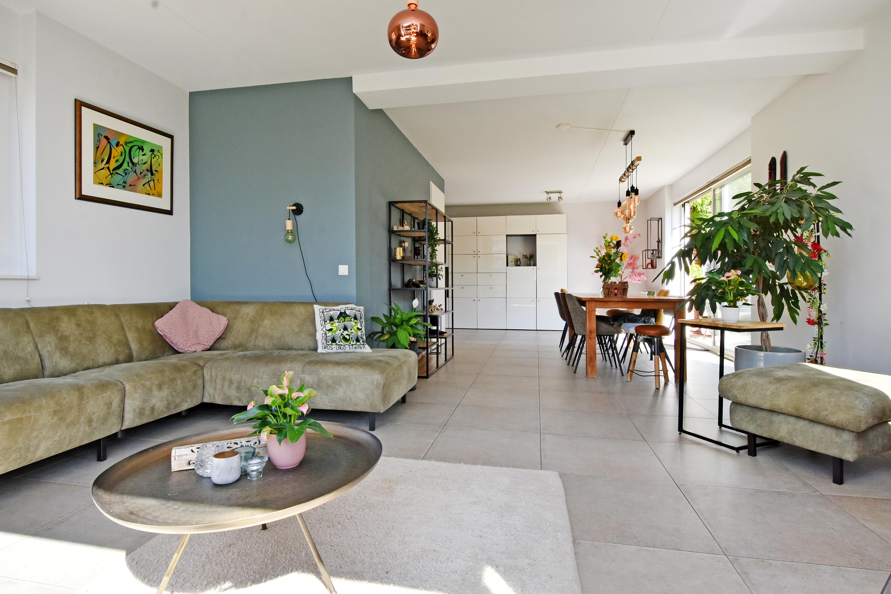 Vanuit de ruime hal kom je de sfeervolle, lichte living binnen. Deze vormt door de grote schuifpui een prachtige verbinding met de zonnige tuin. De tuin is recent fraai aangelegd en voorzien van veel groen, een gazon een zonnig terras, een veranda en overkapping: een heerlijke plek om het hele jaar door te genieten en relaxen. De tuin grenst aan het water.