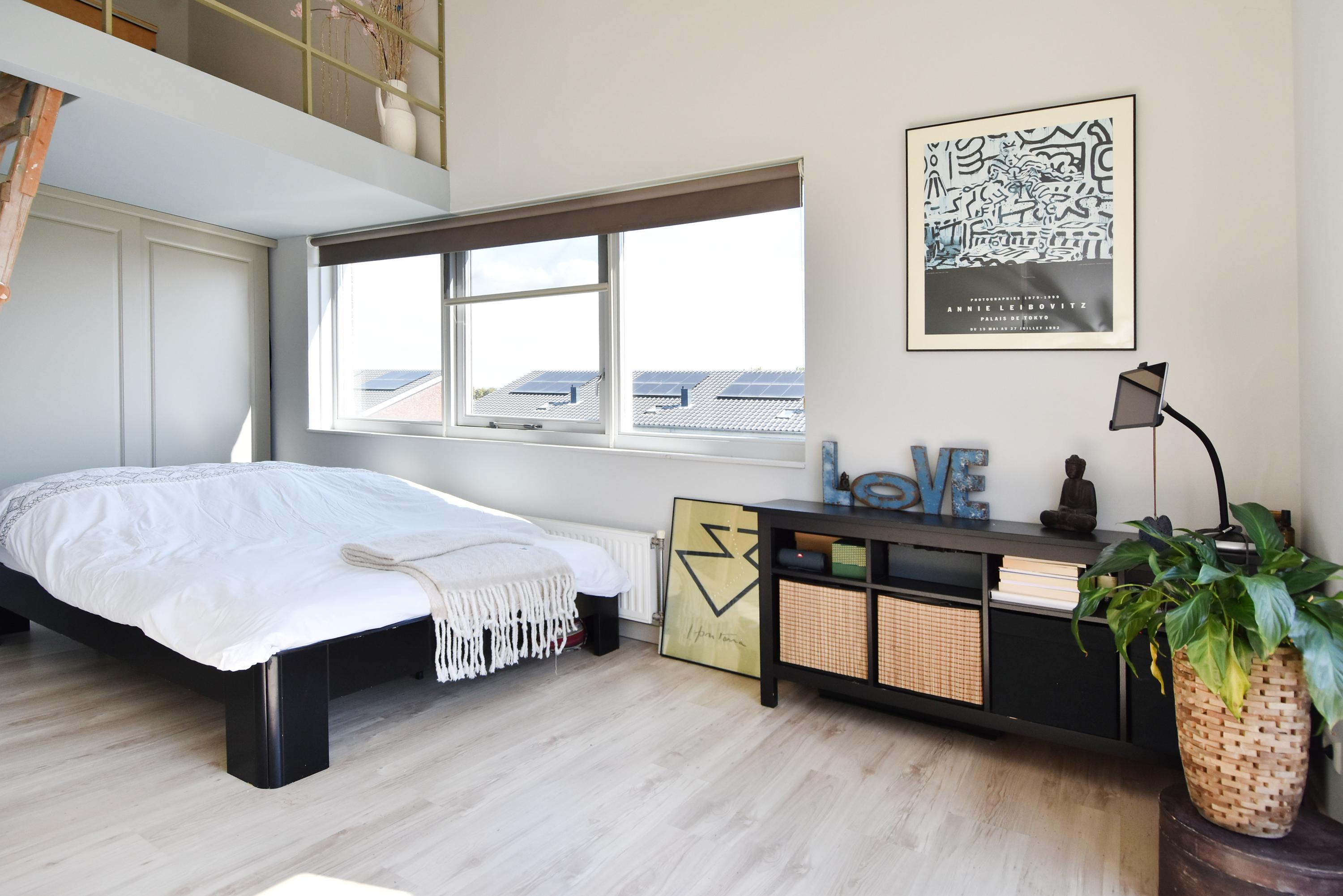 De derde slaapkamer/studio (thans ouderslaapkamer) die toegang biedt tot het terras heeft een speelse indeling met een bijzonder fraaie plafondhoogte van meer dan 4 meter (!) met een entresol en vide.