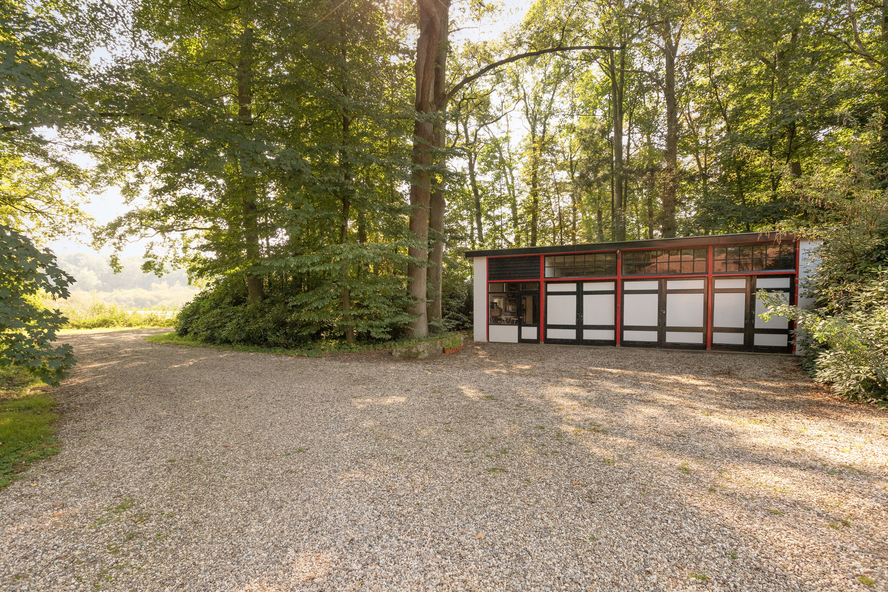 Aan de oostzijde van het ruime perceel is nog een zeer ruime garage met meerdere compartimenten aanwezig, waar tuinmachines en dergelijke kunnen worden gestald.