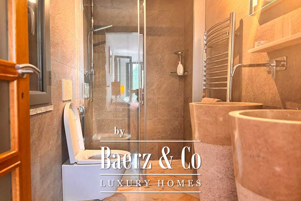 Het huis beslaat twee verdiepingen en beschikt over vier slaapkamers en vier badkamers. Drie slaapkamers op de begane grond openen via openslaande deuren naar een lager gelegen terras met uitzicht op de bergen. De master suite heeft een ruime badkamer met losstaand bad, aparte douche, dubbele marmeren wastafels en designafwerking, wat zorgt voor een sfeer van rust en privacy. De studeerkamer met eigen ingang biedt flexibele mogelijkheden voor gasten of werk. Boven grenst een woonkamer met balkenplafond en open haard aan een keuken van walnoothout en roestvrij staal, uitgerust met hoogwaardige Miele-apparatuur. Hoge glazen deuren leiden naar een lounge met tweede open haard en toegang tot terrassen met granieten tafels en Philippe Starck-stoelen.