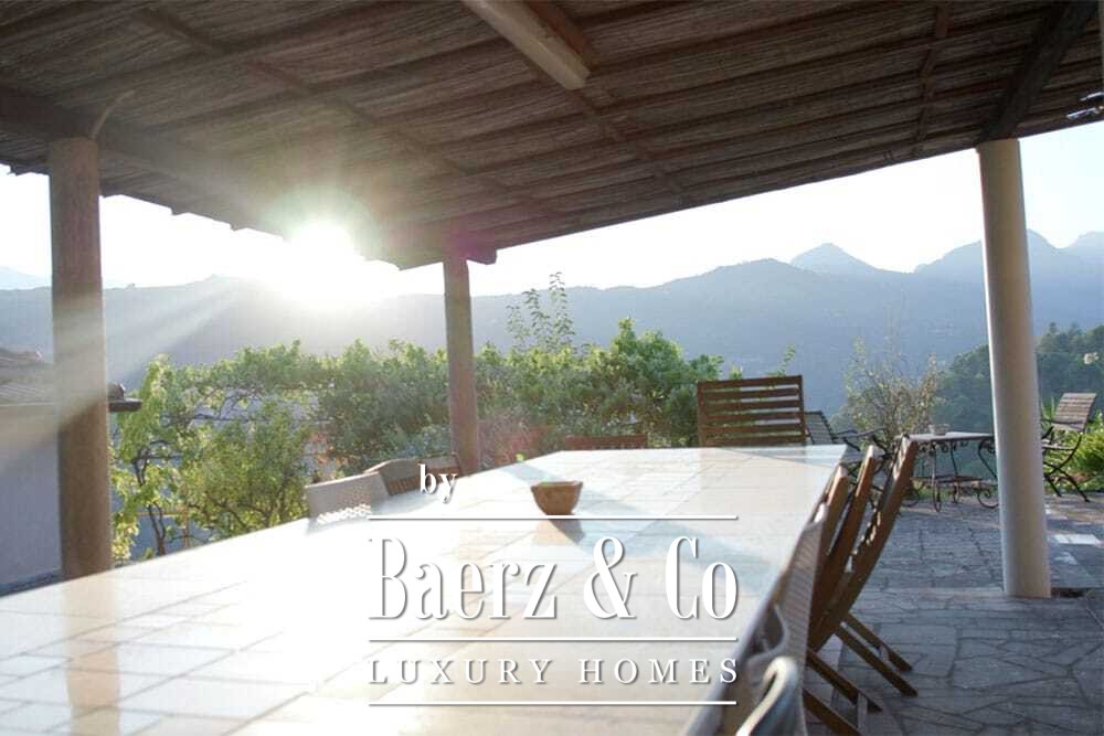 Het zwembad van 11 bij 4 meter, volledig gerenoveerd in 2022, ligt naast een royaal terras met uitzicht over de vallei en de zee. Diverse terrassen, buitenkeukens en schaduwrijke pergola’s nodigen uit tot ontspannen tafelen in alle seizoenen. Paden rondom de woning worden omzoomd door olijfgaarden, waar de vele zonuren zorgen voor een indrukwekkende oogst.
