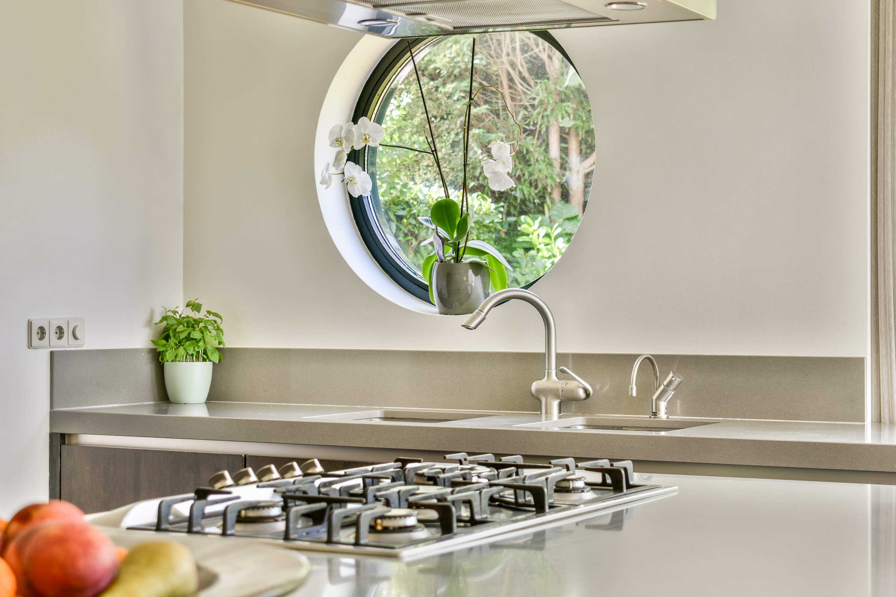 De luxe open keuken is voorzien van een groot werkblad annex eetbar, een dubbele spoelbak en diverse inbouwapparatuur, te weten: een Quooker, 5-pits gaskookplaat, afzuigkap, een combi-oven, een inbouw koffiemachine, vaatwasser, vriezer en koelkast. Ook vanuit de keuken is er een directe toegang tot het terras en de tuin.