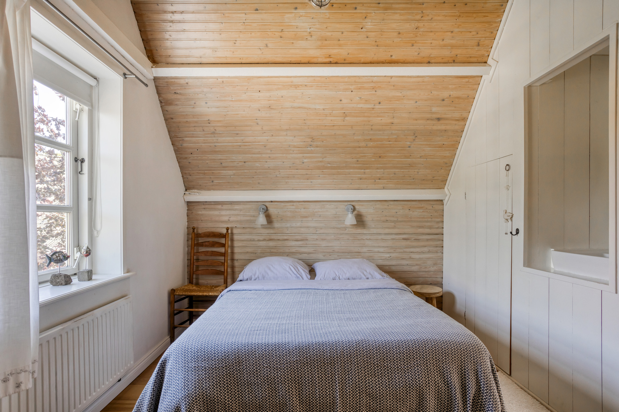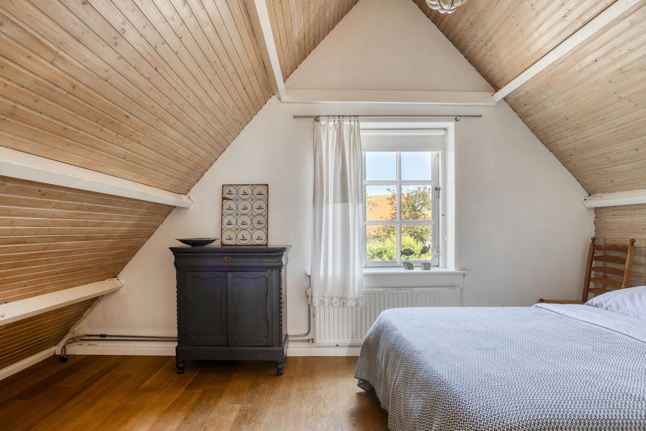 De eerste verdieping is verdeeld over het voorhuis en het achterhuis. In het voorhuis vind u twee ruime slaapkamers, elk voorzien van bergruimte achter de knieschotten. In het achterhuis leidt een brede trap naar een sfeervolle overloop, waar een charmante bedstee is ingebouwd, een unieke toevoeging dat kinderen zeker zal aanspreken. Vanuit hier bereikt u de royale master bedroom, voorzien van ingebouwde kastenwanden, een bergvliering en openslaande deuren naar een ruim dakterras met vrij uitzicht over het omringende landschap.