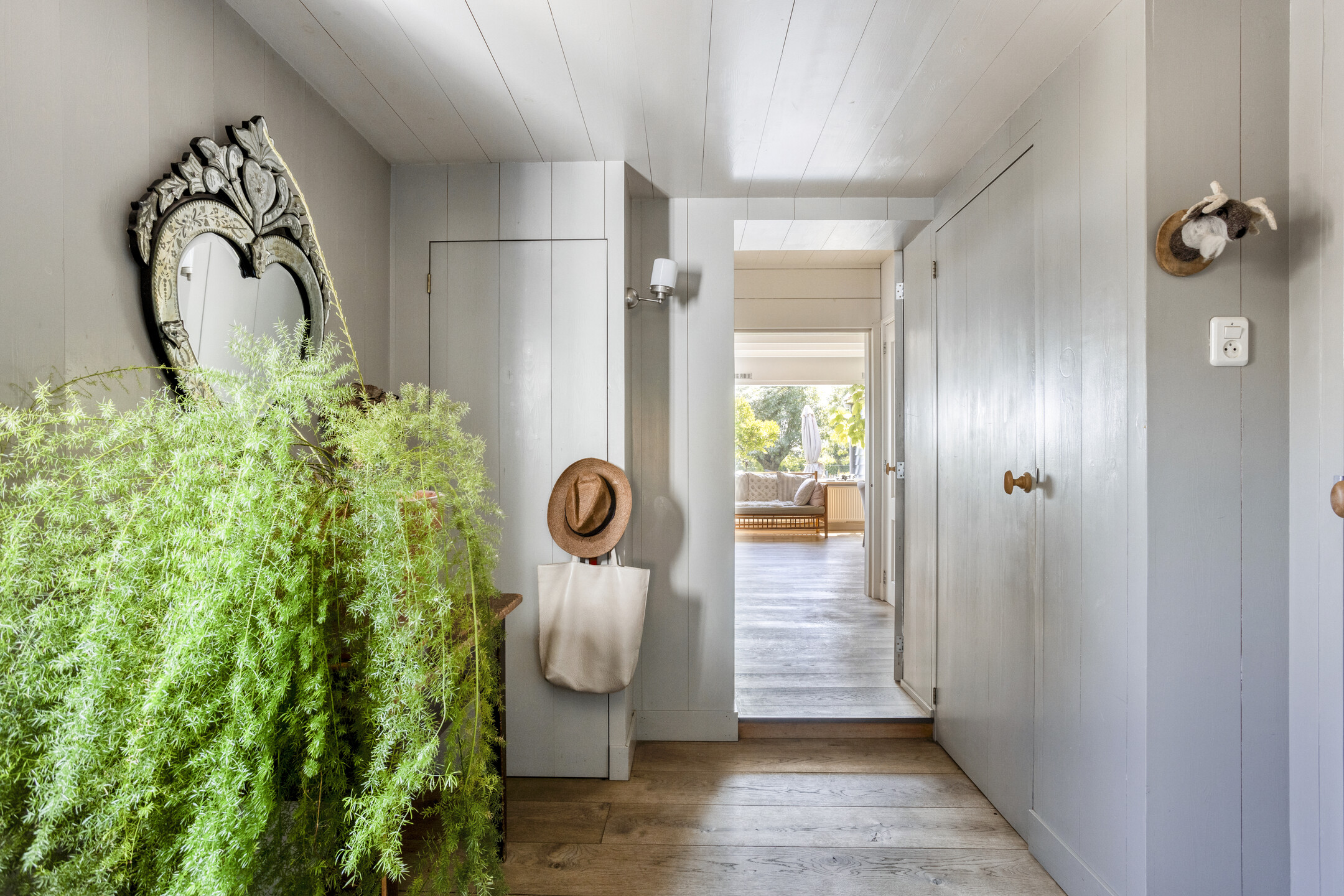 De overgang naar het achterhuis wordt gevormd door een ruime hal, die niet alleen een praktische verbindingsruimte is, maar ook beschikt over een douche en een toilet met fontein.