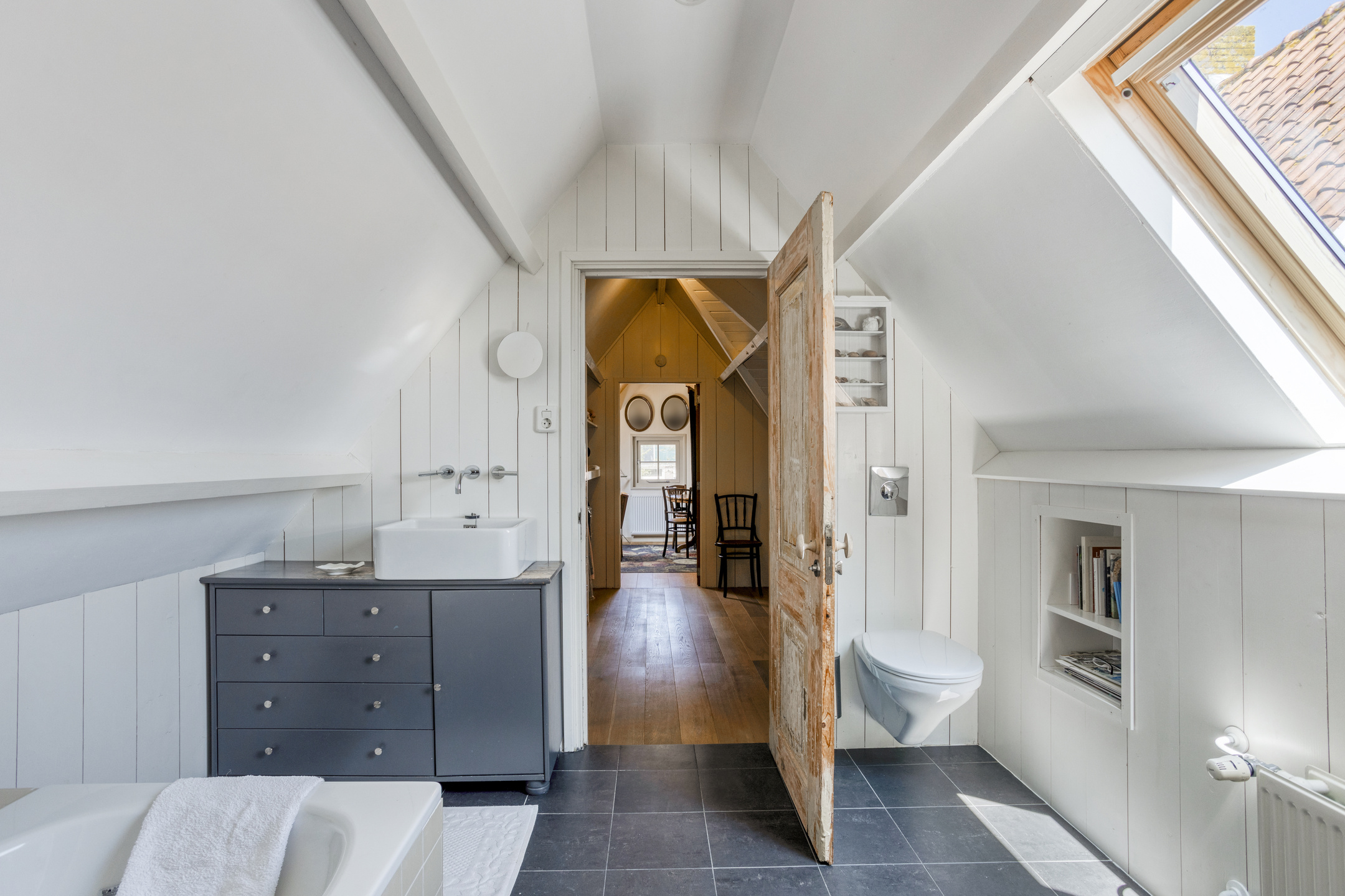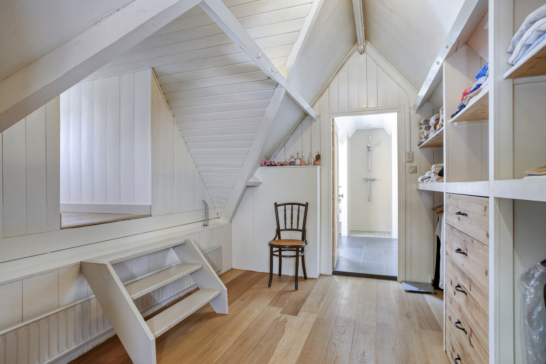 Een bijzonder element is de verborgen doorgang in de kastenwand, die leidt naar een ruime inloopkast. Aan de rechterzijde van deze ruimte bevindt zich een extra kamer, ideaal als kantoor, hobbyruimte of logeerkamer. Aan de linkerzijde ligt de badkamer, uitgerust met een ligbad, inloopdouche, wastafel, wastafelmeubel en een tweede toilet.