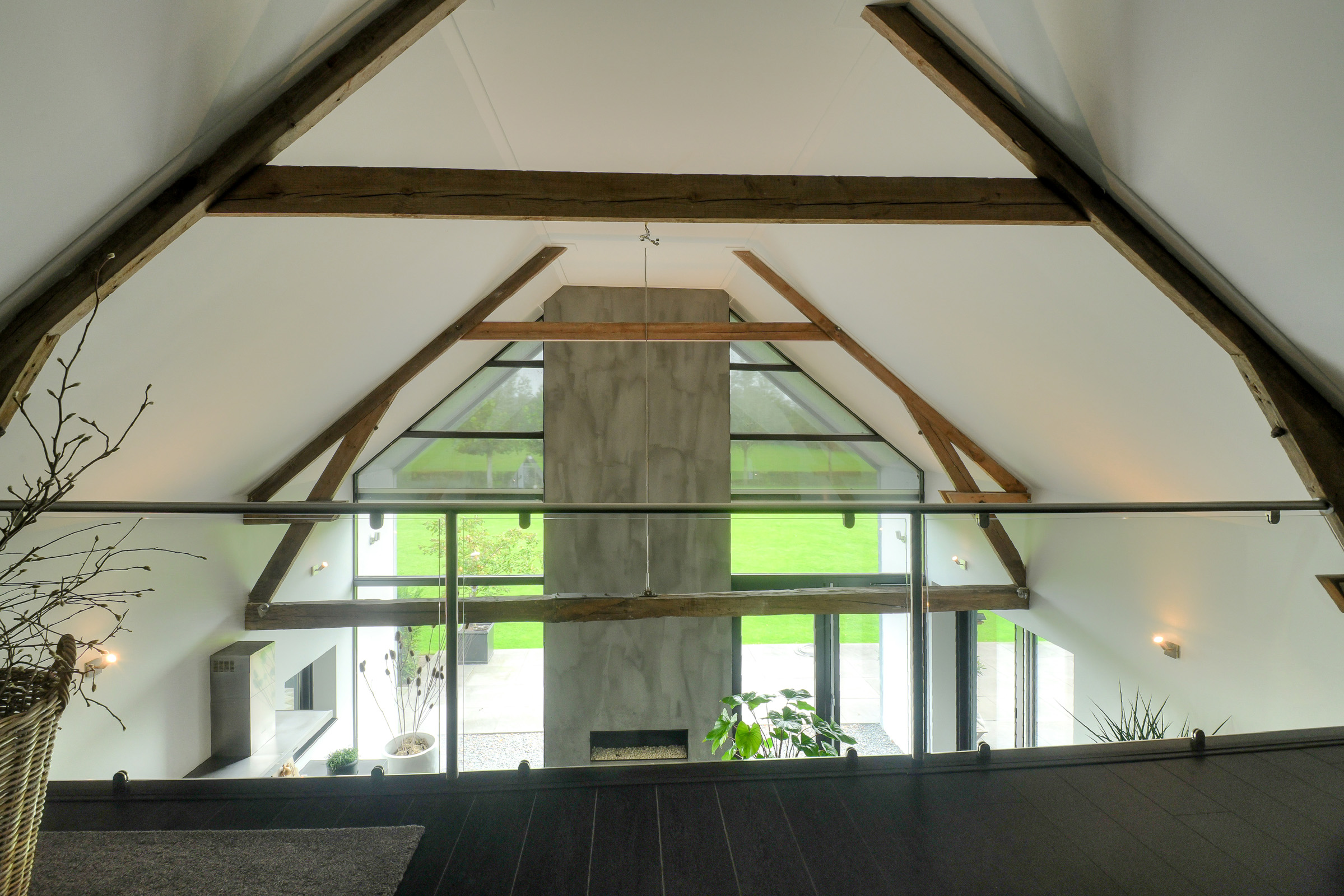 Een extra ruimtelijk effect wordt verkregen door de hoge kapconstructie die in het zicht gebleven is.