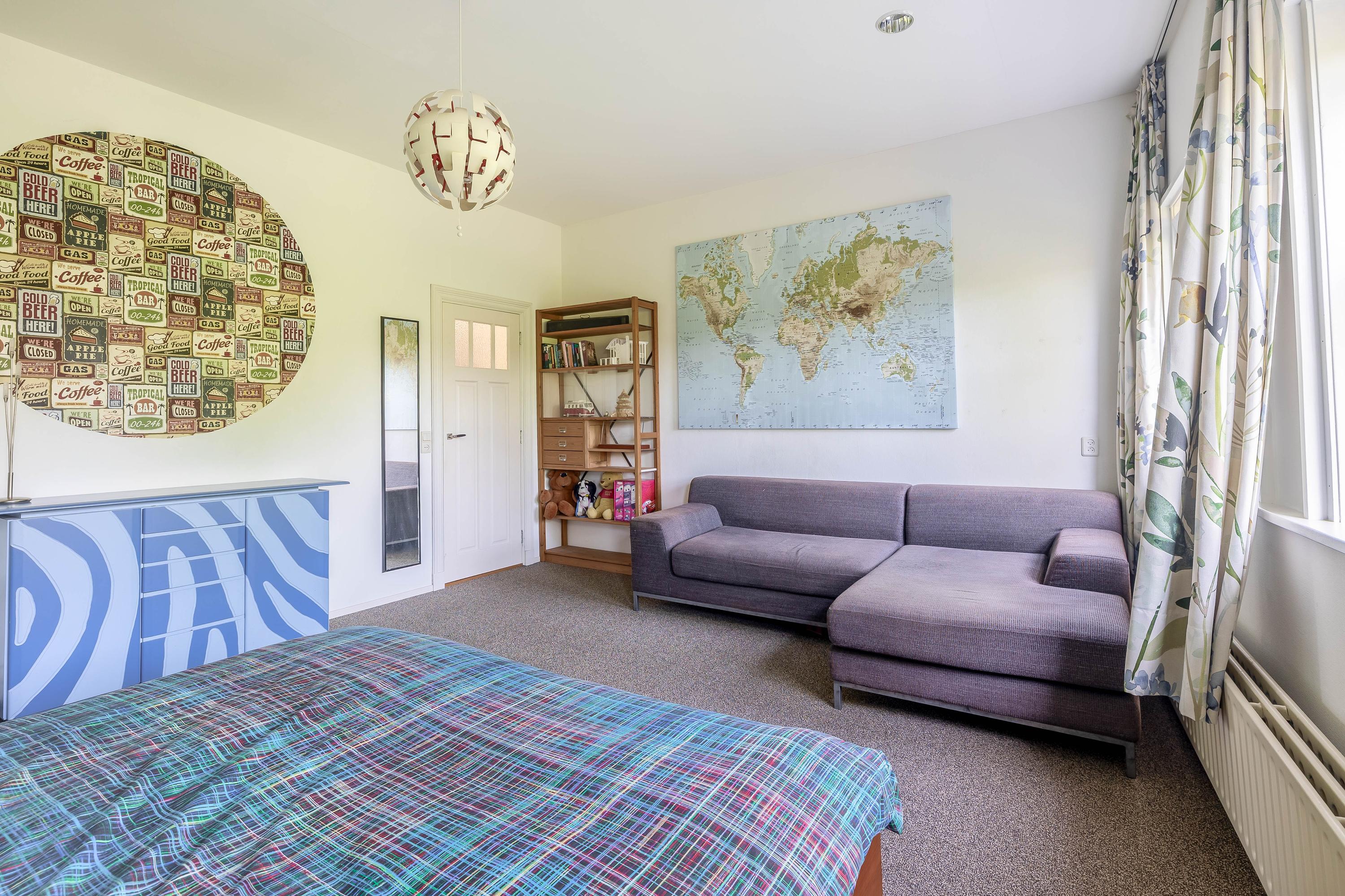 woonkamer met houten vloer, balkenplafond, HR houtkachel met buitenluchttoevoer, speelse verhoogde werkplek,
