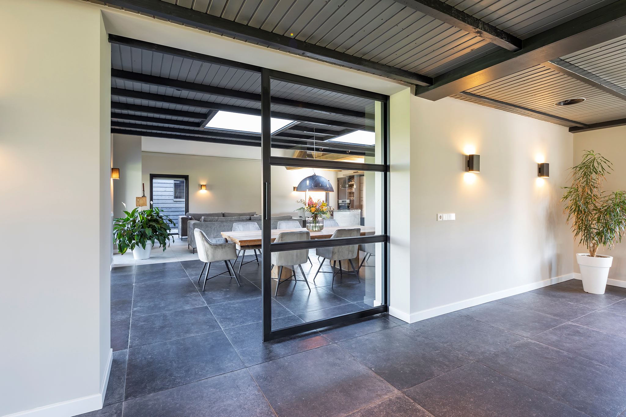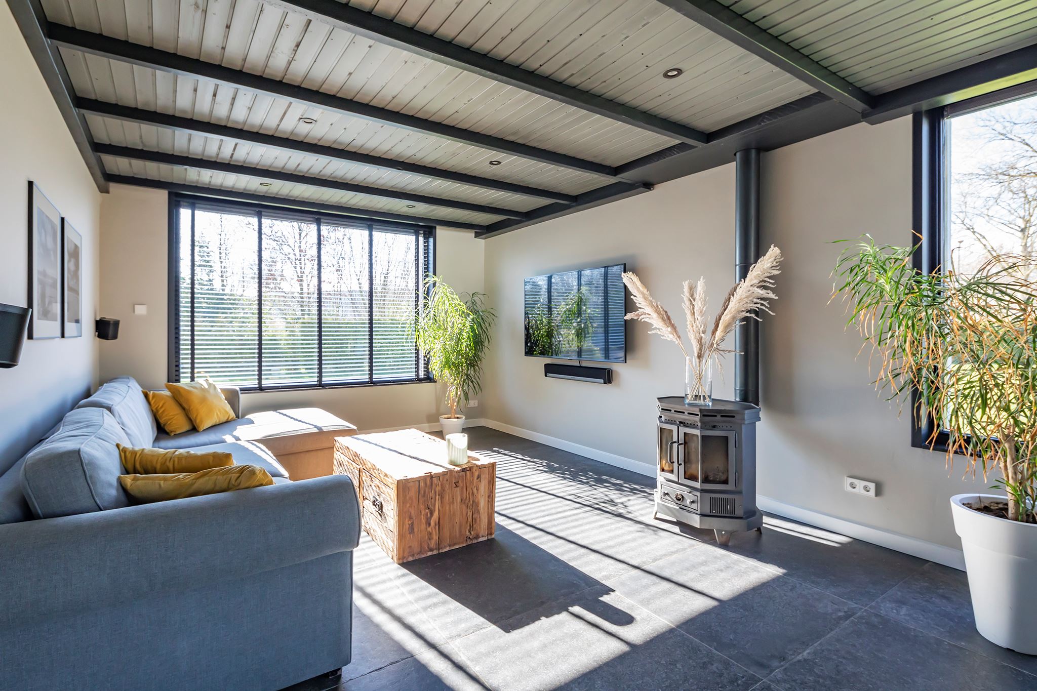 De woonkamer heeft diverse sfeervolle ruimtes waar je heerlijk kunt zitten. De open haard zorgt voor nog meer sfeer en extra warmte in huis. De gehele vloer is overigens voorzien van vloerverwarming. Tussen de woonkamer en de televisieruimte is plaats voor een grote eettafel.