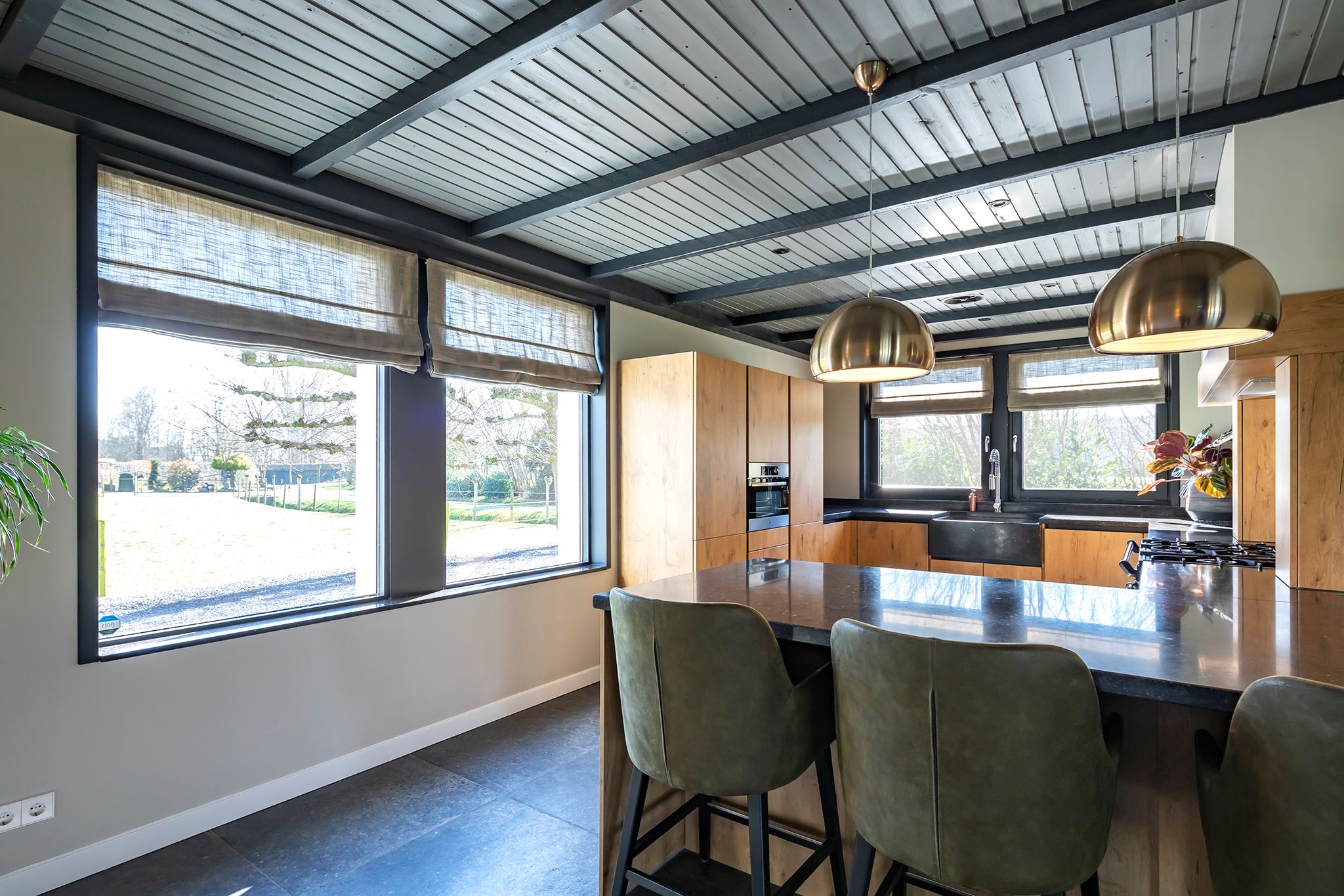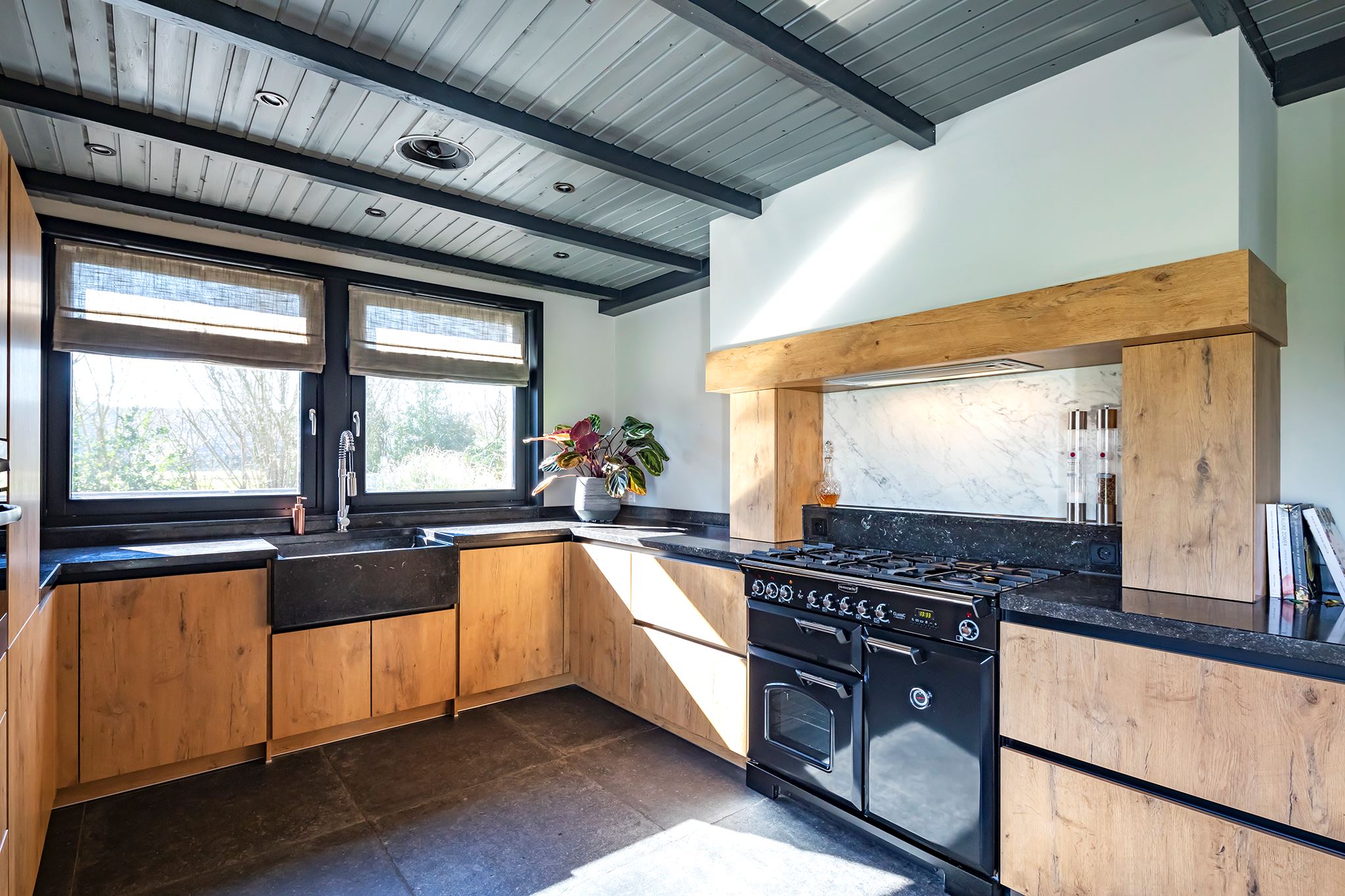 Aan de voorzijde ligt de luxueuze keuken, ruim opgezet, in carré opstelling, voorzien van een Belgisch hardstenen aanrechtblad, diverse inbouwapparatuur waaronder een stoomoven, een vaatwasser, koel/diepvrieskast en een groot stoer 6-pits gasfornuis met twee ovens. Aan de kopse zijde is een gezellig bargedeelte.