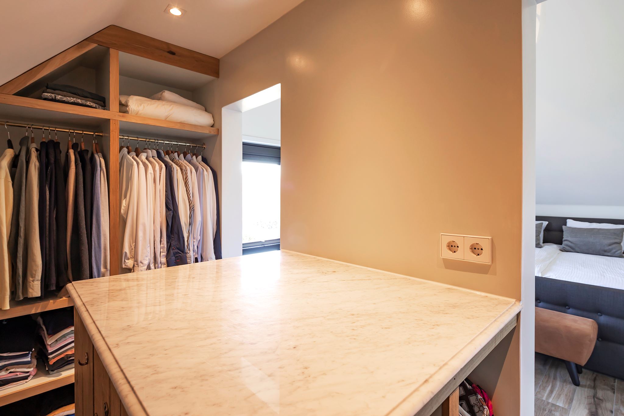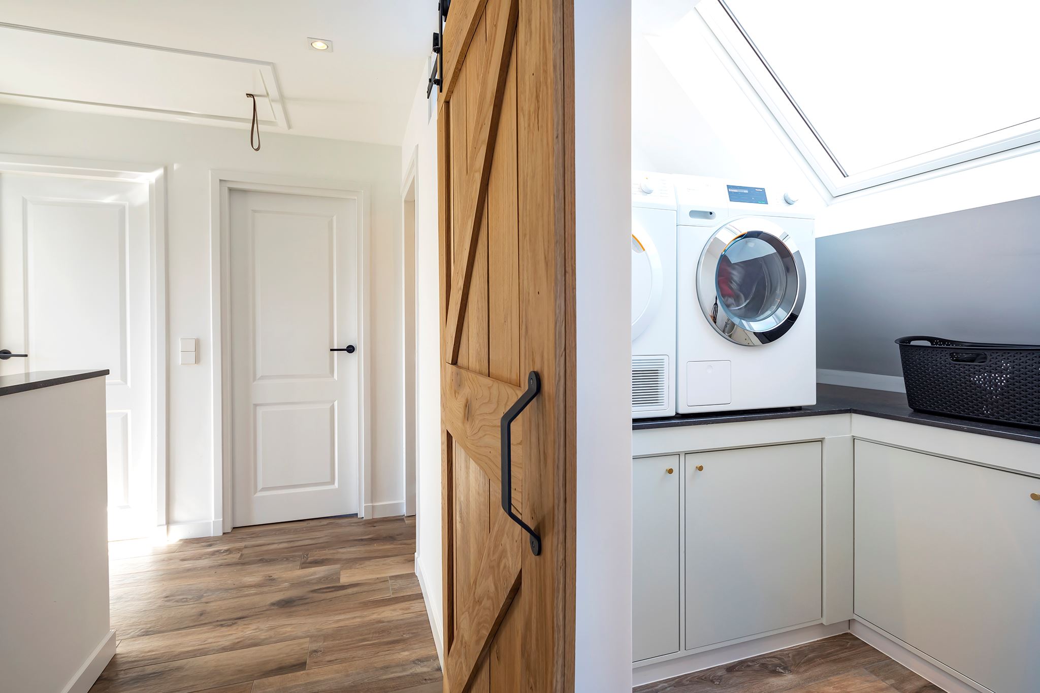 De wasmachine en de wasdroger kun je plaatsen in de daarvoor bestemde wasruimte. Deze ruimte is voorzien van op maat gemaakte inbouwkasten en heeft een groot dakraam.