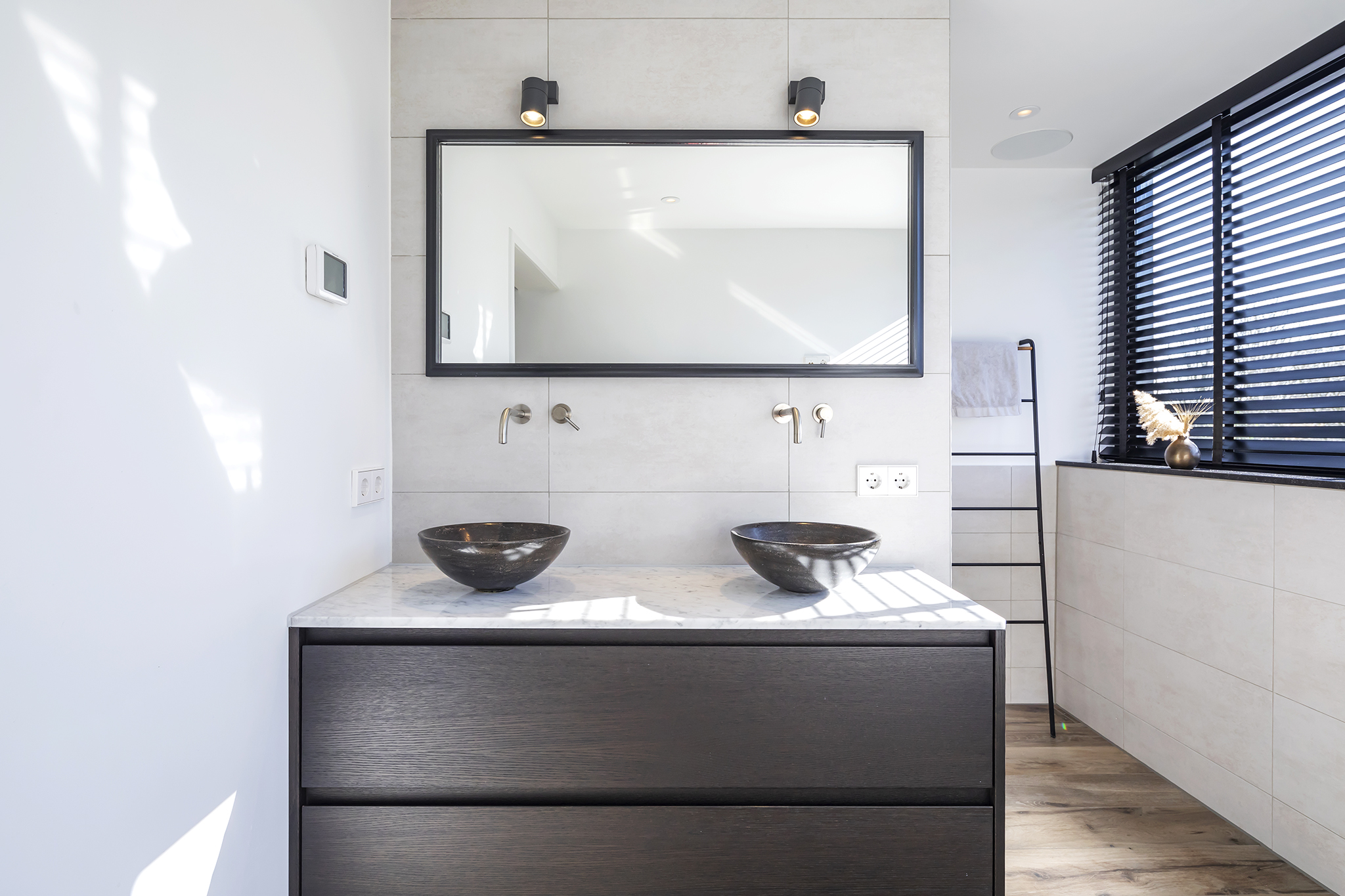 De fraaie badkamer is van alle gemakken voorzien, een hoekligbad, een inloopdouche met hand- en stortdouche en een wandmeubel met dubbele wastafel. Dankzij de grote dakkapel beschikt de badkamer over fijn natuurlijk daglicht en kunt u de ruimte naast mechanisch ook natuurlijk ventileren. De badkamervloer is voorzien van vloerverwarming. Het toilet bevindt zich in een separate ruimte op de overloop.