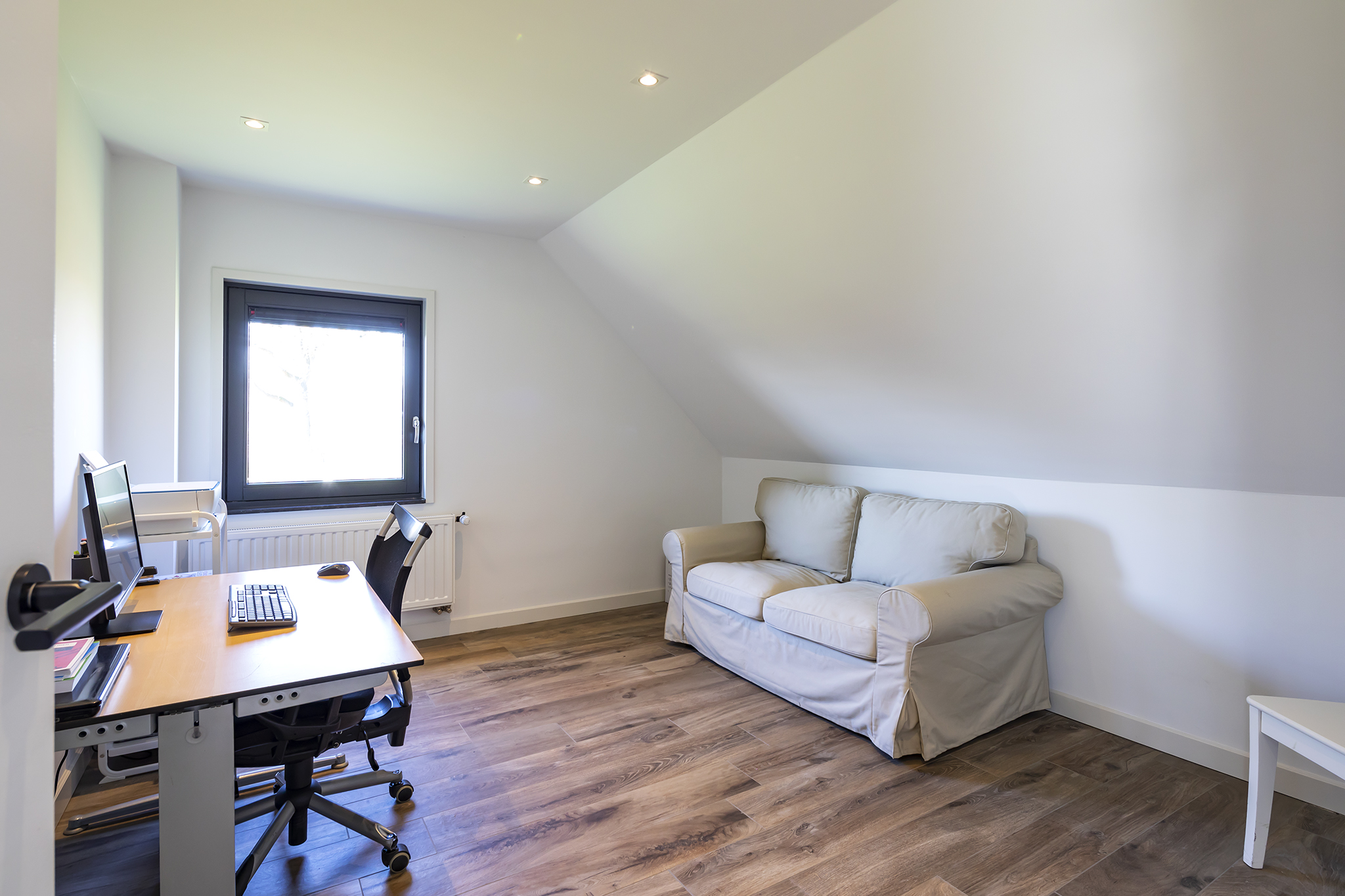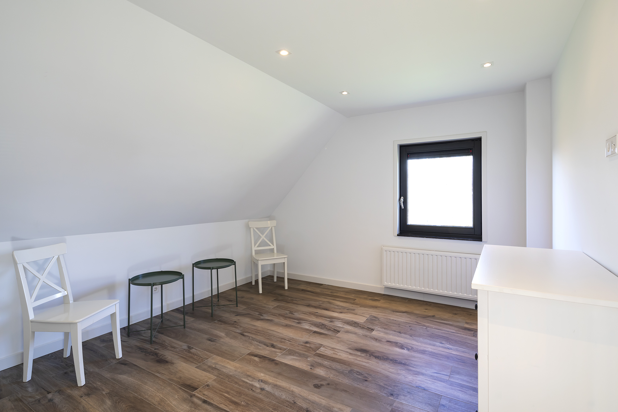 Grenzend aan de overloop liggen de badkamer, de wasruimte, een separate toiletruimte en drie slaapkamers, waaronder de master met een royale inloopkast. Vanuit de ouderslaapkamer heb je een prachtig uitzicht over de tuin.