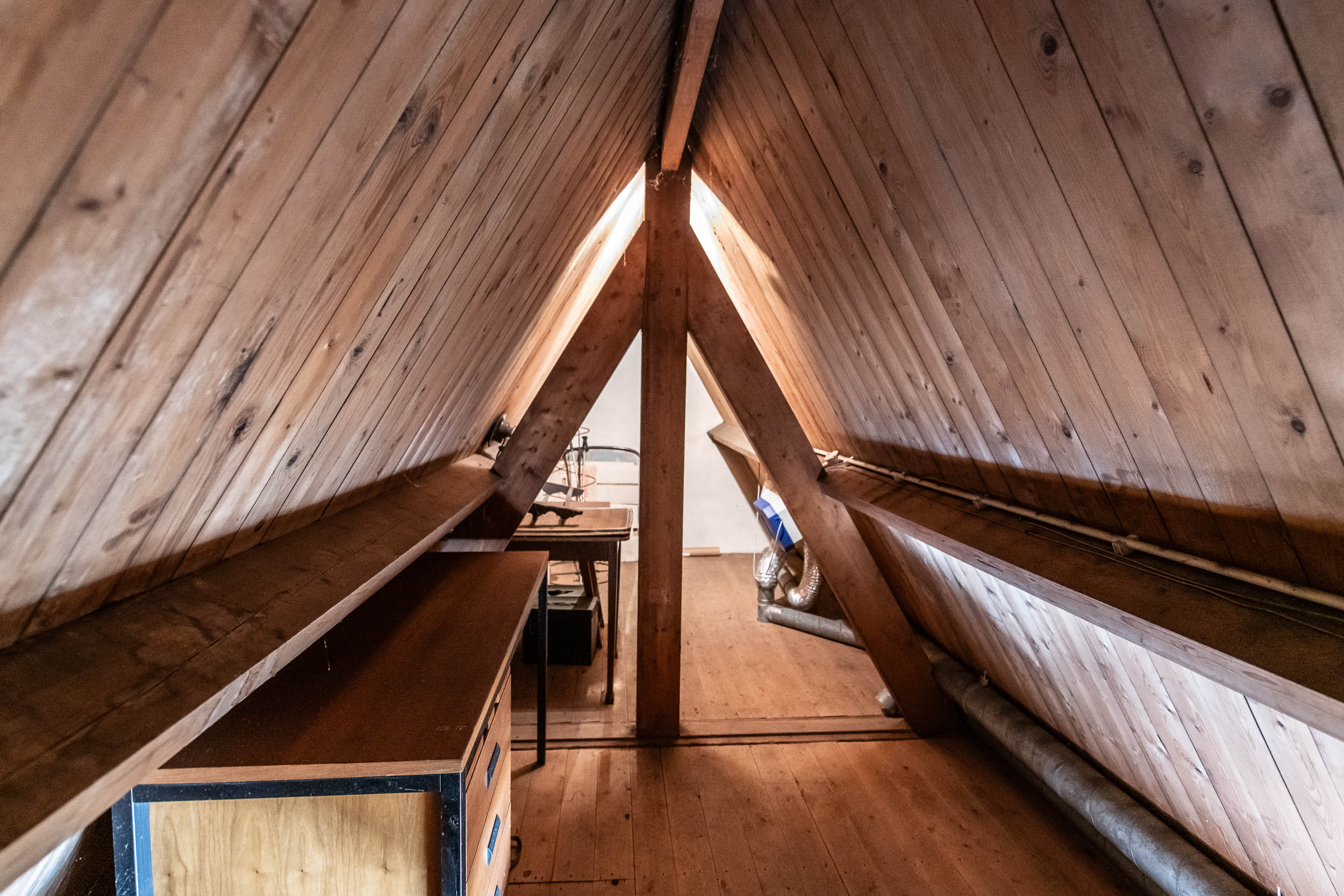 The landing features a large dormer window. On this floor, there are two bedrooms, both with a skylight and fixed cupboards. The landing also provides access to a large storage room with the boiler system. This floor also has a 2nd bathroom with walk-in shower, toilet and washbasin with double sinks. An attic ladder provides access to the large attic with plenty of headroom.