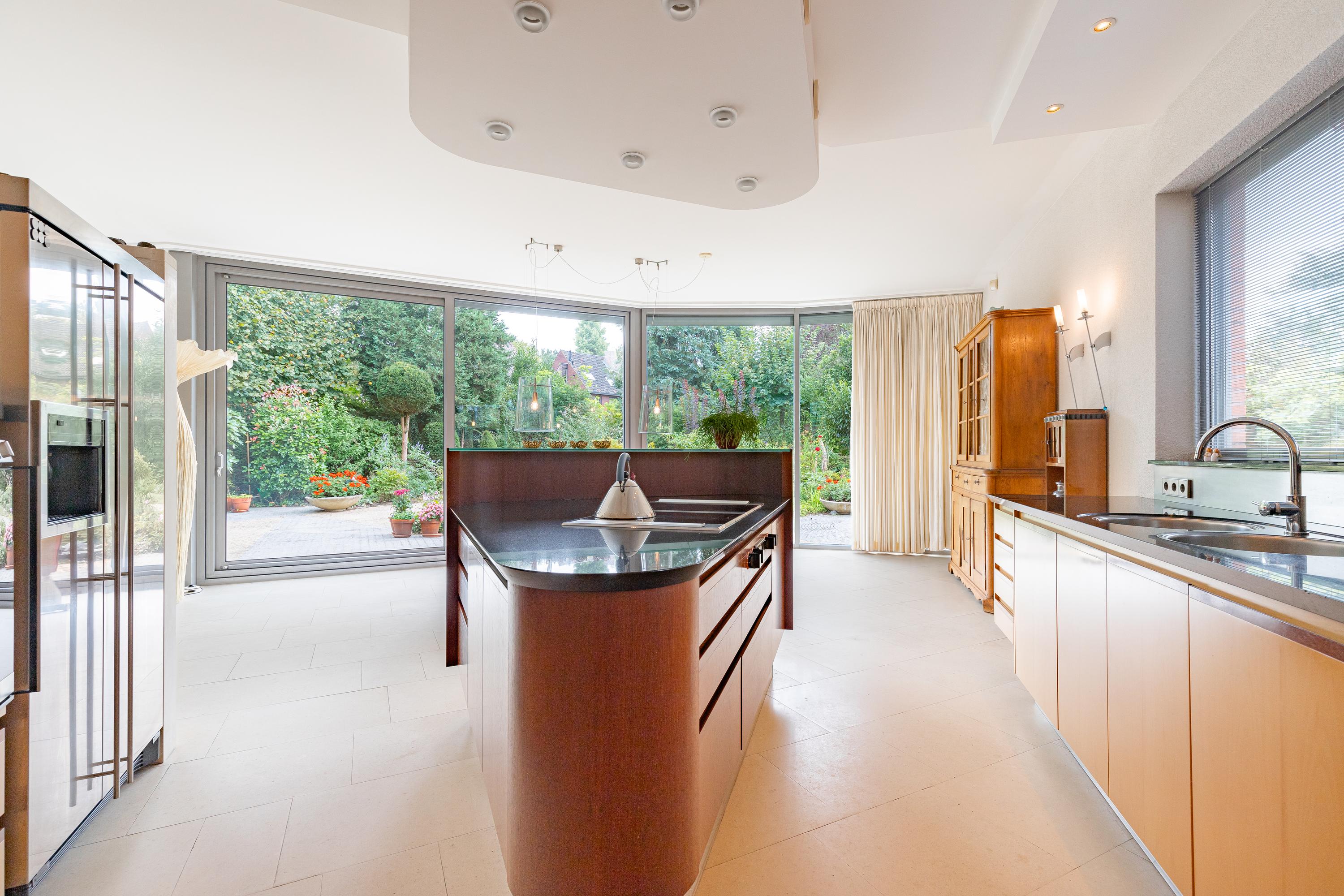 De semi open keuken is voorzien van een fraaie keukeninstallatie in ronde opstelling langs de wand en een centraal geplaatst kookeiland. Voorzien van zwarte granieten werkblad en van de navolgende inbouwapparatuur: heteluchtoven, keramische kookplaat met geïntegreerde dubbele afzuigkap, vaatwasser en een koel- vriescombinatie. De keuken is voorzien van sfeervolle inbouwverlichting in het plafond.