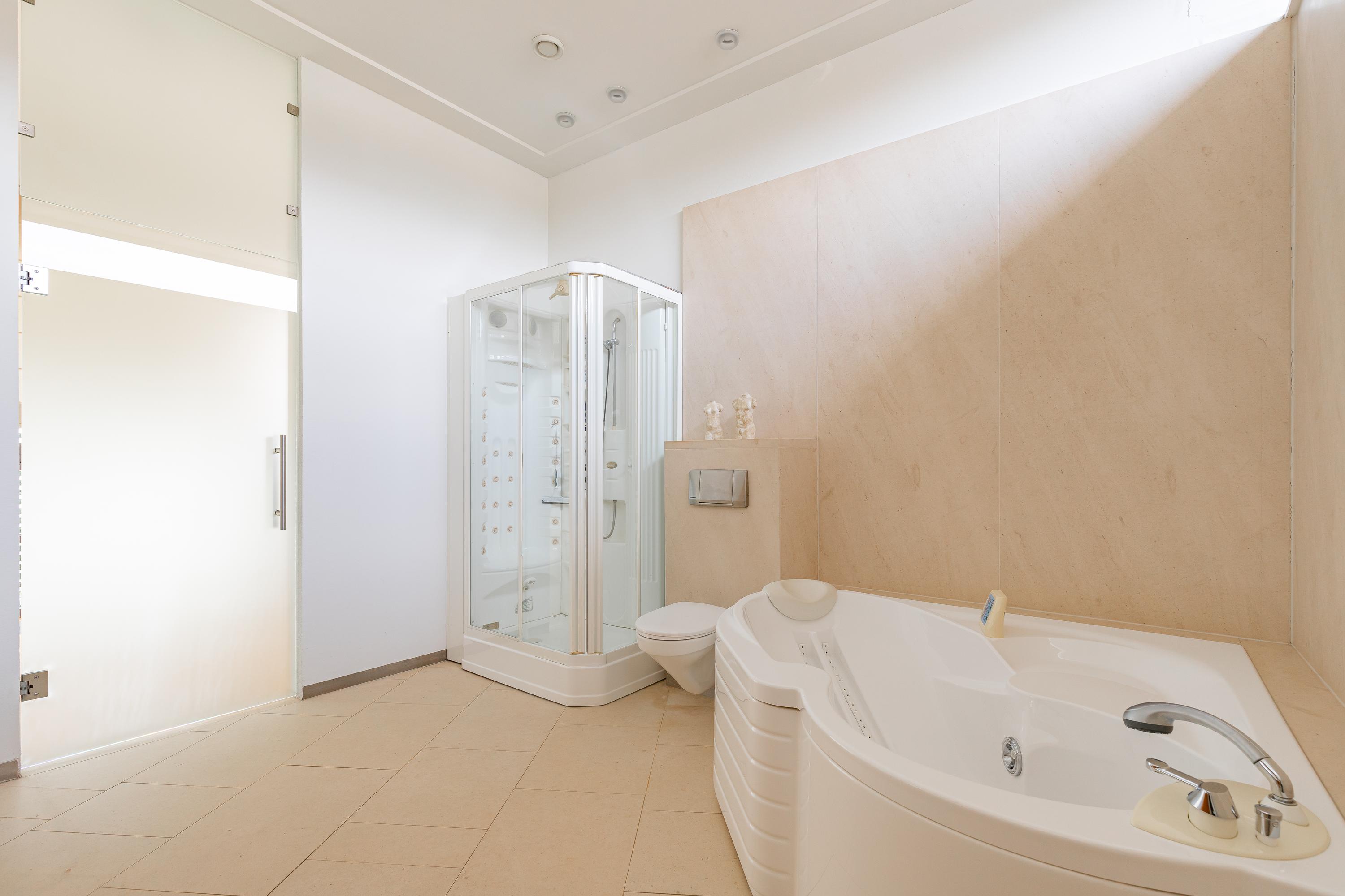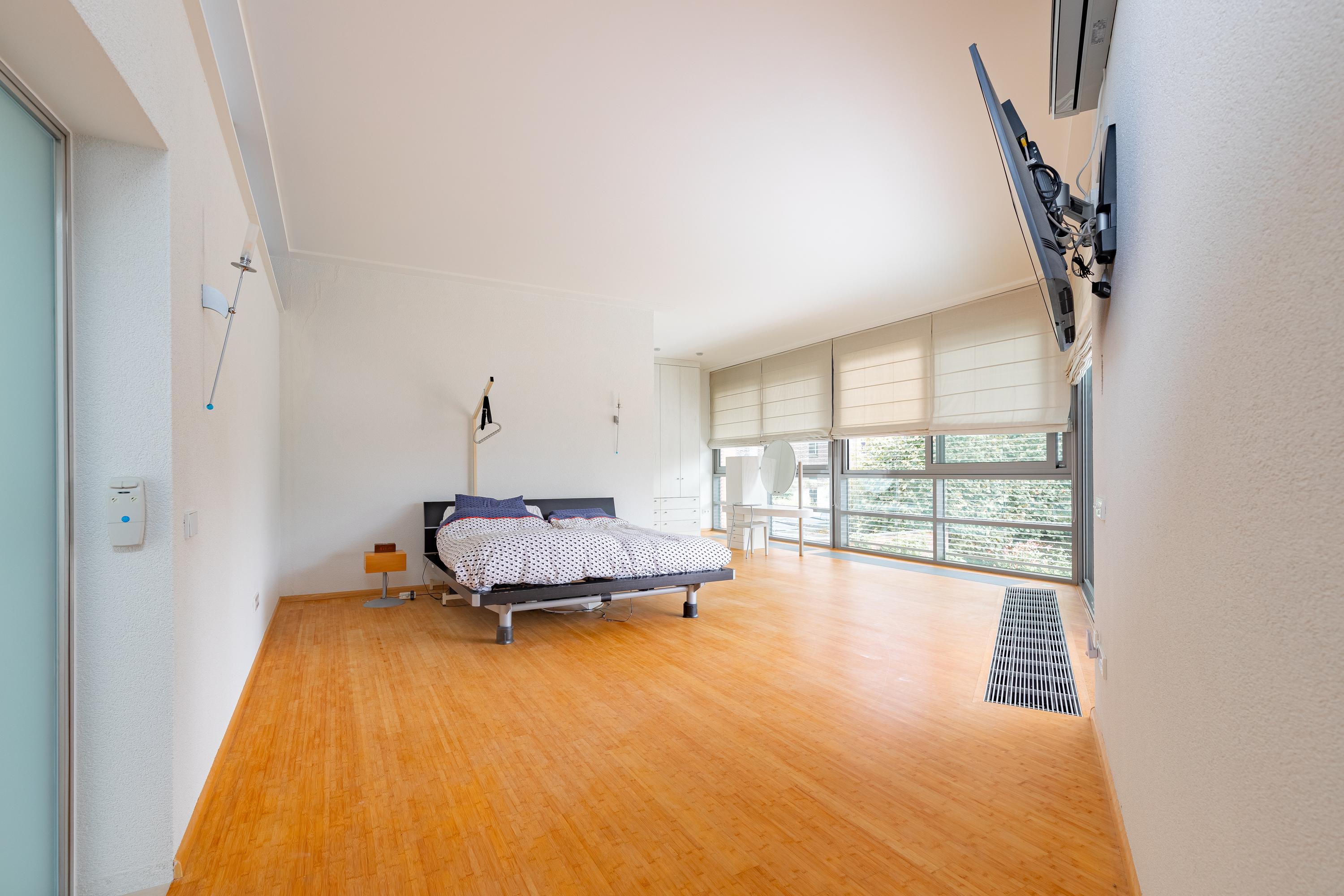 Royale overloop met optimale lichtinval door de centrale lichtkoepel. Vanuit de overloop toegang tot de drie zeer royale slaapkamers en fraaie badkamer voorzien van inloopdouche, badkamermeubel en zwevend toilet. De badkamer is voorzien van een daglichtkoepel. De vloer- en wandafwerkingen zijn uitgevoerd in een lichte kleur van Portugese leisteen. De hoofdslaapkamer, met grote aluminium schuifpui naar het zonnig gelegen terras, biedt veel ruimte voor zowel garderobe als slaapruimte. Direct grenzend aan deze kamer bevindt zich de hoofdbadkamer. Bereikbaar via hardglazen deur met jacuzzi hoekbad, douche-/ stoomcabine, zwevend toilet en badkamermeubel met twee wastafels.
