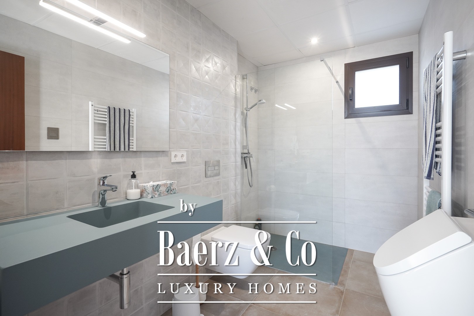 kunt opvangen. Buiten nodigt een ruim overdekt terras uit tot ontspannen momenten aan het prachtige zwembad. Daarnaast is er een verwarmde buitendouche, een tweede overdekt terras en voldoende parkeerruimte voor meerdere voertuigen. Op minder dan drie minuten wandelen bereikt u het idyllische rotsstrandje Cala Blanca en via het kustpad bent u in ongeveer twintig minuten wandelen bij het zandstrand El Arenal, met zijn levendige boulevard vol restaurants, bars en winkels. Met de wagen bereikt u dit strand op minder dan 5 minuten. In de directe omgeving, op slechts enkele minuten te voet, vindt u bovendien diverse restaurants, een apotheek, een tennisclub en een kleine supermarkt. De villa is uitgerust met gekanaliseerde airconditioning (warm/koud), vloerverwarming, een ventilatiesysteem, dubbele beglazing, elektrische rolluiken en fotovoltaïsche zonnepanelen. Het is de ideale villa voor wie op zoek is naar luxe en comfort op een steenworp afstand van het strand!