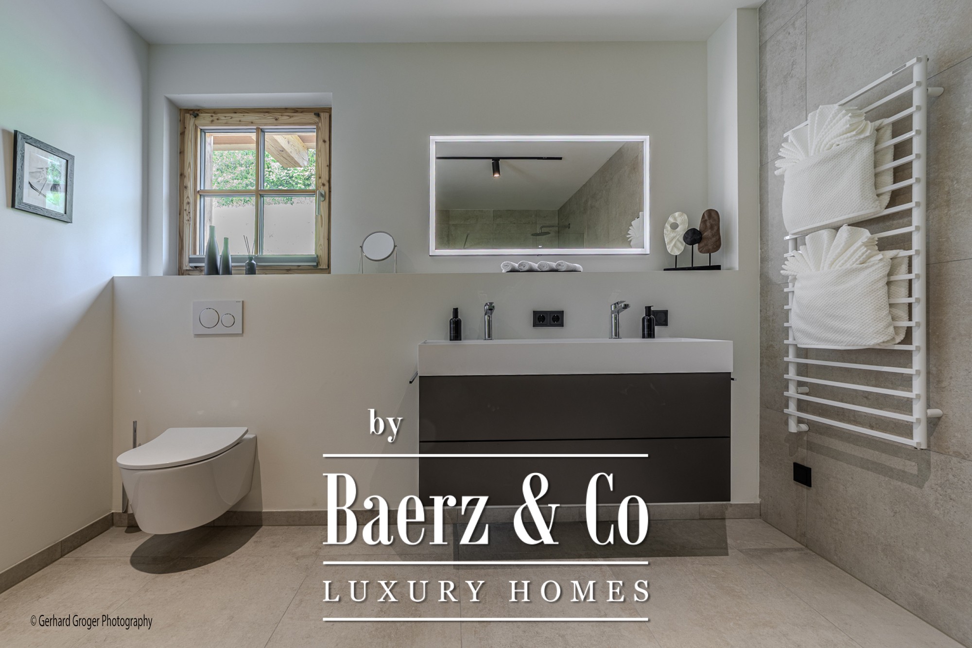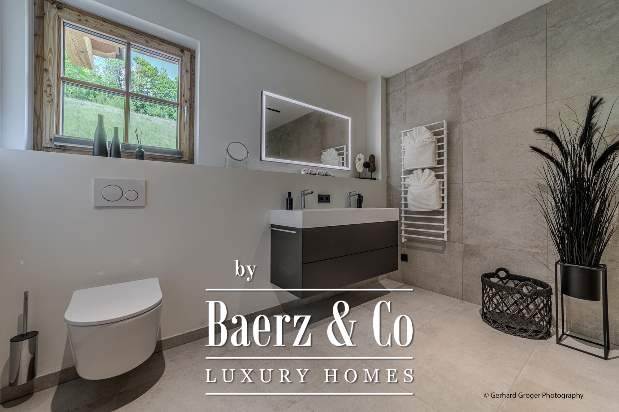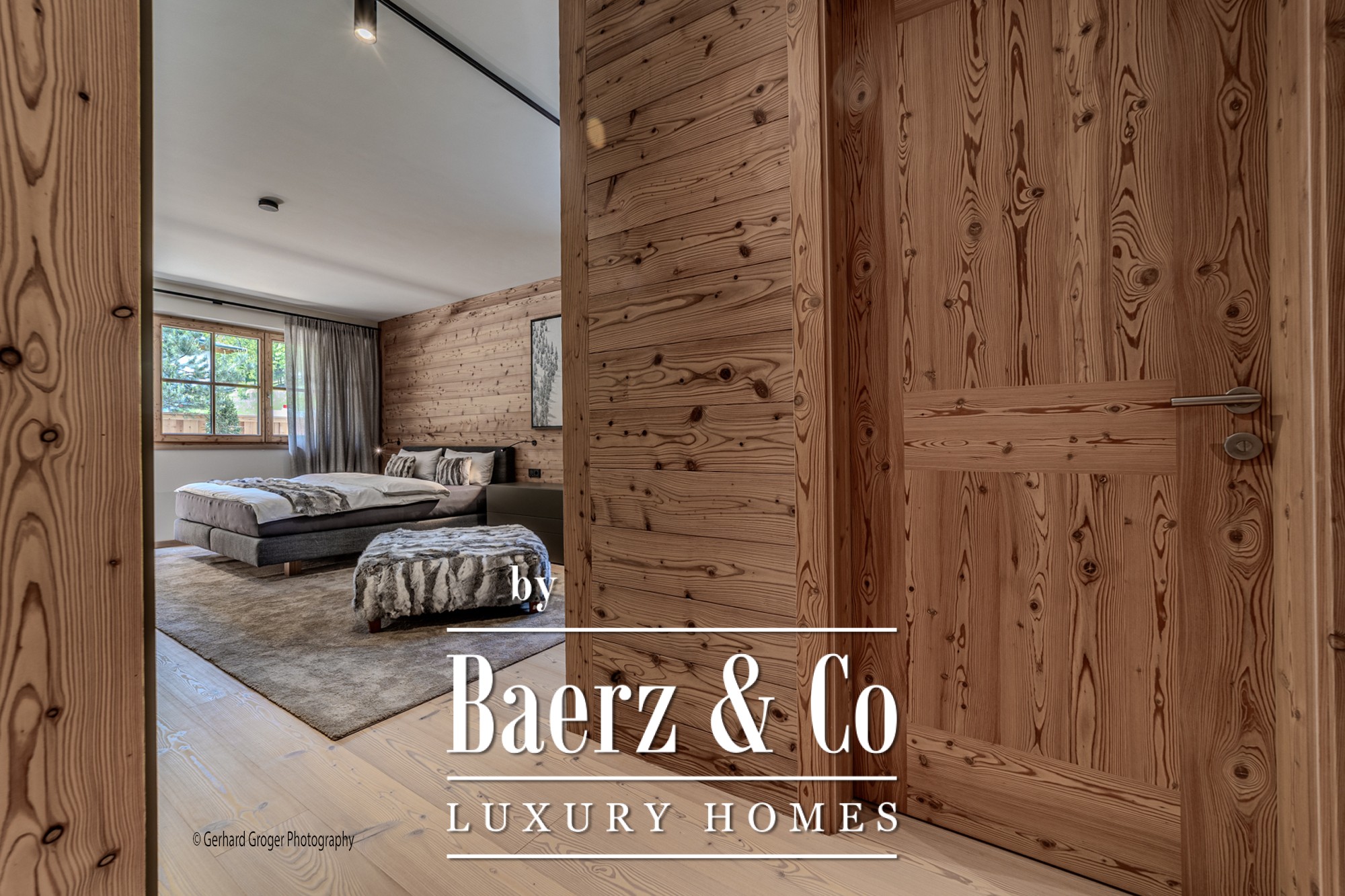 Op de kelderverdieping bevindt zich een privé slaapkamer met en-suite badkamer en een elegante wellnessruimte met sauna. Twee extra slaapkamers met eigen badkamers zijn gesitueerd op de begane grond, waardoor gezinsleden en gasten optimaal comfort genieten. De bovenverdieping biedt een lichte woon- en eetkamer, voorzien van een open haard en zichtbare dakspanten, grenzend aan ruime terrassen met panoramisch uitzicht op de Alpen.