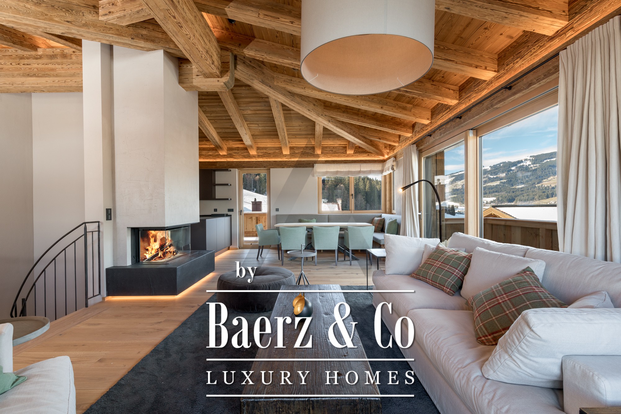Op de eerste verdieping vindt u twee stijlvolle slaapkamers, beide met en-suite badkamers en toegang tot balkons met uitzicht op de imposante bergen. De bovenste verdieping bestaat uit een open living, eetkamer en keuken—een ideale ruimte voor ontspanning en gastenontvangst. Hier bepalen authentieke zichtbare houten balken, een moderne keuken, een open haard en panoramisch bergzicht het karakter, terwijl de royale balkonterrassen het natuurlijke licht van ochtend tot avond binnenlaten.