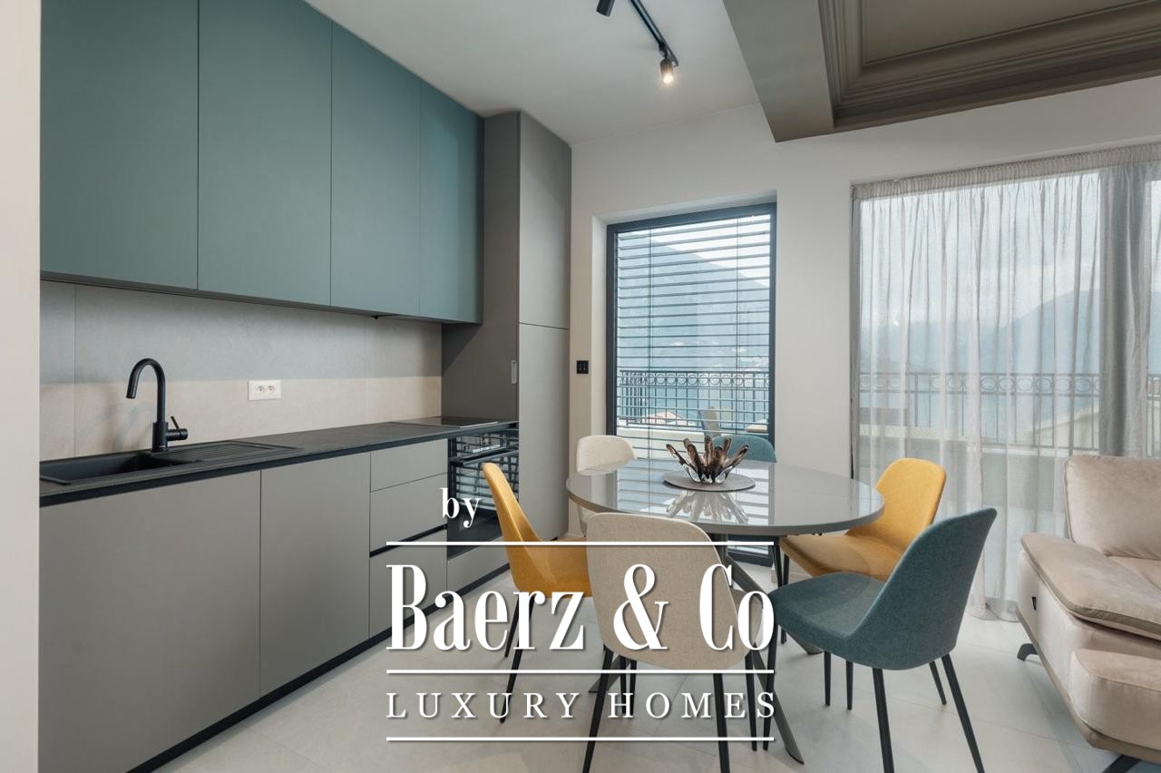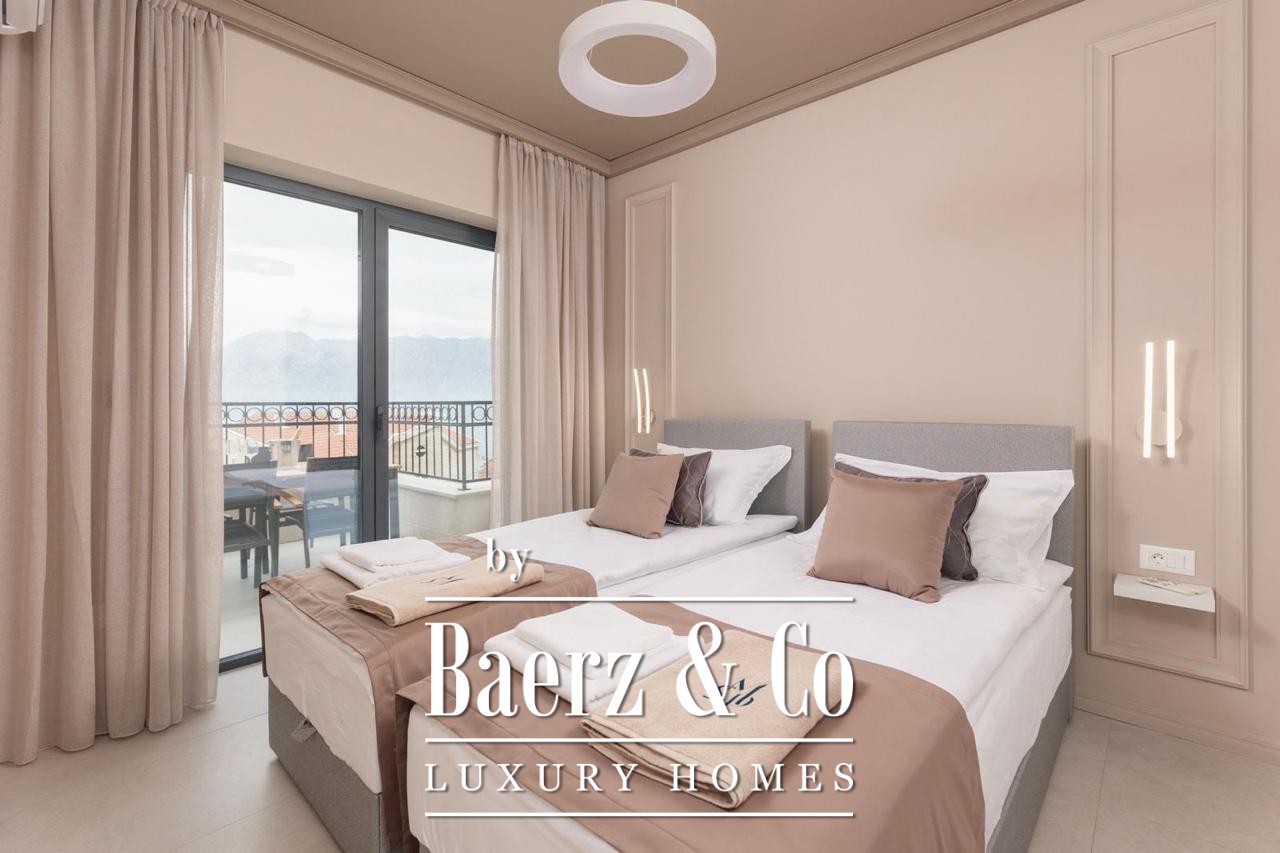 Het appartement beschikt over drie slaapkamers, een badkamer, een aparte toiletruimte en twee terrassen. Vloerhoge ramen brengen het wisselende uitzicht over de baai van Kotor naar binnen en vormen een harmonieuze aanvulling op de 186 m² woonruimte, volledig gemeubileerd en klaar voor directe bewoning. Een doordachte indeling leidt via de hal naar de leefruimtes en terrassen, waar buitenleven wordt bepaald door het spel van zee en lucht.