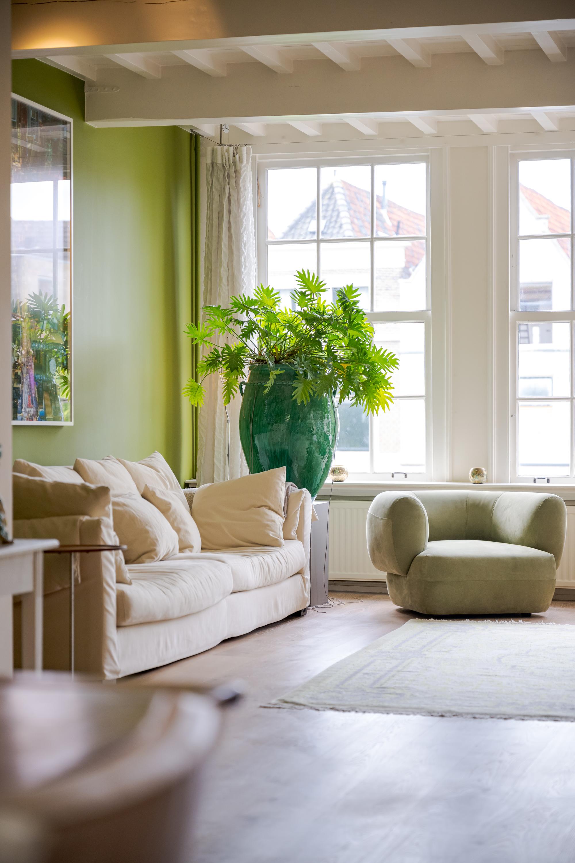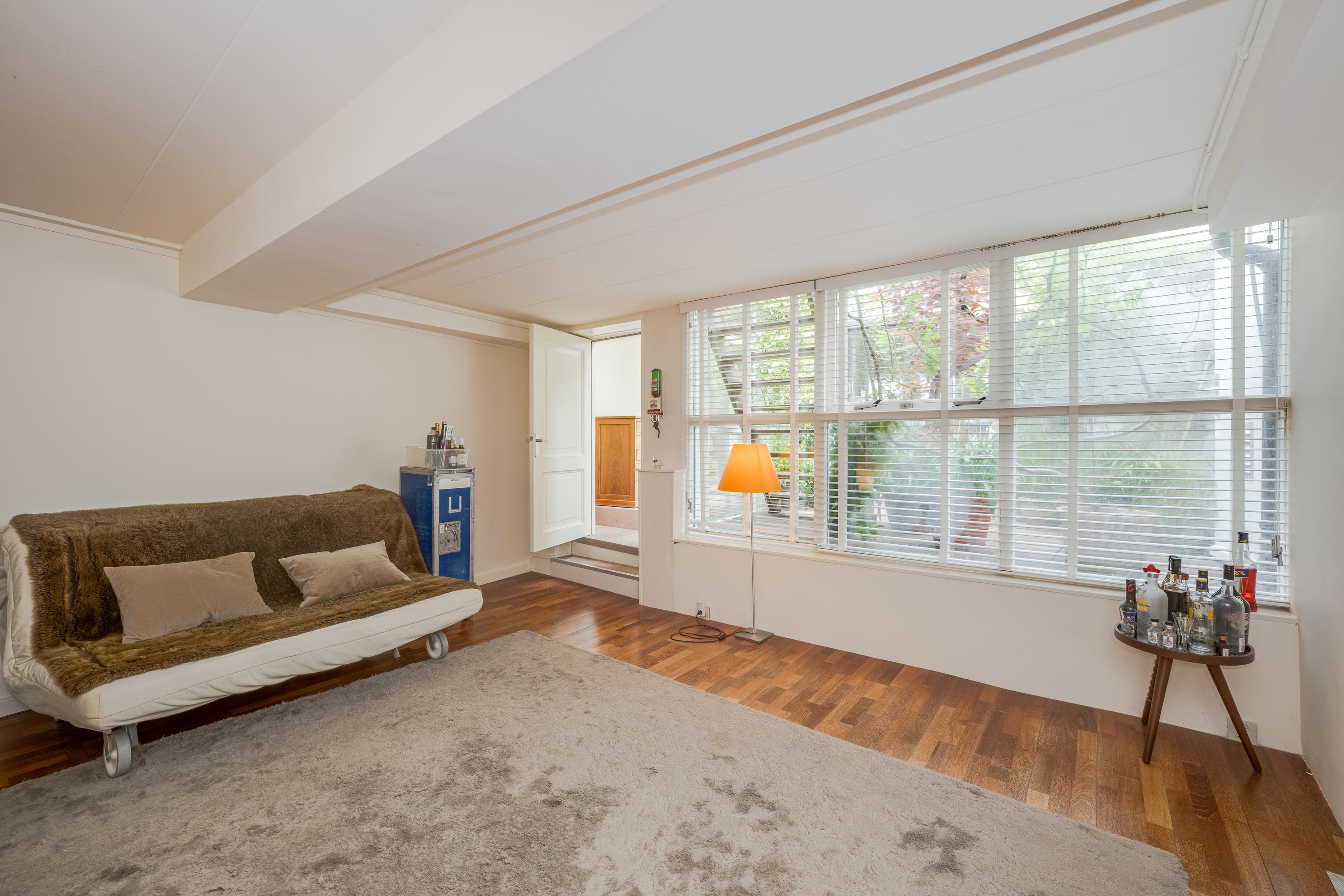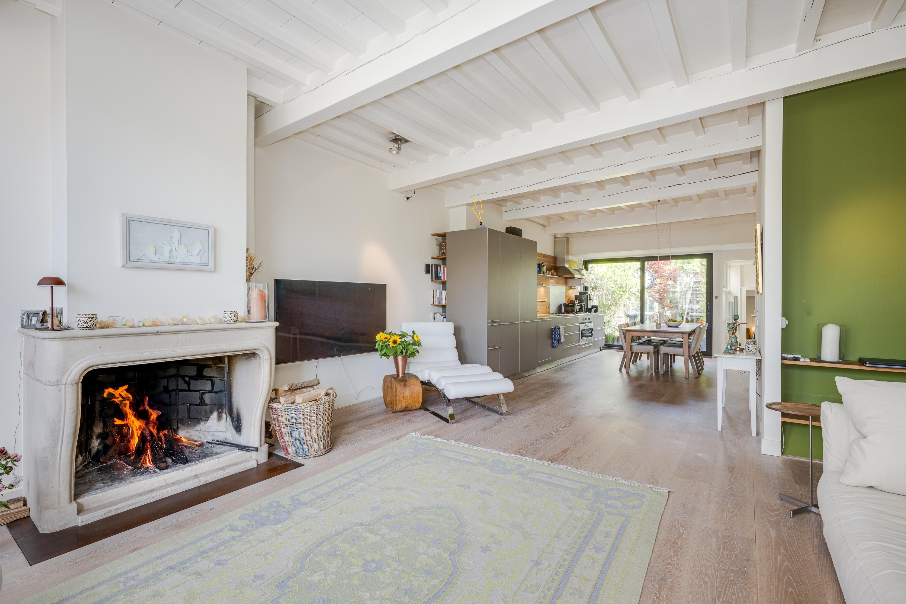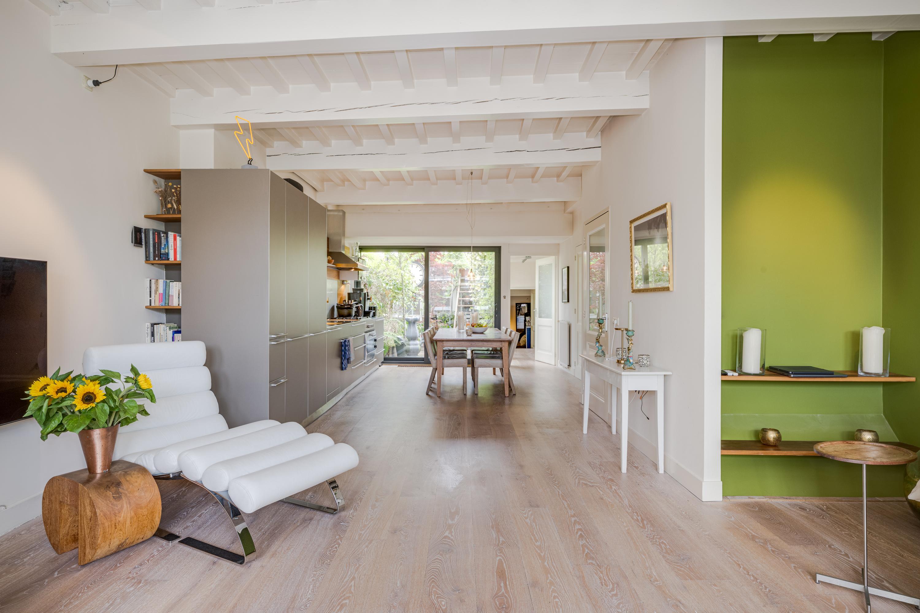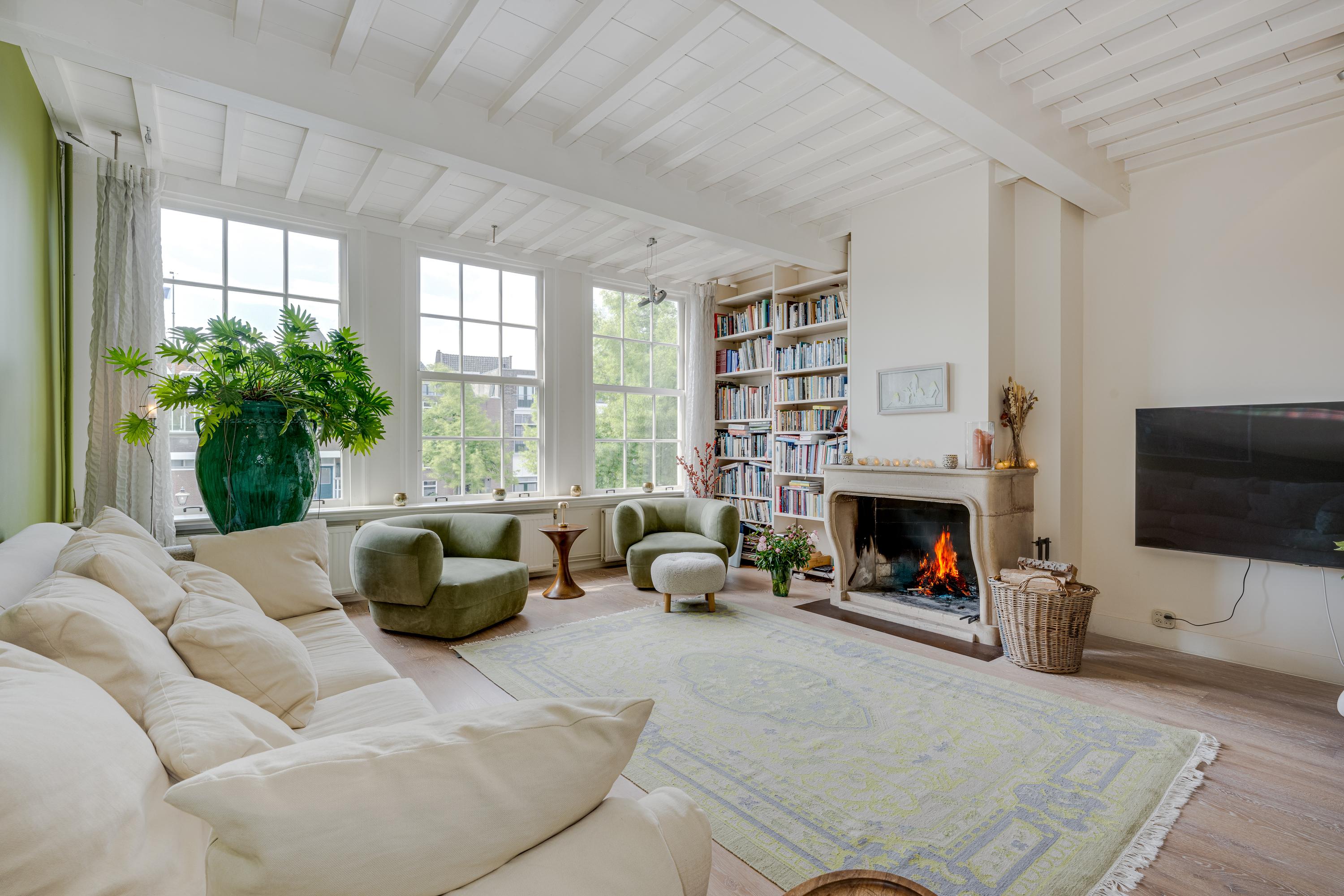 Sfeervolle en lichte woonkamer met sfeervolle open haard en prachtig uitzicht op de gracht. In open verbinding met de royale eetkeuken, voorzien van alle gebruikelijke apparatuur. Via een schuifpui toegang tot de groene, beschutte binnentuin; een oase van rust midden in de stad. Separaat toilet met fontein. Vanuit de overloop toegang tot een tweede, sfeervolle multifunctionele (woon-)kamer.