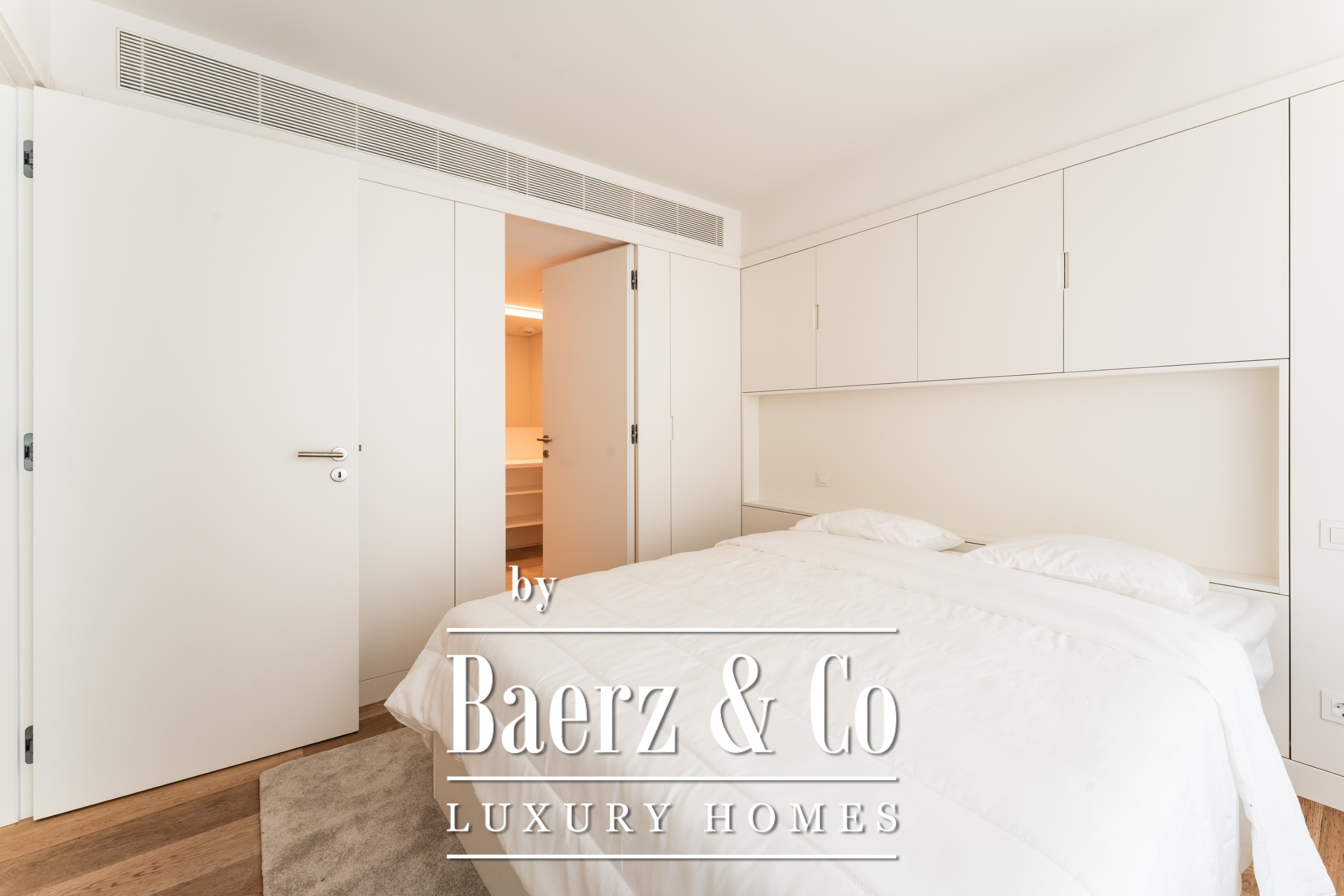 Binnen ademt het appartement een eigentijdse, functionele elegantie. De keuken is volledig uitgerust met hoogwaardige AEG-inbouwapparatuur, terwijl meerlaagse eiken vloeren gecombineerd worden met Reynaers aluminium kozijnen voor optimale thermische en akoestische isolatie. Airconditioning met afzonderlijke multi-splitunits zorgt het hele jaar door voor een aangenaam binnenklimaat. De badkamers zijn voorzien van Sanindusa-sanitair en keramische tegelafwerking. De royale bergruimte wordt geboden door scharnierdeuren met thermolaminaat interieur. Het gebouw heeft energieklasse B.