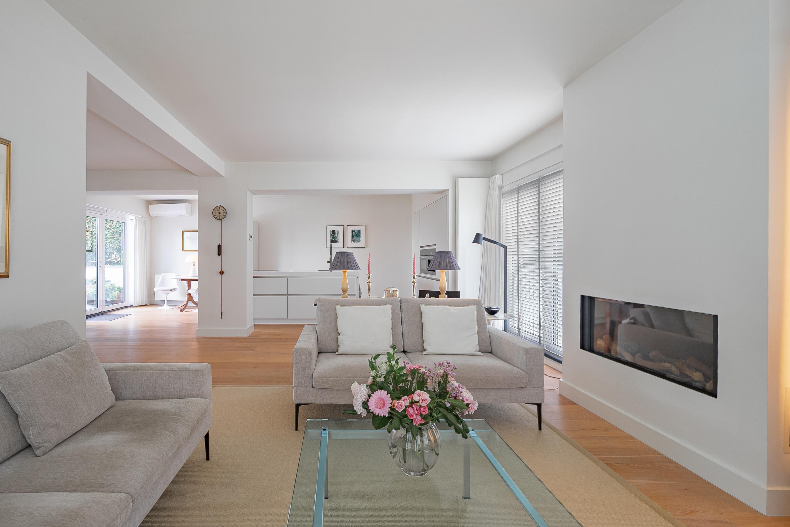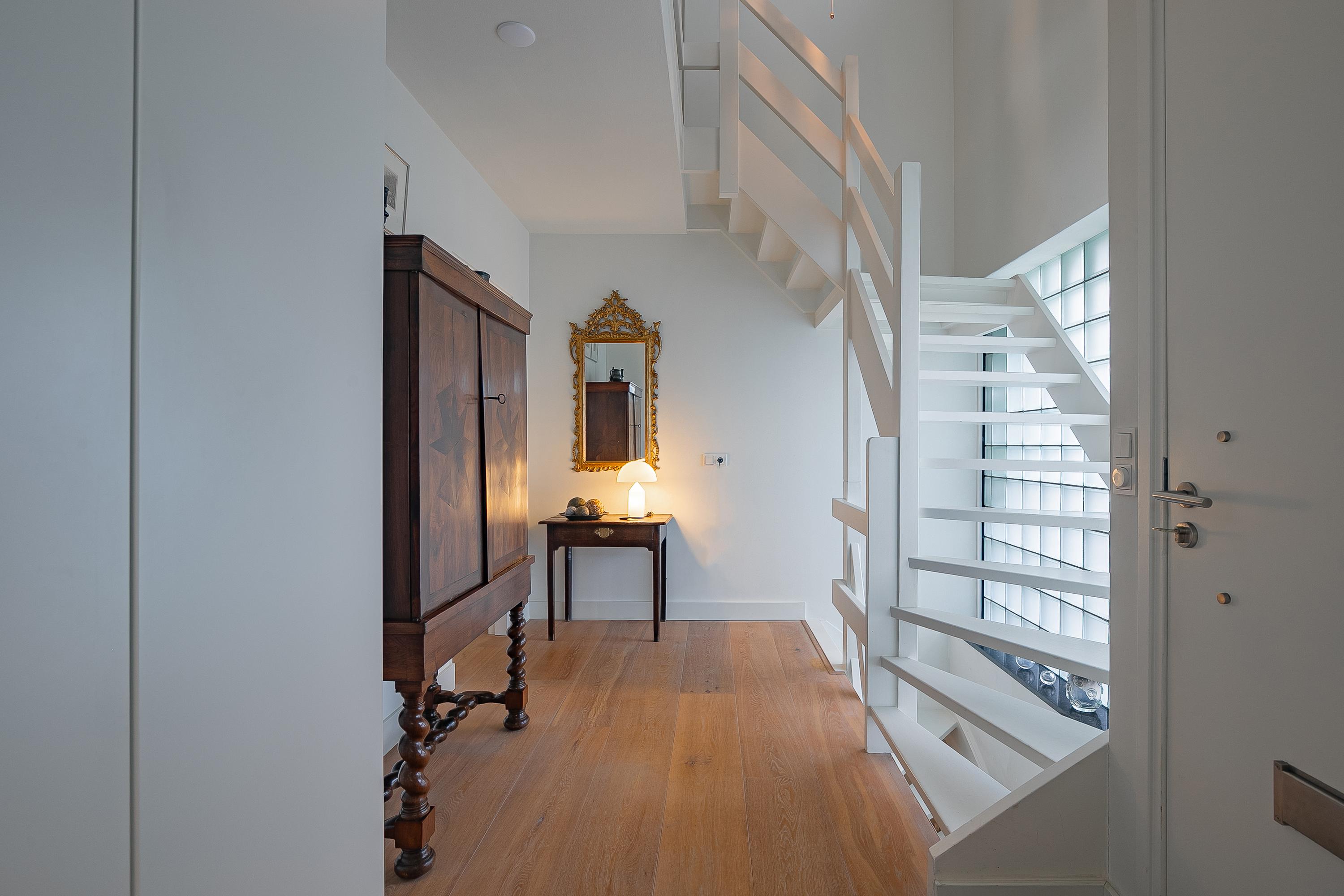 Via de representatieve entree met een stijlvolle garderobe kast, open vide en toegang tot het gastentoilet met wandcloset en fonteintje, de meterkast en de lichte, royale leefruimte (ca. 68m²). De woonkamer is voorzien van een sfeervolle Faber gashaard die jaarlijks wordt onderhouden en op koude dagen zorgt voor extra warmte en sfeer. De designradiatoren en fraaie parketvloer geven de ruimte extra stijl.
