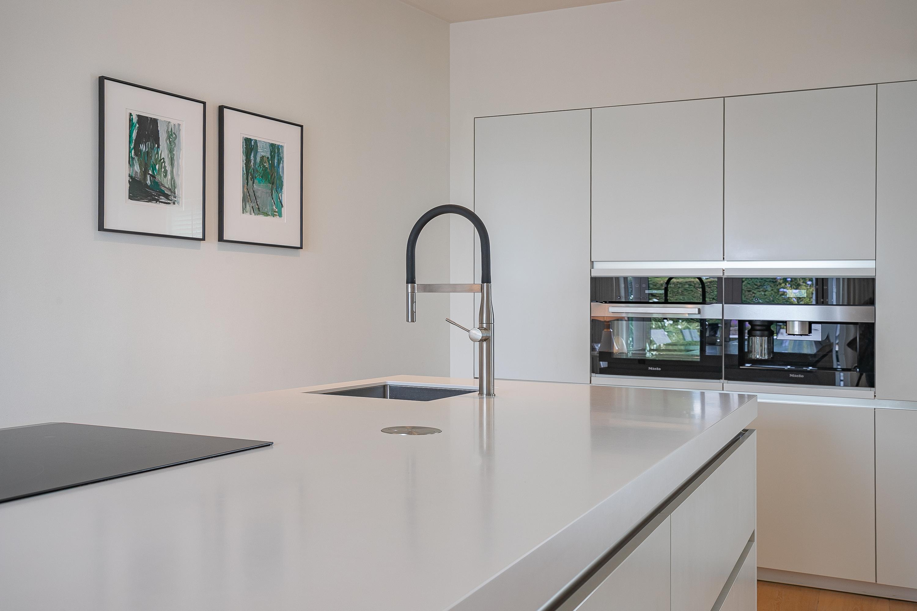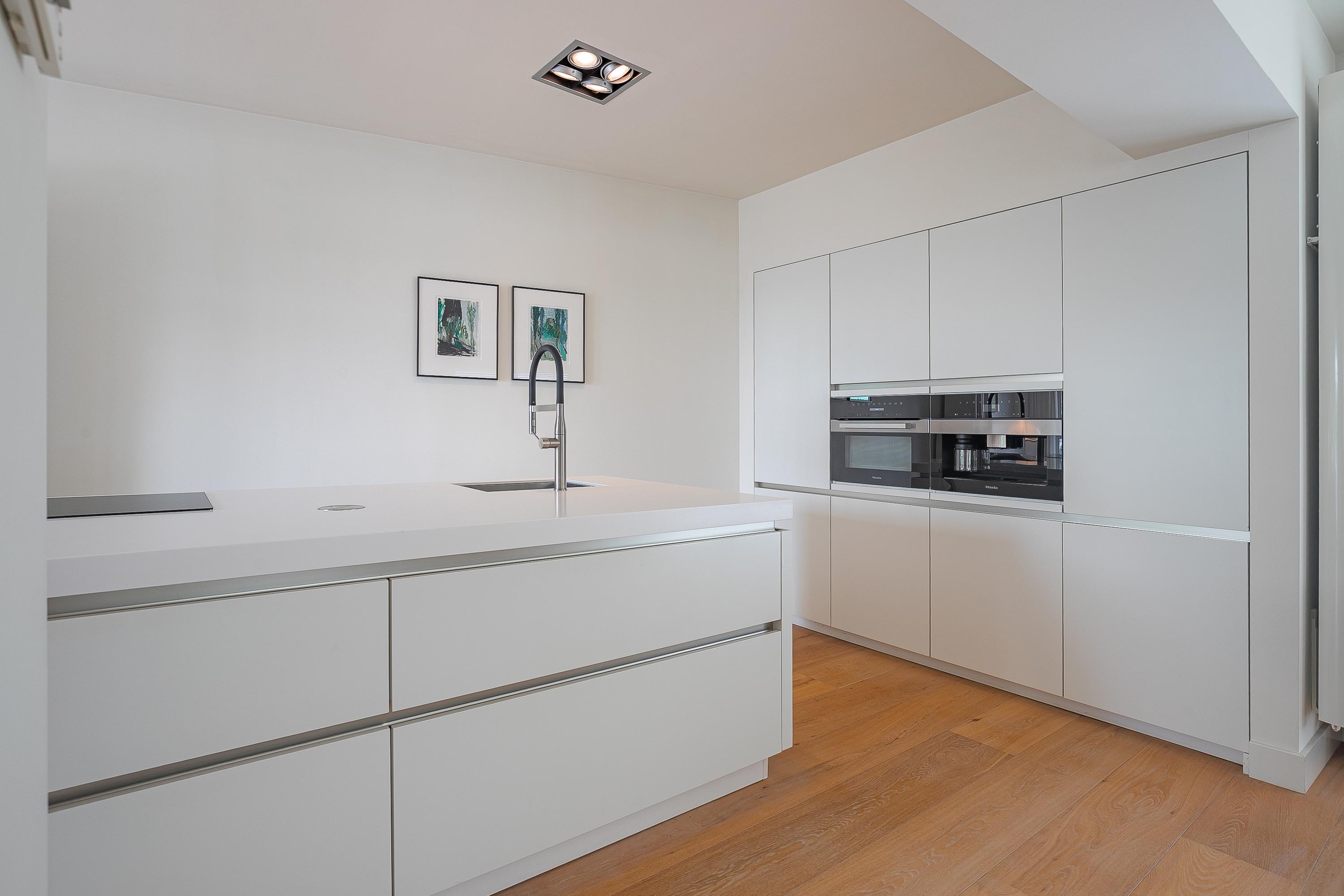 De open keuken met groot kookeiland is uitgevoerd in een luxe, greeploze opstelling en voorzien van hoogwaardige inbouwapparatuur: een 5-zone inductiekookplaat, plafondafzuiging, vaatwasser, volautomatisch koffiesysteem, heteluchtoven, koelkast en spoelbak.