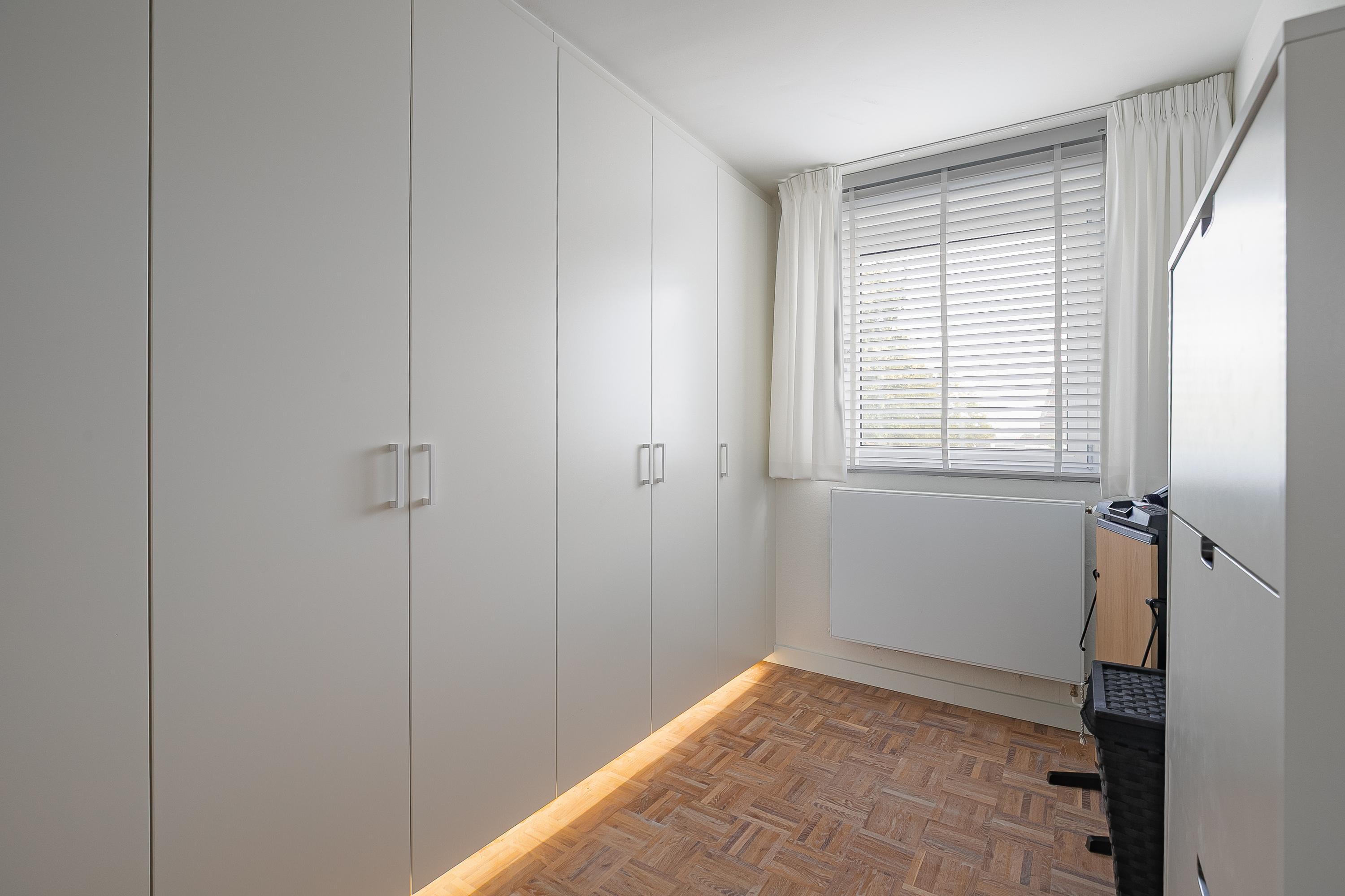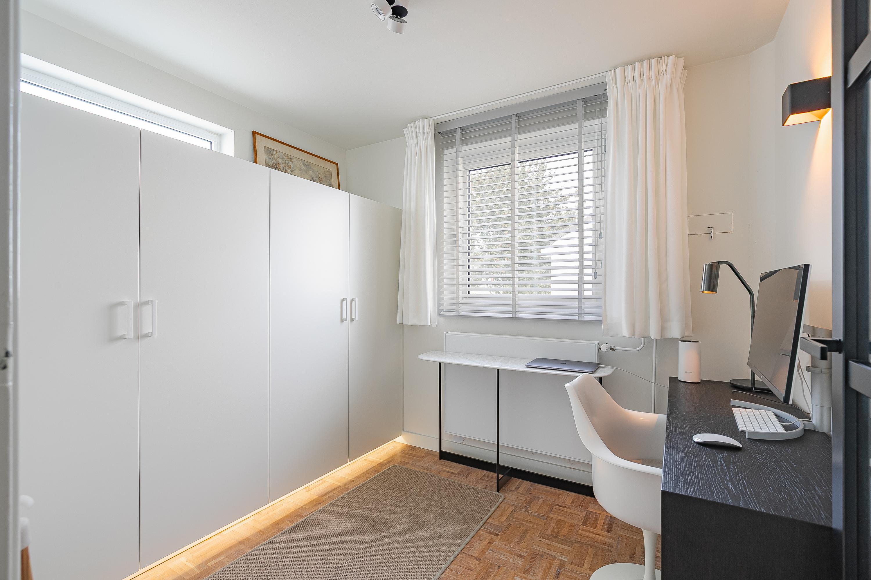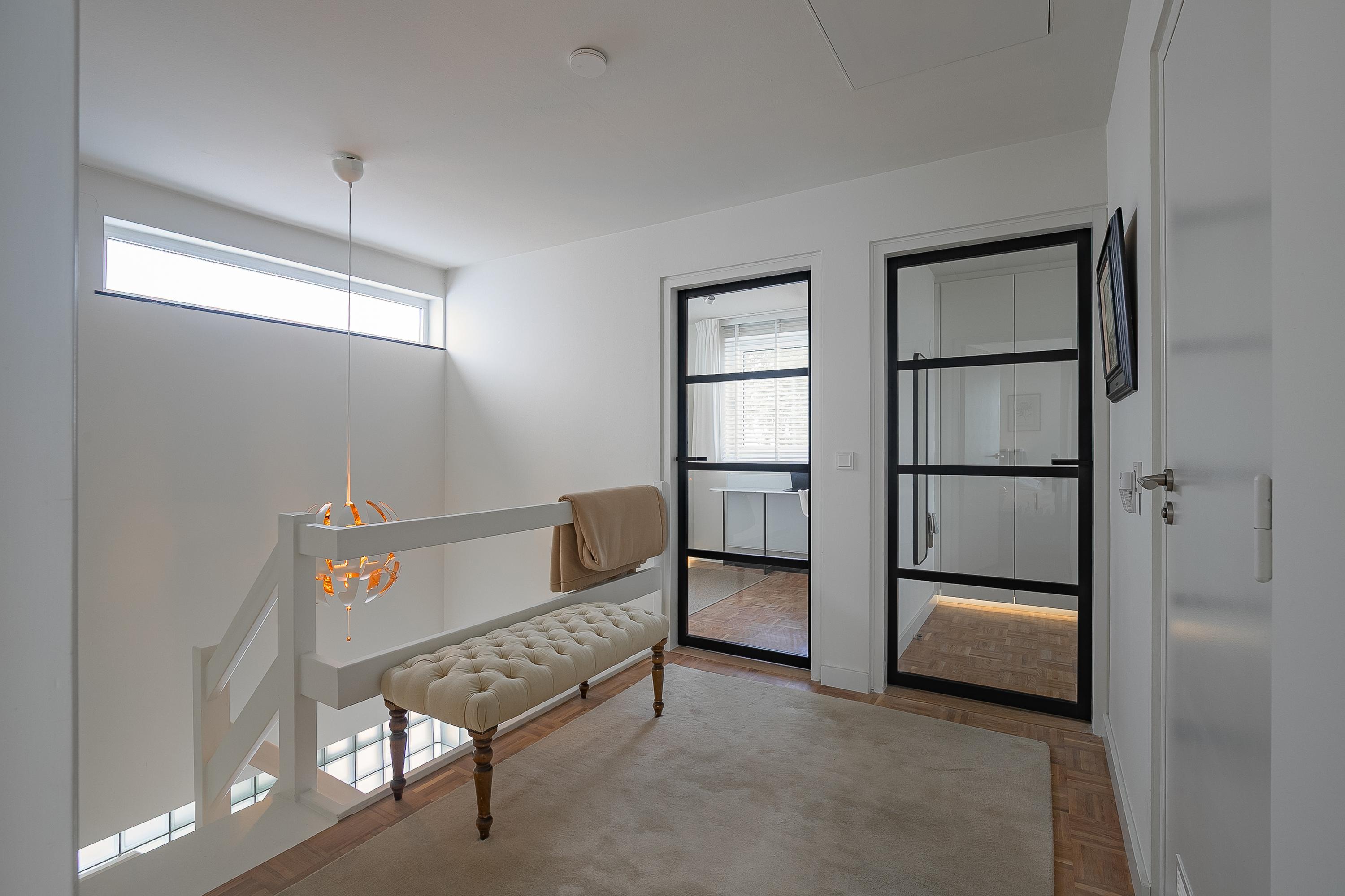 De ruime overloop leidt naar vier comfortabele slaapkamers (ca. 6.7, 8.5, 11.5 en 14.5m²). De inloopkastenkamer en het kantoor zijn uitgerust met op maat gemaakte, stijlvolle inbouwkasten van Slangen Interieurbouw. De overige kamers zijn eveneens praktisch ingericht. De badkamer beschikt over mechanische ventilatie en is uitgerust met een ligbad, inloopdouche, dubbele wastafel en een wandcloset. Alle kamers zijn voorzien van aluminium kozijnen met HR++ beglazing en stijlvol uitgerust met een mozaïek parketvloer.