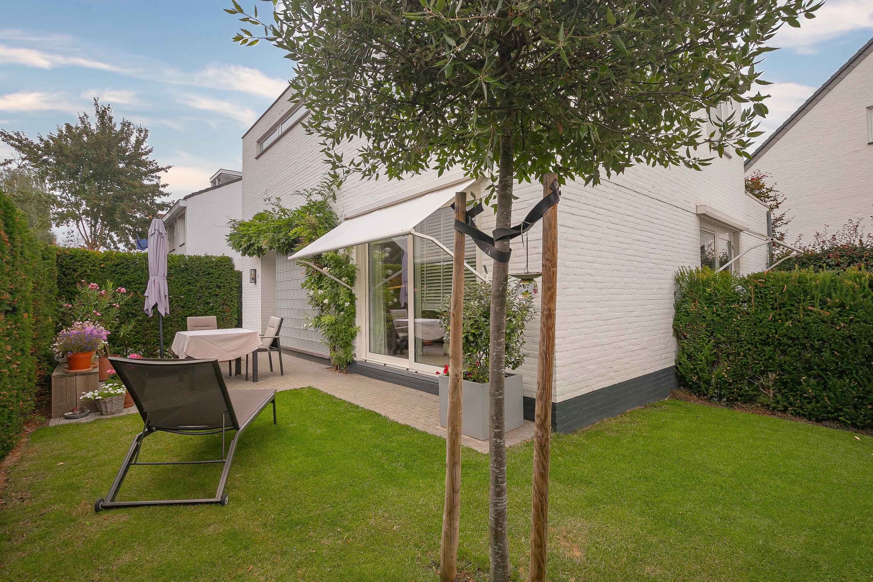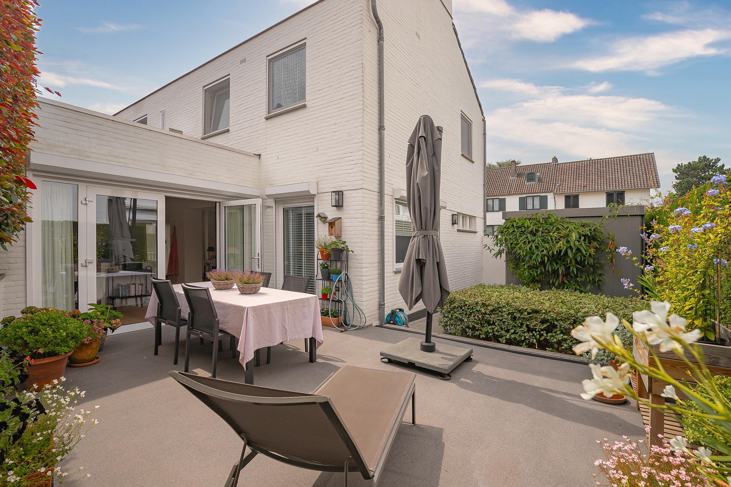 Via de schuifpui aan de voorzijde komt u in de gezellige, groene voortuin, een heerlijke plek om van de avondzon te genieten. Aan de achterzijde geven openslaande deuren toegang tot de beschutte stadstuin op het noordoosten, met zonnescherm en meerdere zitplekken.