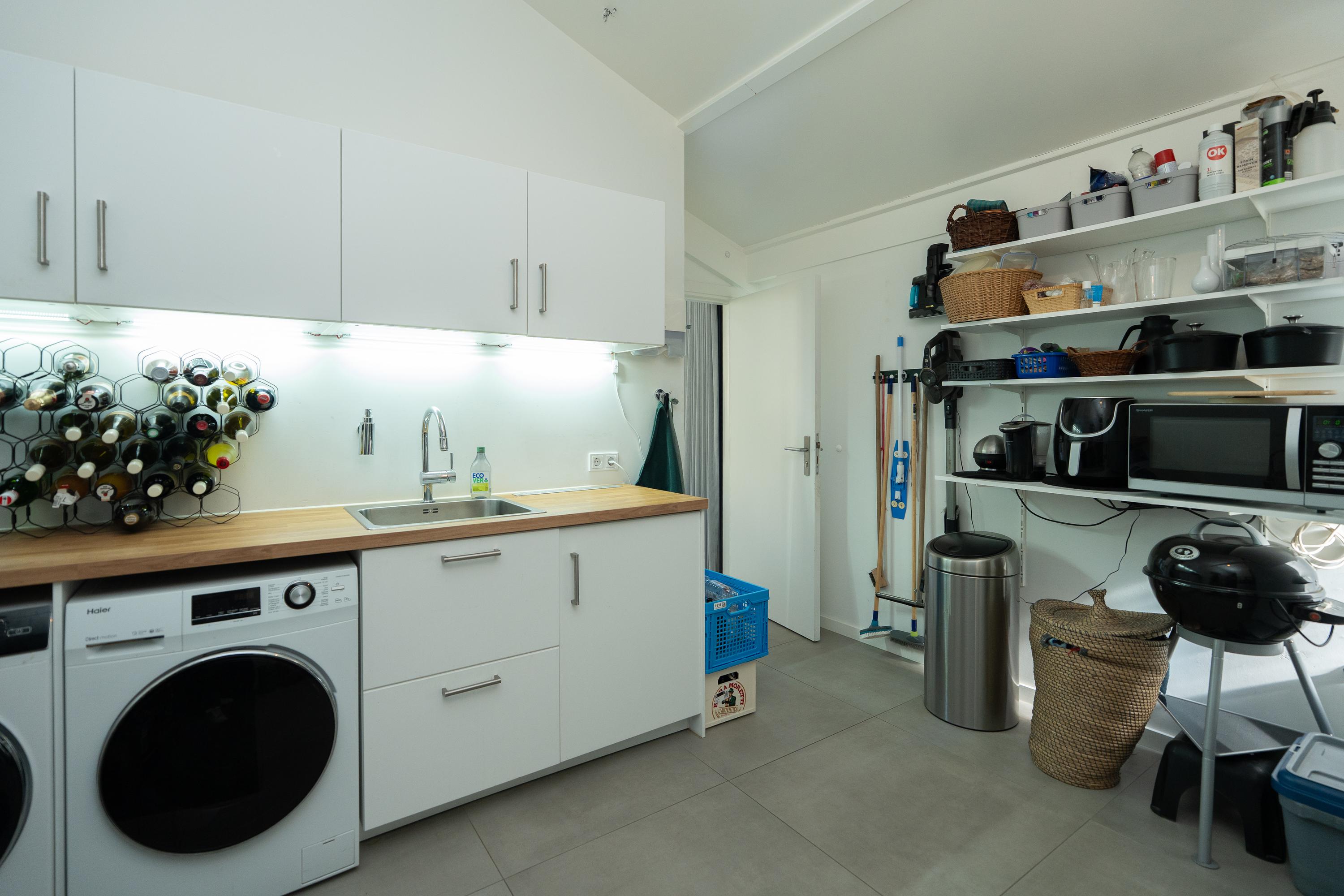 Entree, royale hal die gelijk het ruimtelijke karakter van de woning benadrukt. In de hal bevinden zich de meterkast, vliering en het eerste toilet met fonteintje. Een ruime woonkamer met hoge nok, waar de vele ramen aan alle zijden zorgen voor een prachtige lichtinval en een open sfeer. Zowel aan de voor- als achterzijde zijn er schuifpuien naar de voor- en achtertuin. Verder is er nog een ruime inpandige berging onder de trap en de trapopgang zelf is fraai weggewerkt. Moderne open keuken met een groot kookeiland. De hoge kasten zijn fraai weggewerkt in de muur en de keuken is voorzien van diverse luxe inbouwapparatuur. De bijkeuken is gesitueerd aan de voorzijde van de woning en heeft een keukenblok, opstelling van de warmtepomp en boiler en een extra buitendeur.