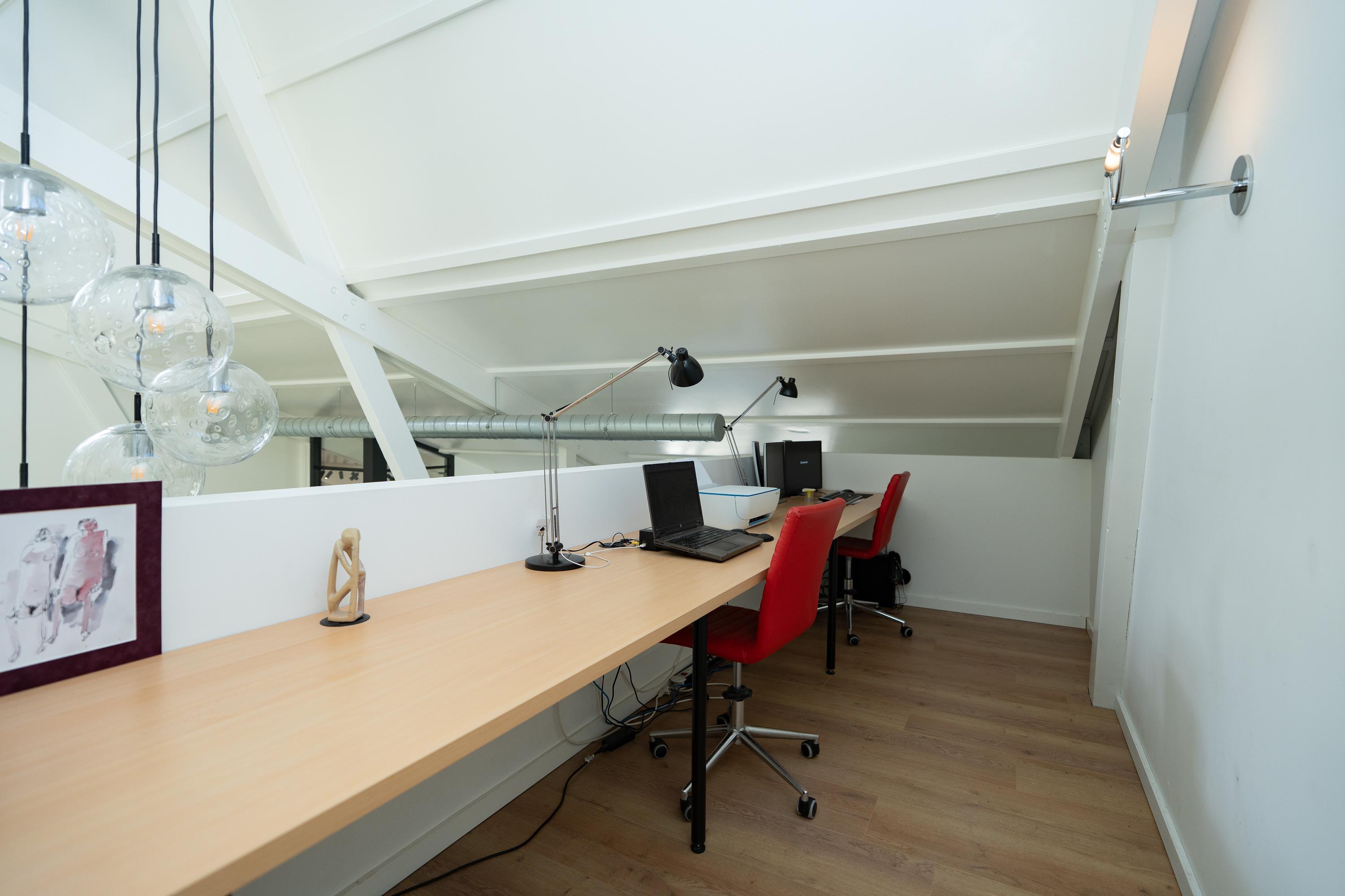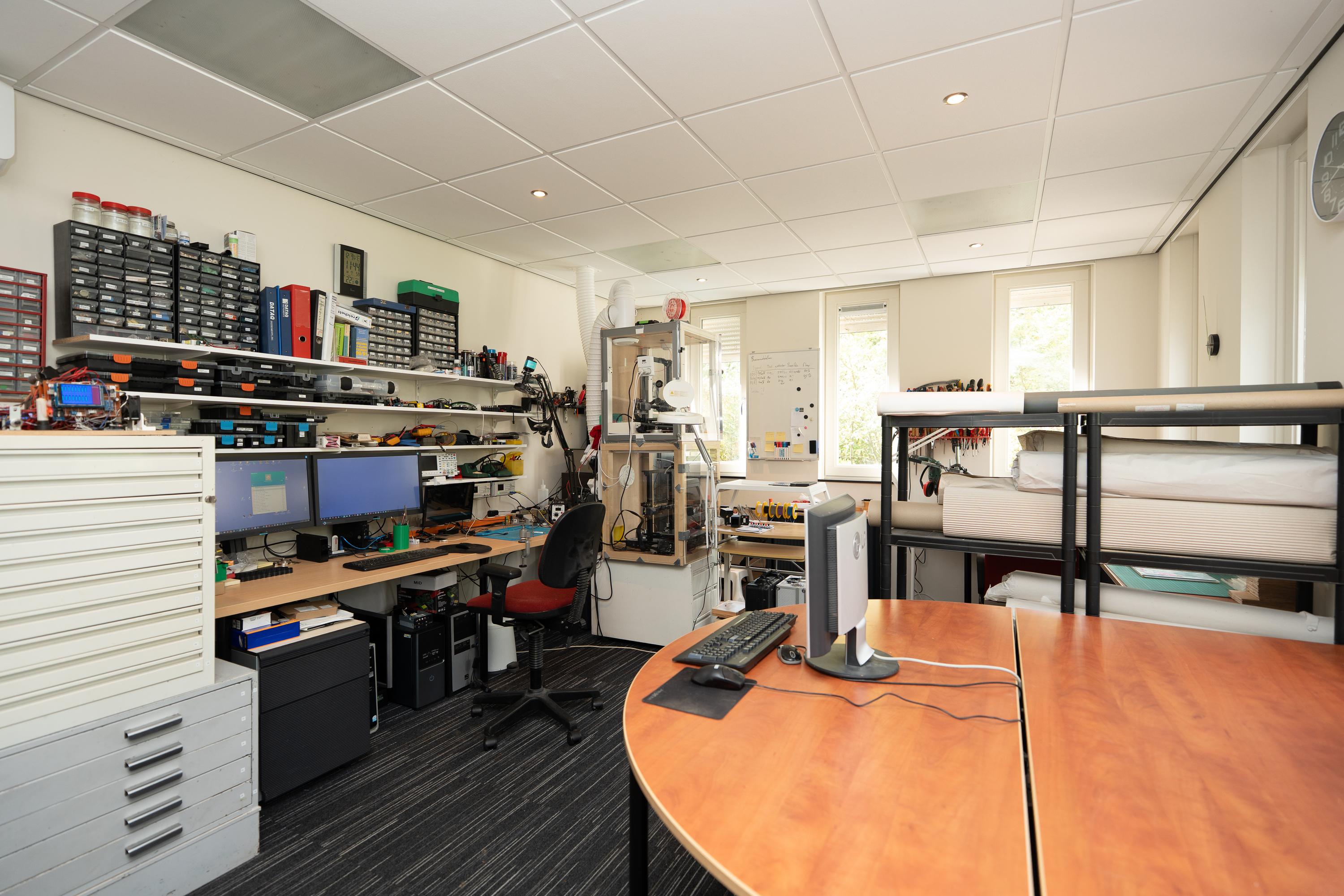 Verder is er nog een aangrenzende kantoorruimte met diverse ethernetaansluitingen, welke nu in gebruik is als hobbyruimte. Deze kantoorruimte heeft een eigen toegang en oprit aan de achterzijde van het geheel. Vanuit de hal is er toegang tot de keuken en het toilet. Er is tevens een eigen meterkast.