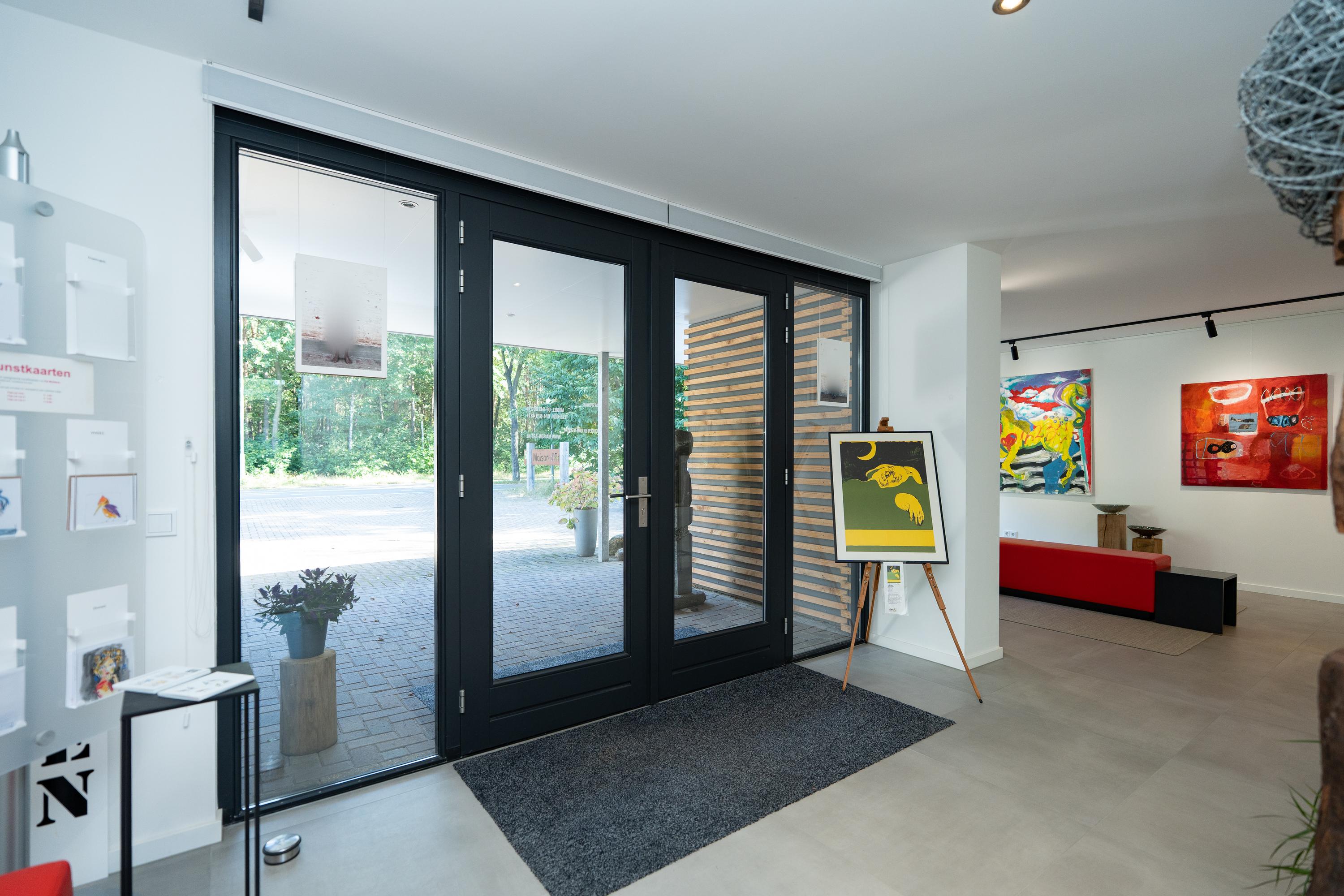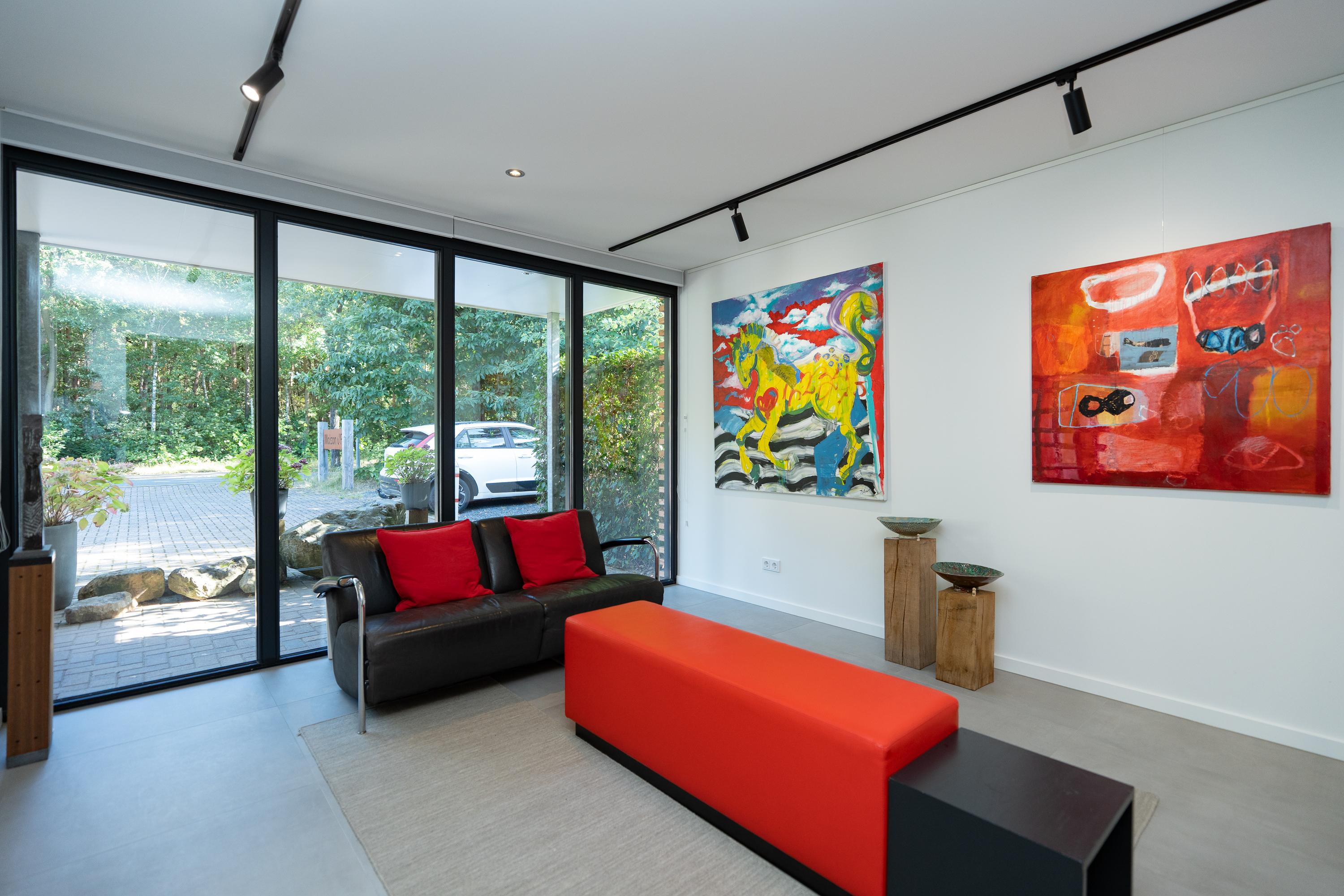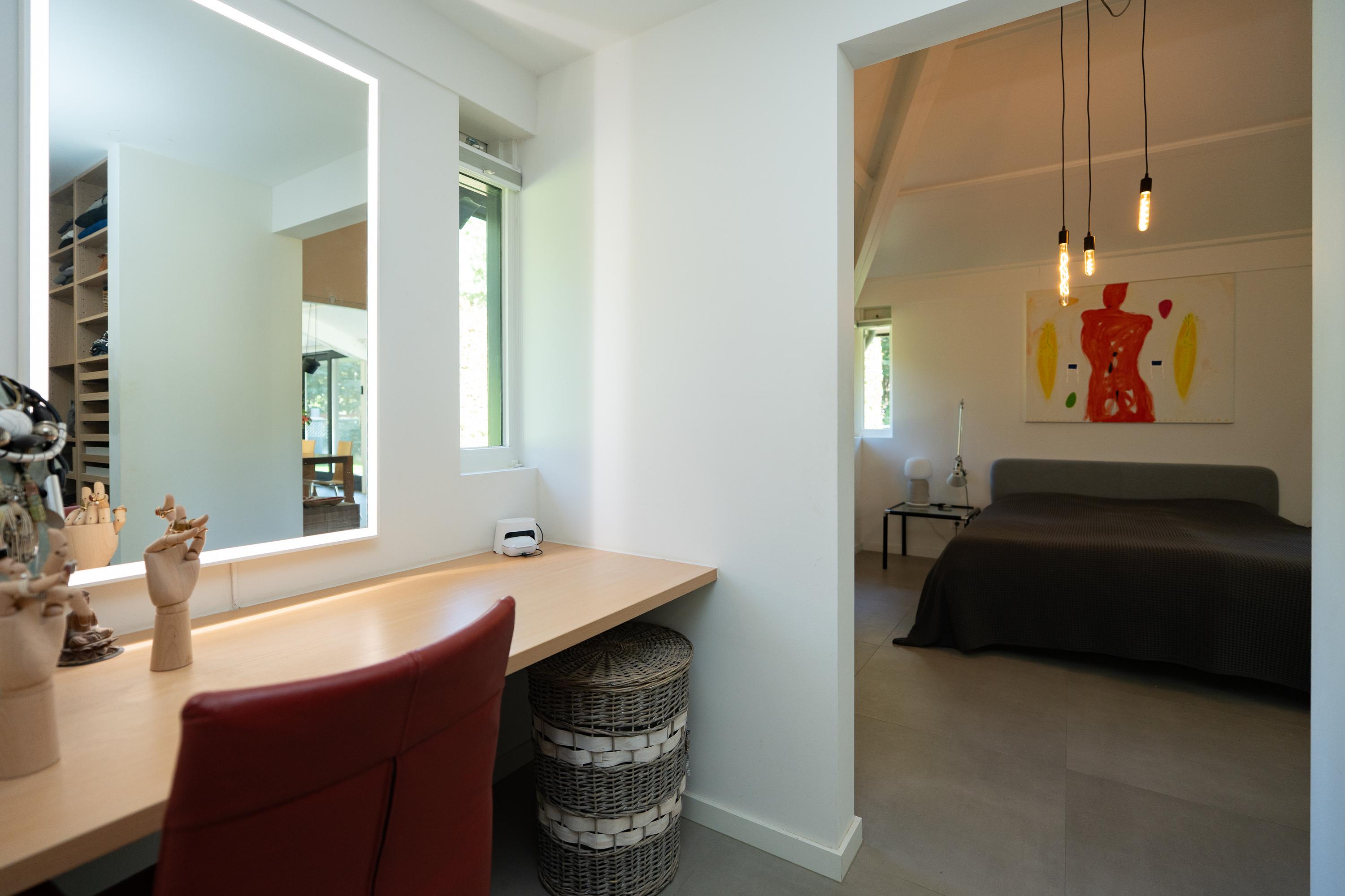 Vanuit de studeerkamer is de multifunctionele atelierruimte te bereiken. Deze ruimte heeft openslaande deuren aan de voor- en achterzijde met een omheind terras en beschikt over een eigen keuken en badkamer. De keuken is voorzien van diverse inbouwapparatuur en de badkamer heeft een inloopdouche, dubbele wastafel en een toilet.