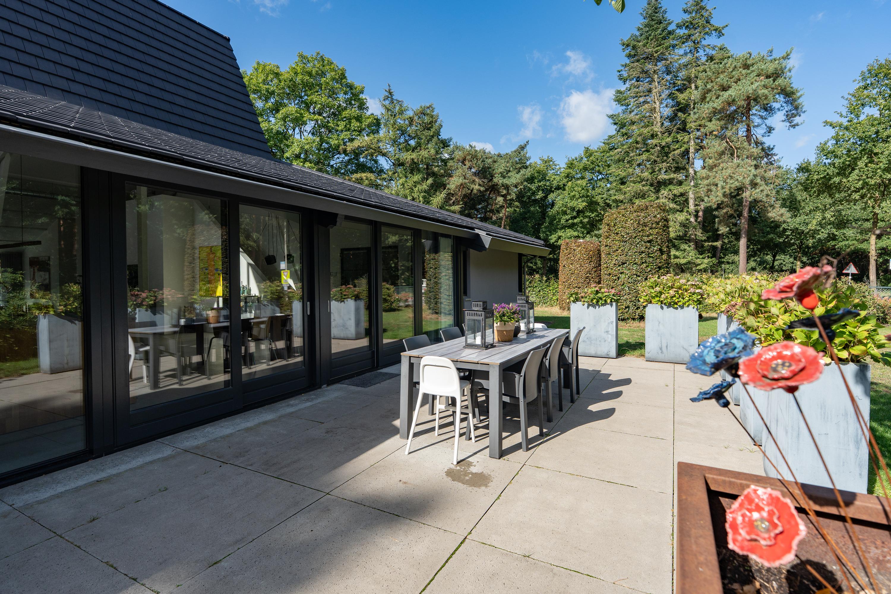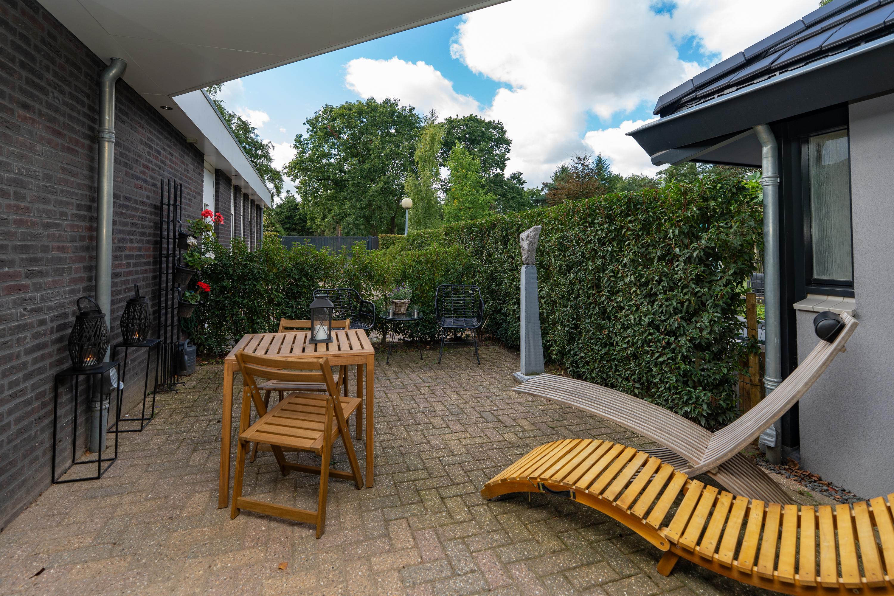 Rondom de woning ligt een verzorgde voor, zij en achtertuin, ingericht met meerdere terrassen waardoor op elk moment van de dag een fijne plek in de zon of schaduw te vinden is. Ook is er nog een extra berging. De omheinde zwemvijver is een echte blikvanger en geeft de tuin een bijzondere uitstraling. Op eigen terrein is bovendien ruime parkeergelegenheid aanwezig.