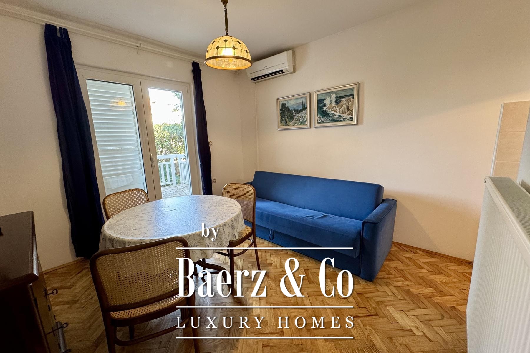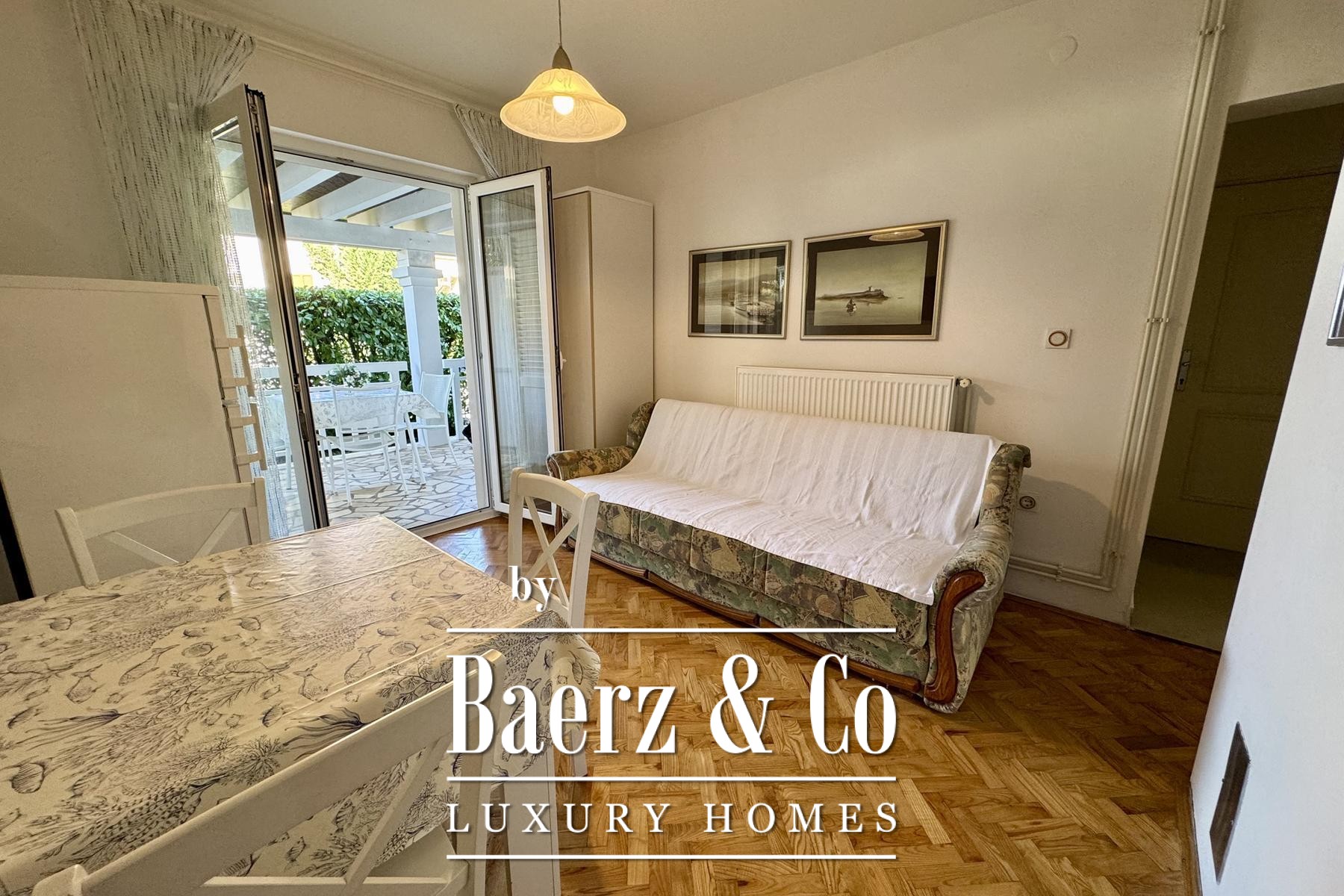 apartment consists of a bedroom, bathroom, kitchen, living room and terrace.Another additional apartment is located in the basement of the house and has two bedrooms, a kitchen, a bathroom and a storage room.There is also a garage in the yard of the house, and the garden itself is full of beautiful Mediterranean plants.Four more cars can be parked in the yard.For any additional information, feel free to contact us!