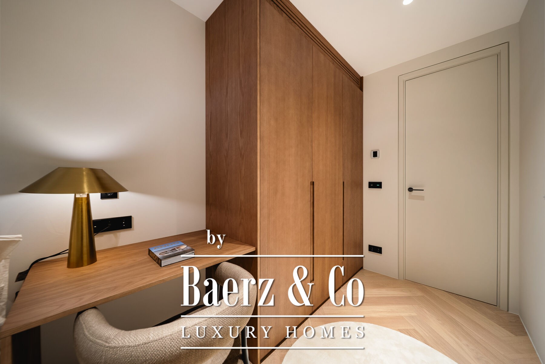 The home features top-tier finishes: Gaggenau and Siemens appliances, Dornbracht bathrooms, BOEN herringbone wood floors, underfloor heating, and smart home automation. Custom design details echo the building’s iconic round architecture, blending Mediterranean charm with contemporary elegance.