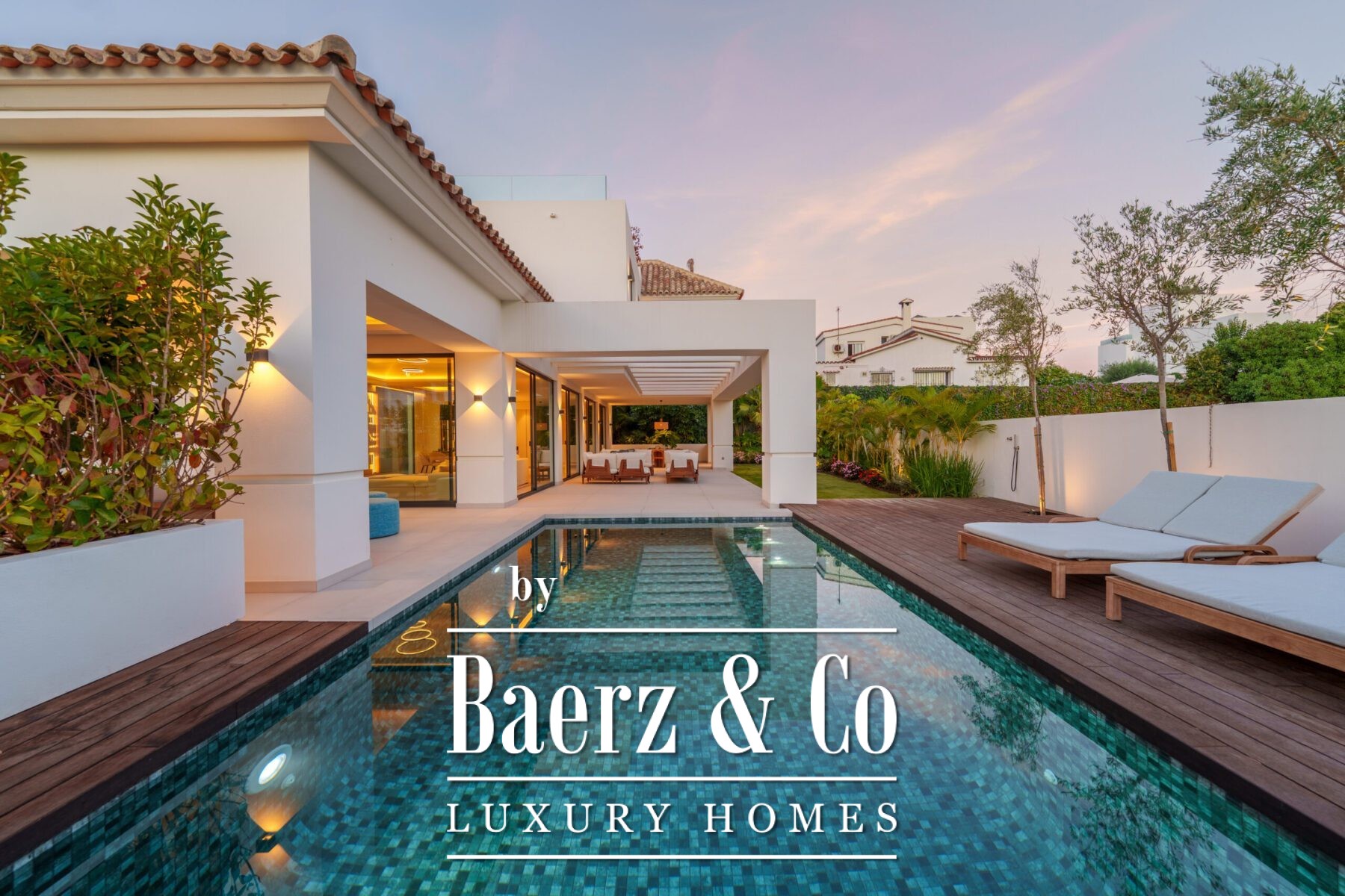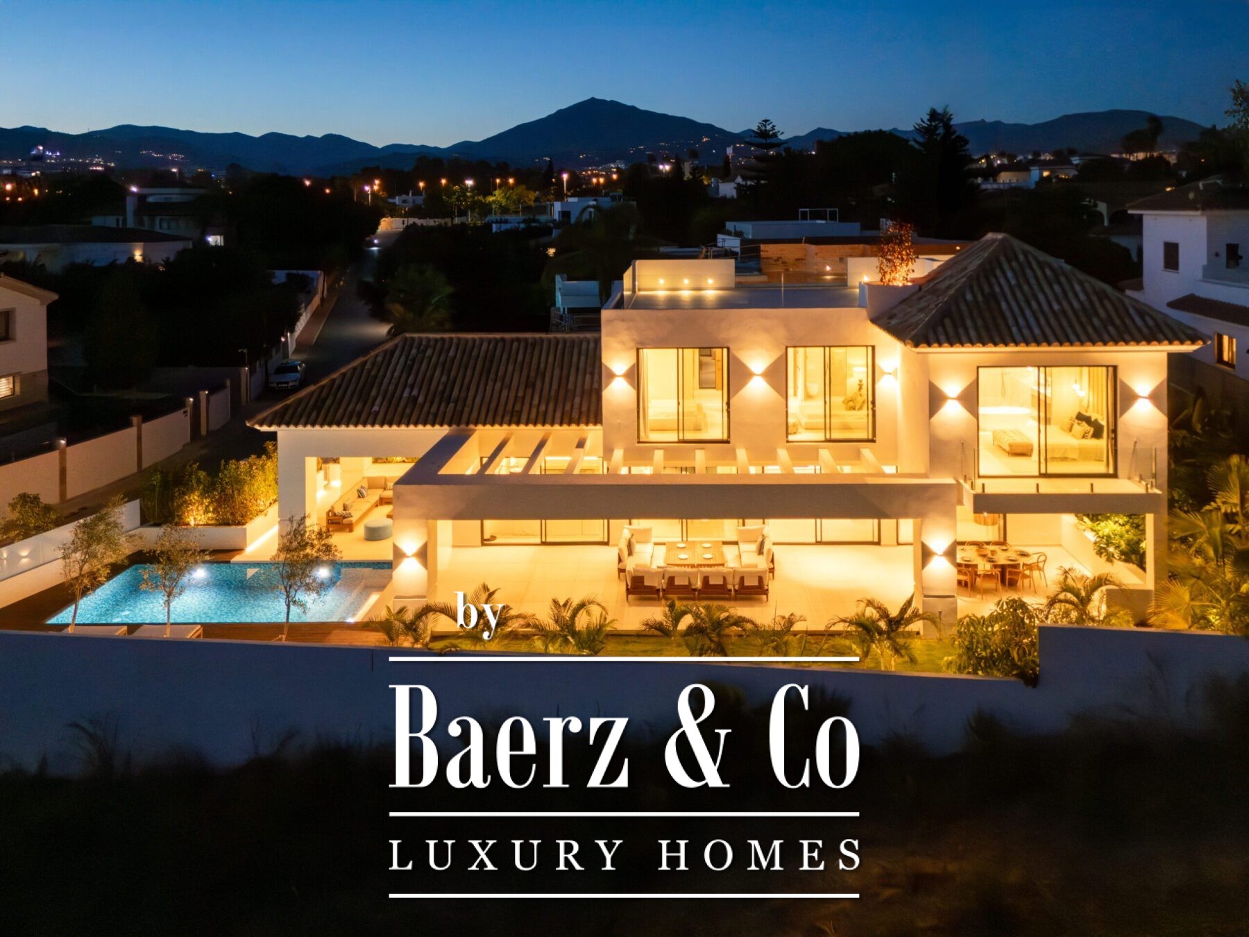 Deze eigentijdse villa in Marbella biedt een ingetogen toevluchtsoord in de gewilde wijk San Pedro de Alcántara, waar privacy en heldere architectuur het dagelijks leven vormgeven. Achter strakke witte gevels en zorgvuldig aangelegde begroeiing ontvouwt zich een woonruimte van 446 m², een weelderige oase met een privézwembad, houten terras en royale overdekte terrassen die uitnodigen tot dineren en ontspannen. Het dakterras vangen de essentie van zorgeloos kustleven en creëren ruimte voor zowel ontmoetingen als stille momenten.