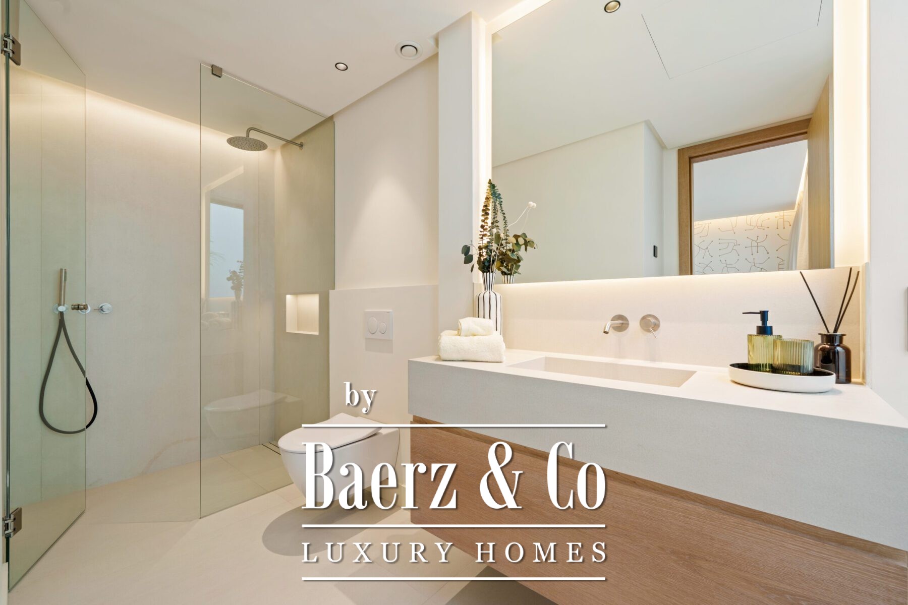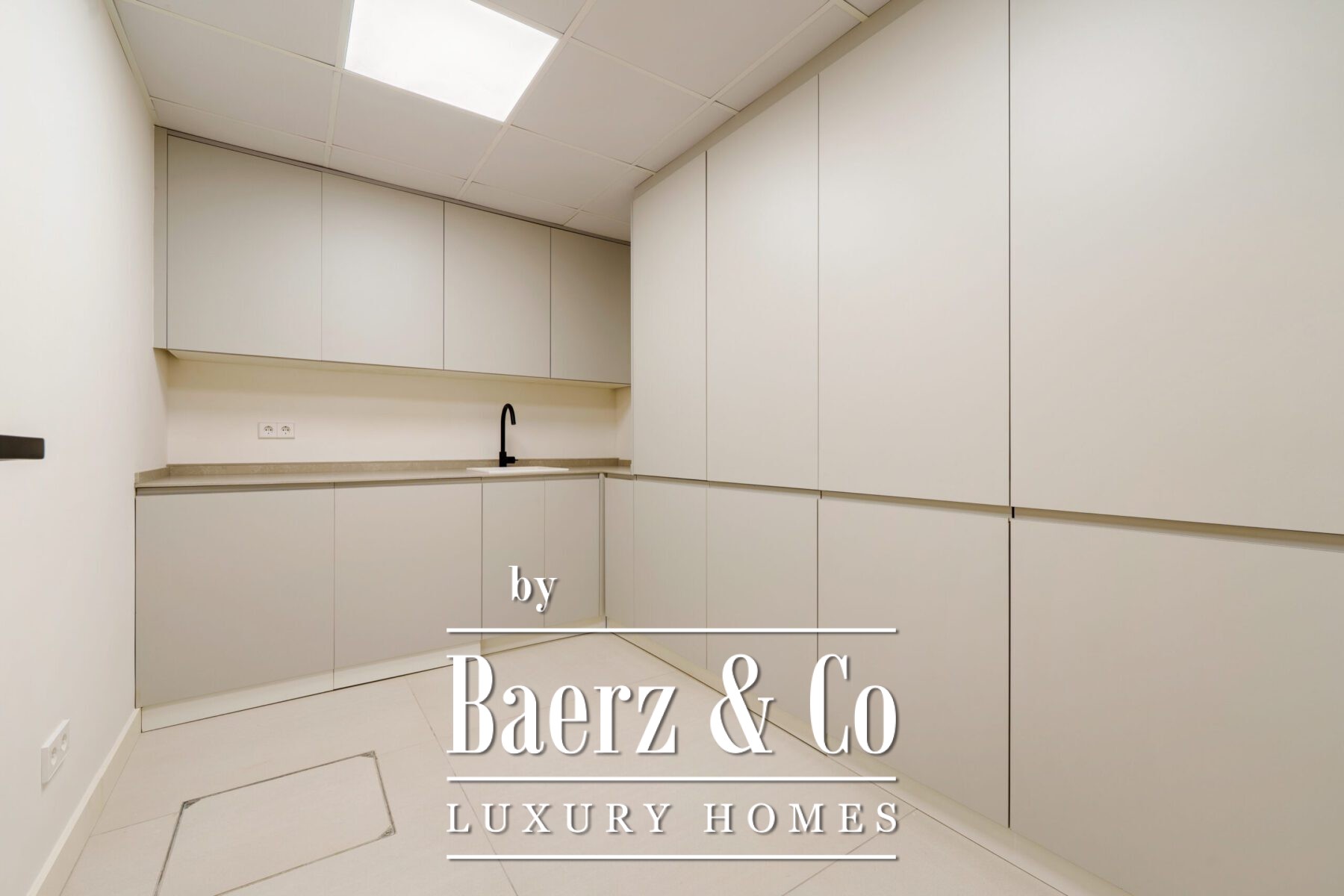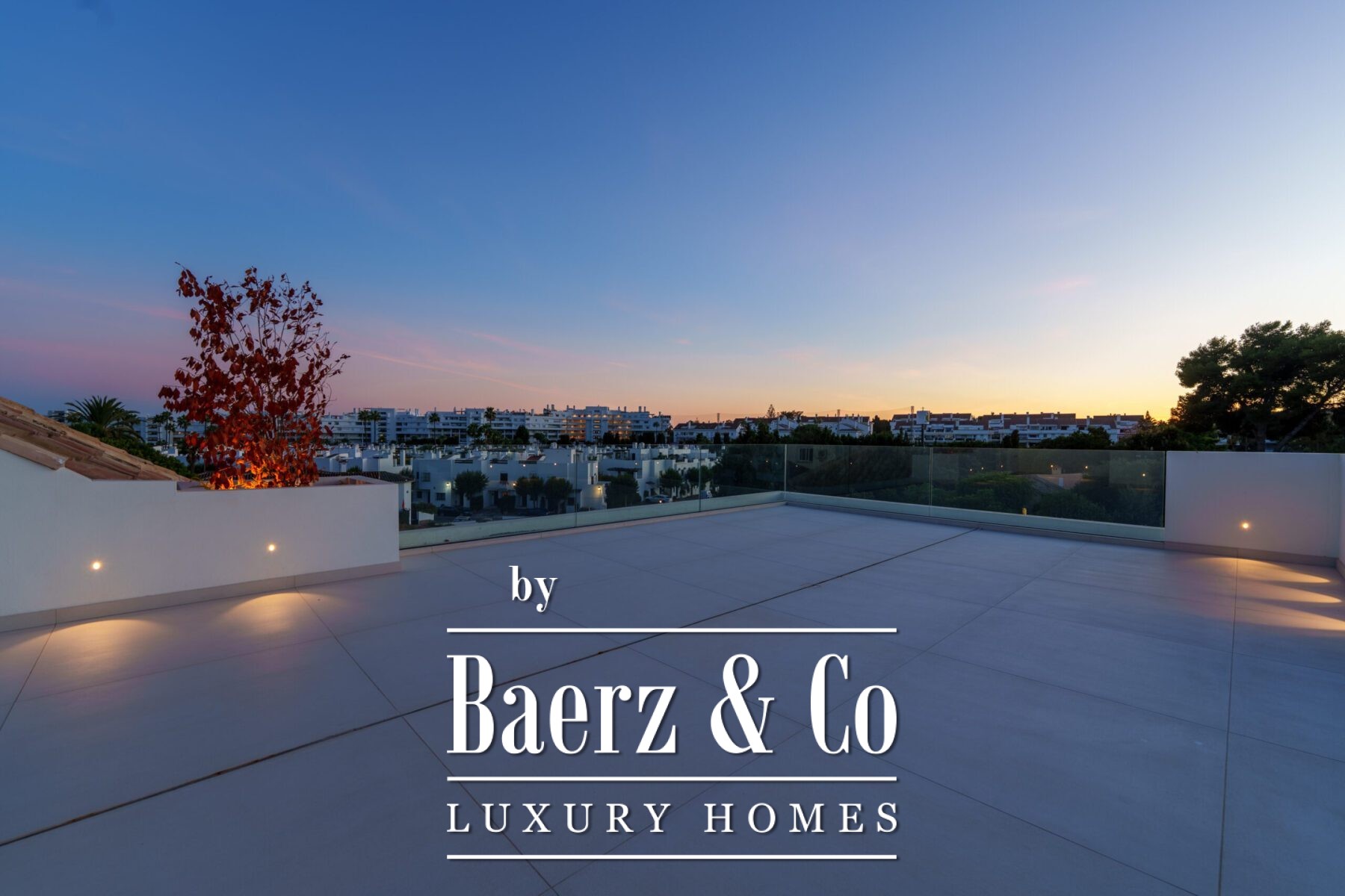 Het interieur ademt licht en sereniteit, met zachte neutrale tinten, subtiele inbouwverlichting en royale raampartijen van vloer tot plafond die het Andalusische licht binnenlaten. De open leef- en eetruimte, voorzien van een op maat gemaakte entertainmentwand en moderne afwerking, loopt naadloos over in de hoogwaardige keuken waar een houten kookeiland en geïntegreerde apparatuur samengaan met strak vormgegeven kasten. Deze vloeiende ruimte-ervaring zet zich voort in de eetkamer, ideaal voor betekenisvolle samenzijn.