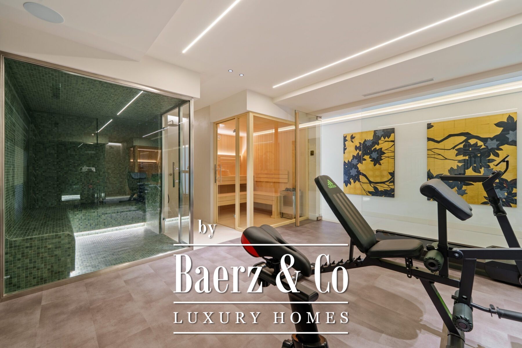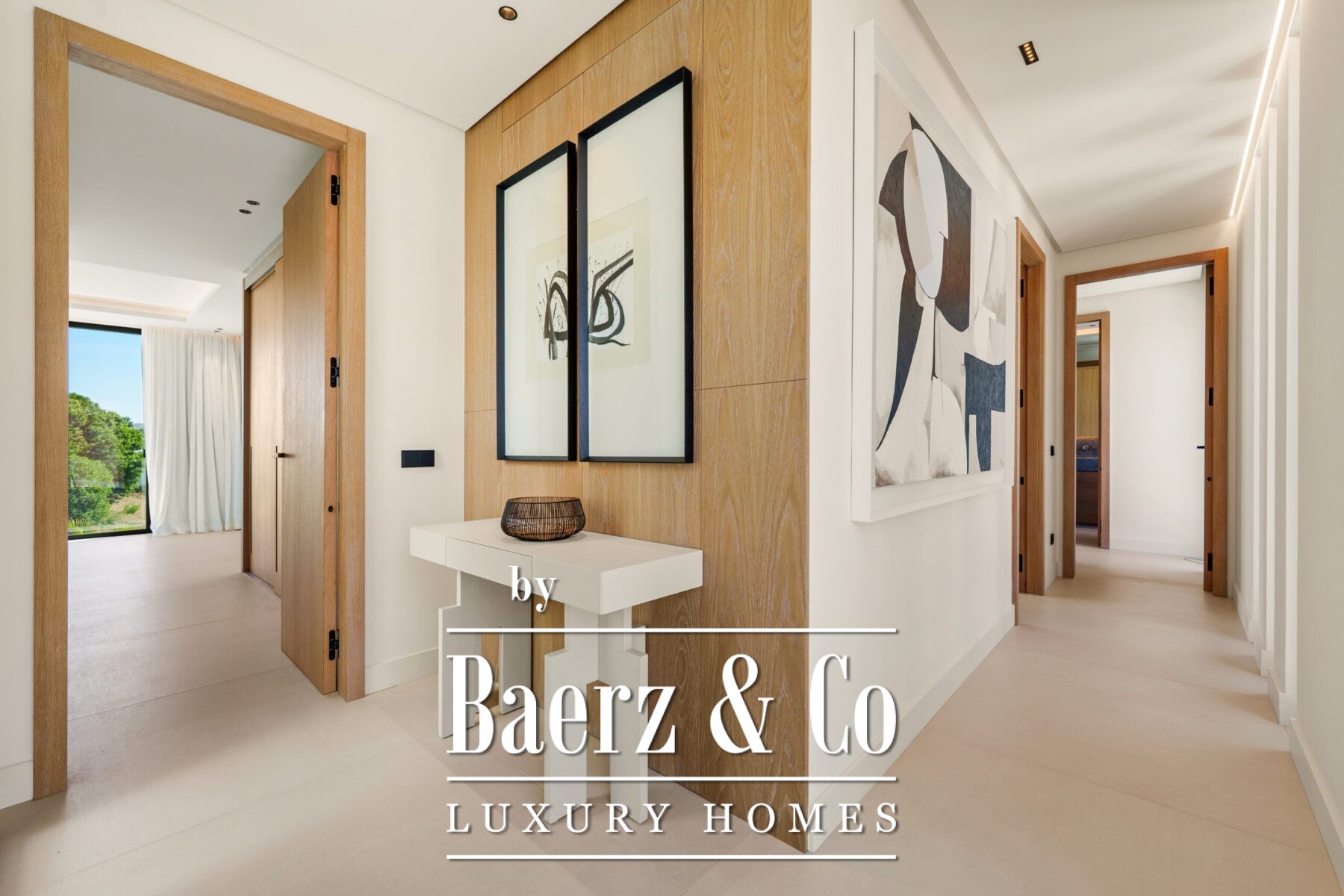 Vijf serene slaapkamers bieden direct toegang tot het terras en zijn ieder voorzien van een en-suite badkamer met marmeren afwerking, zwevende wastafels en vrijstaande baden. De mastersuite onderscheidt zich door zijn royale omvang en een zonnig privéterras, perfect als rustige schuilplaats. Op de benedenverdieping bevindt zich een volledig uitgeruste fitnessruimte, glazen sauna en stoombad voor een persoonlijke wellnessbeleving. Een beveiligde garage, luxe entree en uitzicht op de bergen geven verdere verfijning aan dit perceel van 612 m², waarmee het moderne comfort zich op steenworp afstand bevindt van Marbella’s golfbanen, stranden en lokale voorzieningen. Deze luxe villa te koop in Marbella vertegenwoordigt een verheven benadering van eigentijds mediterraan wonen.