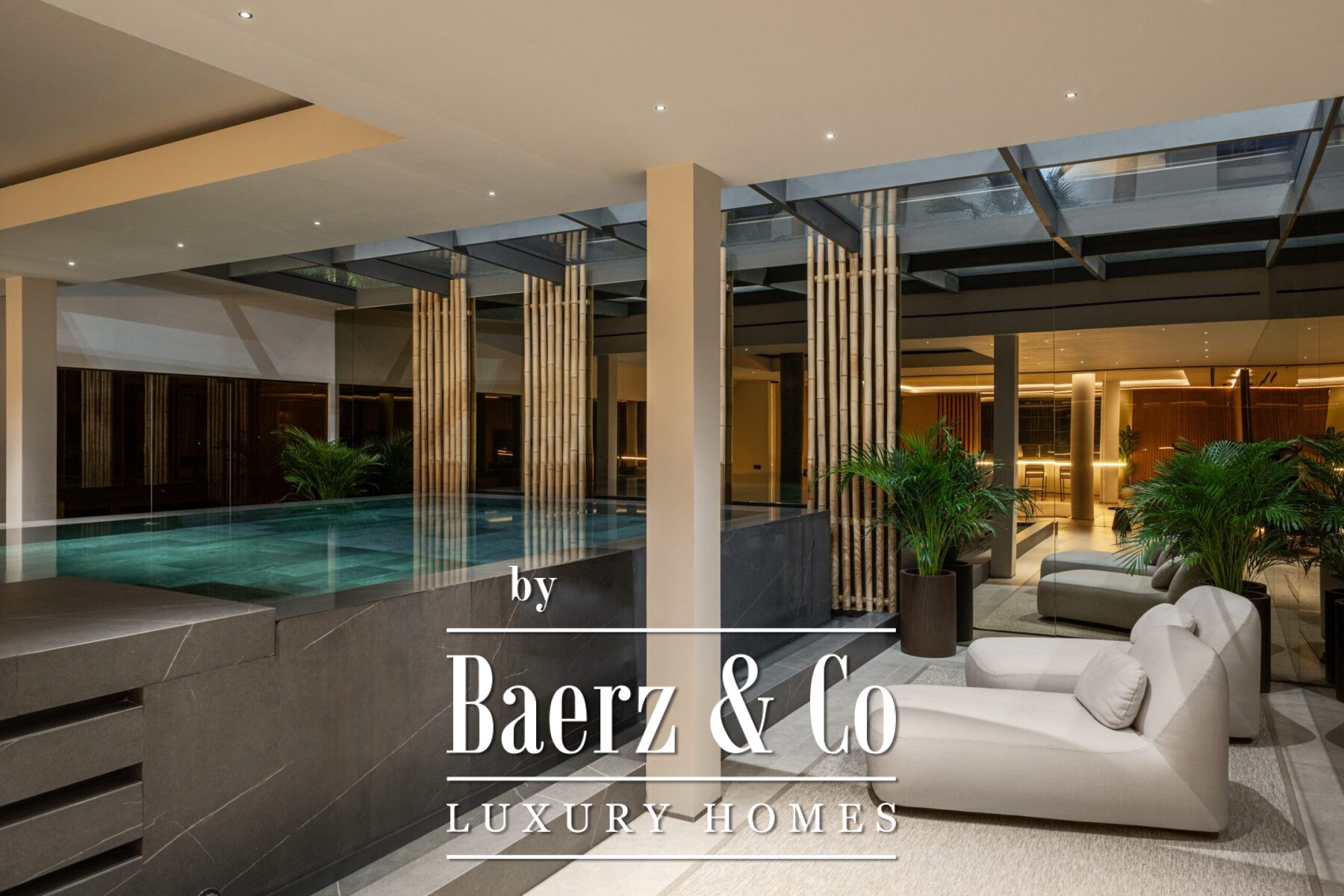 Binnen biedt het pand zes slaapkamers en zeven badkamers, verbonden door exclusief meubilair en natuurlijke, verfijnde materialen. De interieurs worden gekenmerkt door symmetrie en een naadloze overgang van binnen naar buiten. Grote schuifpanelen en royale raampartijen laten het licht en het landschap overvloedig binnenstromen, terwijl geïntegreerde verlichting en zorgvuldig gekozen texturen zorgen voor een sfeer van ingetogen verfijning.