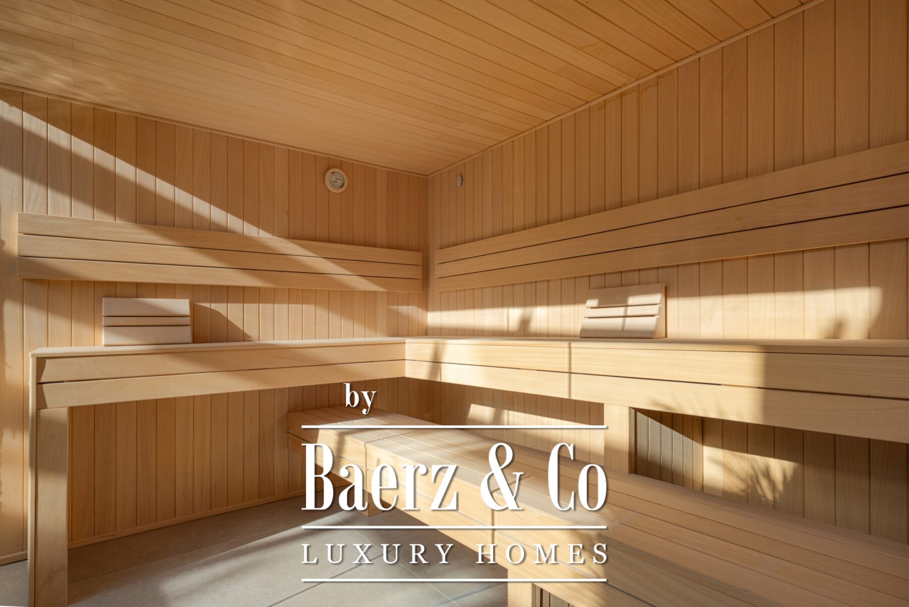 De open keuken grenst aan de eet- en woonkamer en is uitgerust met hoogwaardige apparatuur en maatwerk afwerkingen. Elke ruimte profiteert van doordachte zichtlijnen en directe toegang tot de fraai aangelegde terrassen. Het hoofdterras loopt over in een infinity pool met uitzicht op de golfbaan, voorzien van een verzonken lounge, een volledig uitgeruste BBQ-zone en meerdere plekken voor zowel rust als ontspanning en entertainment.