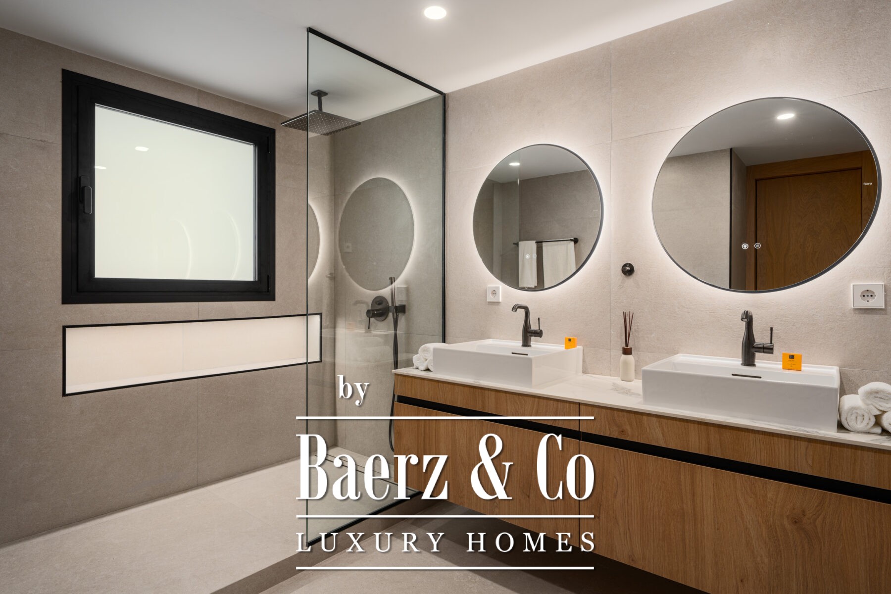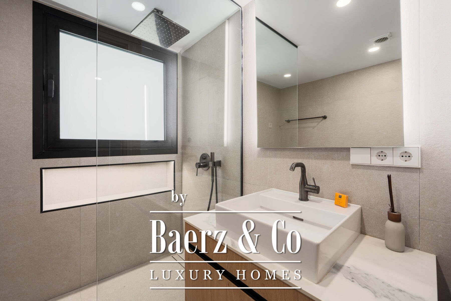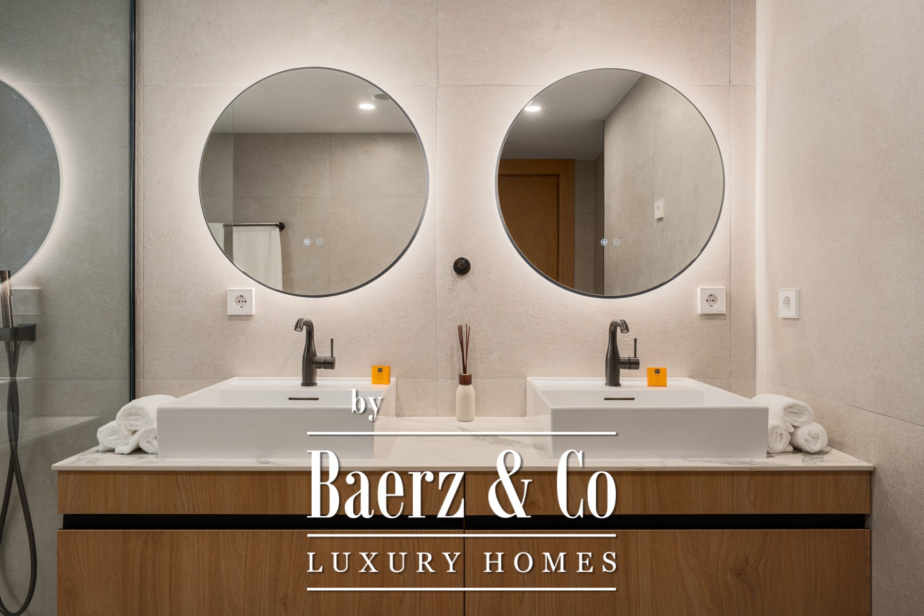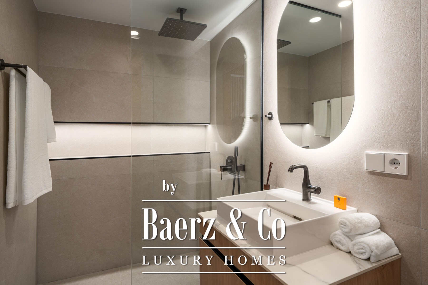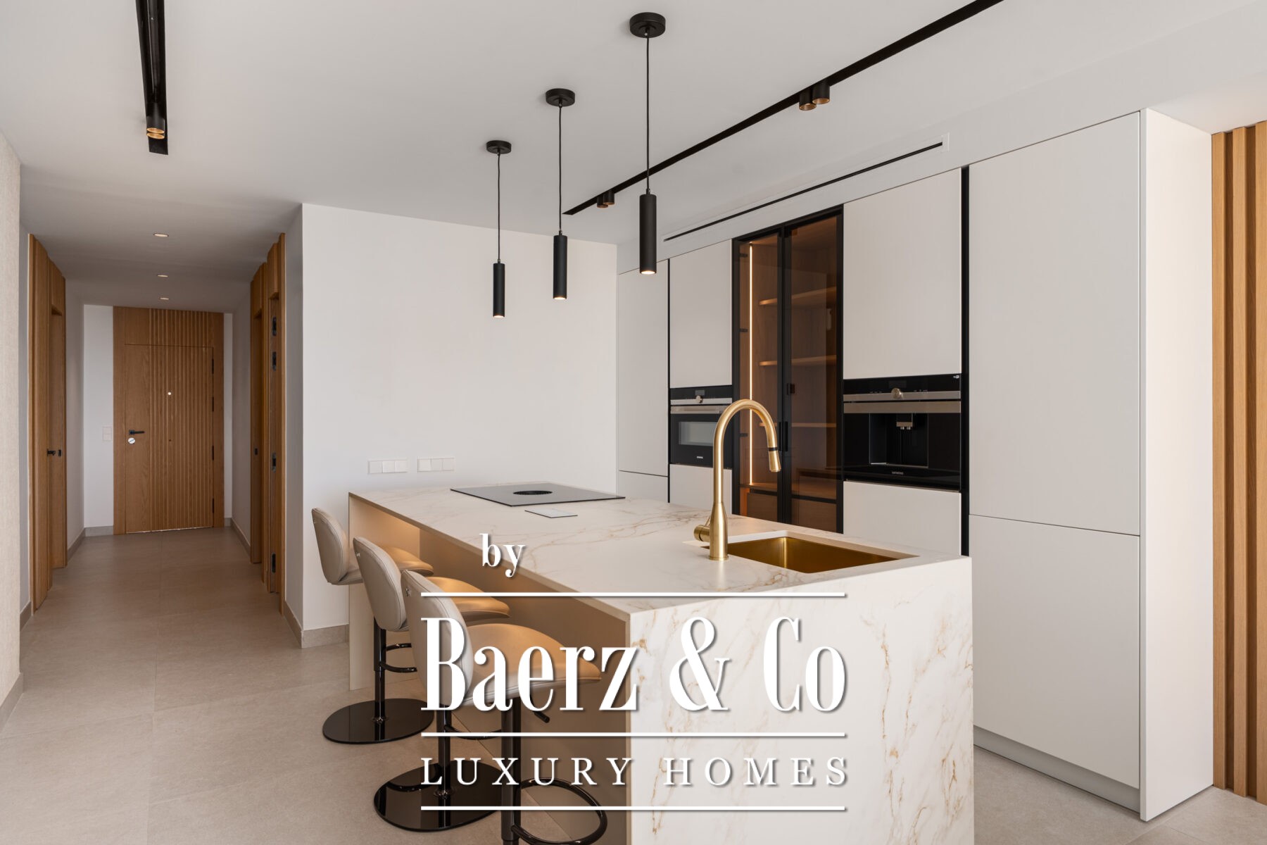 De open keuken, uitgerust met Siemens-apparatuur, vloeit naadloos over in de royale woon- en eetkamer, toegespitst op comfort en gastvrijheid. Zorgvuldig geselecteerde materialen komen overal terug, van Natuzzi-meubilair tot Cavalli-behang, terwijl grote ramen veel daglicht binnenlaten in iedere ruimte. Twee van de drie slaapkamers beschikken over een en-suite badkamer; daarnaast is er een extra badkamer en een gastentoilet. Het appartement is voorzien van een smart home-systeem, directe lifttoegang en praktische opbergoplossingen, wat bijdraagt aan een gevoel van ongecompliceerde rust.