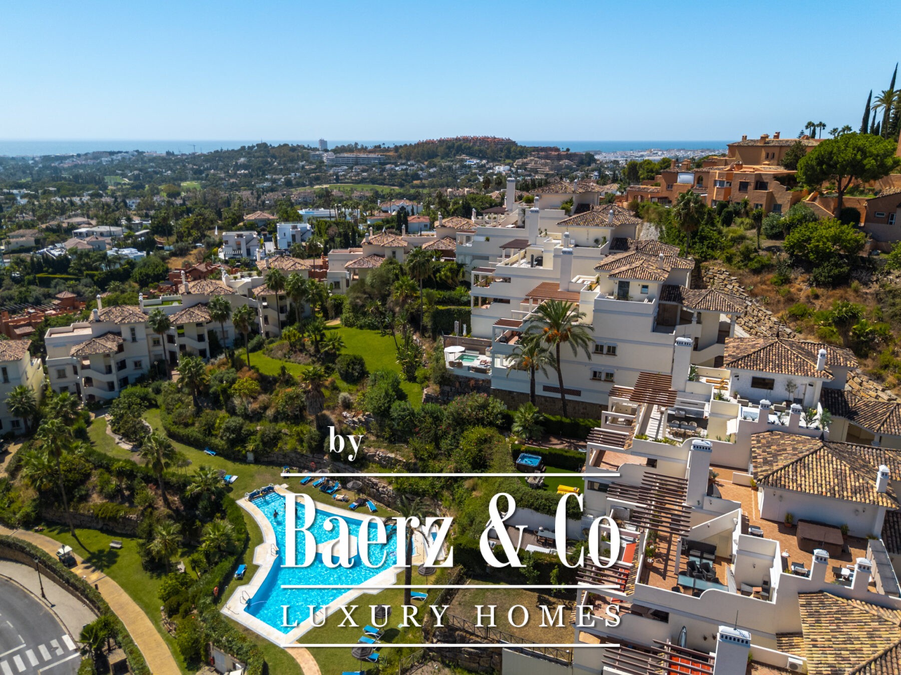 Veiligheid is essentieel, met 24-uursbewaking, een modern alarmsysteem, afgesloten toegang en voorzieningen zoals een eigen garageplek, berging en ruimte voor een golfbuggy. De gemeenschappelijke faciliteiten omvatten een zwembad. Dankzij de ligging bent u dichtbij Marbella’s mooiste stranden, scholen, golfbanen en een zorgvuldig gekozen aanbod van culinaire en winkelervaringen. De zuidoostelijke oriëntatie zorgt de hele dag voor licht en combineert privacy met de levendigheid van de buurt.
