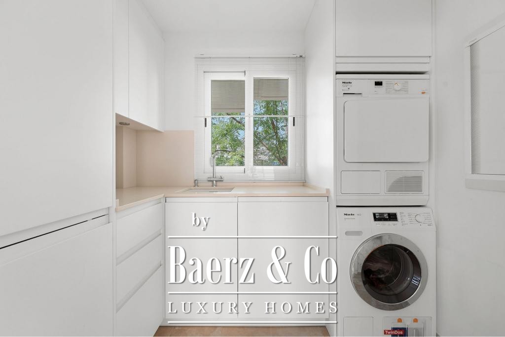 De hoofdverdieping kenmerkt zich door een open ontwerp met een high-end keuken voorzien van premium Gaggenau-apparatuur, een riante woonkamer en een stijlvolle eetruimte. Hoogwaardige houten vloeren, elektrische rolluiken, een geavanceerd alarmsysteem en een lift onderstrepen het samenspel van elegantie en functionaliteit. Twee ondergrondse parkeerplaatsen en twee bergingen verhogen het dagelijkse gemak.