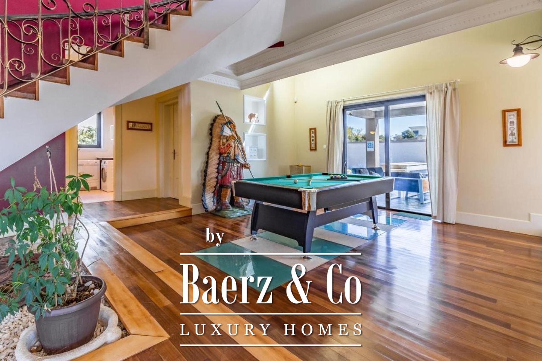 Hoge glazen deuren laten het omliggende landschap in iedere ruimte binnen en openen naar een terras met uitzicht op het zwembad van 60 m², omringd door fraai aangelegde tuinen op het perceel van 900 m². De bovenverdieping biedt drie extra slaapkamers, waarvan een met en suite badkamer, die alle toegang bieden tot een royaal terras. Een aparte recreatieruimte tilt het wooncomfort naar een hoger niveau.